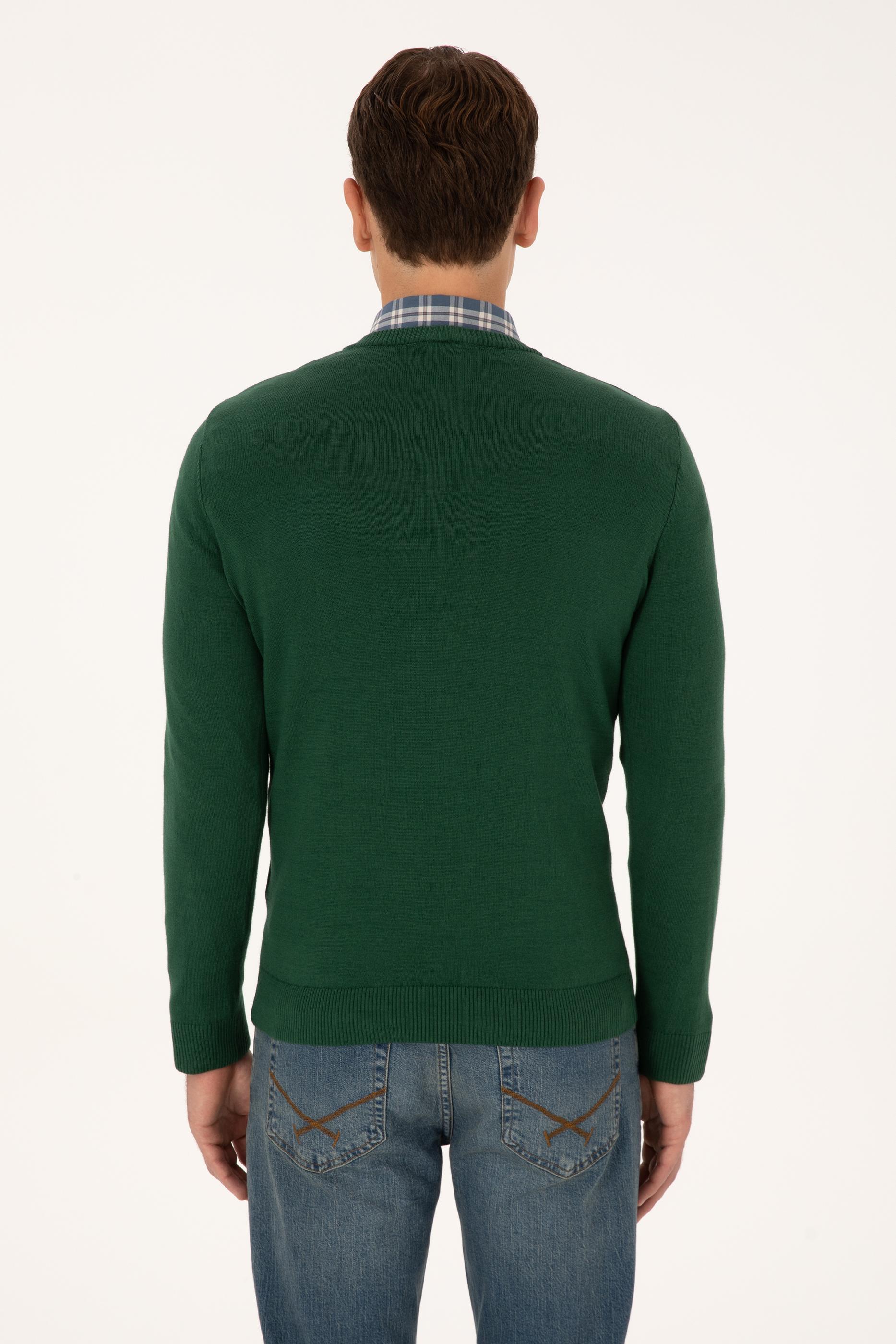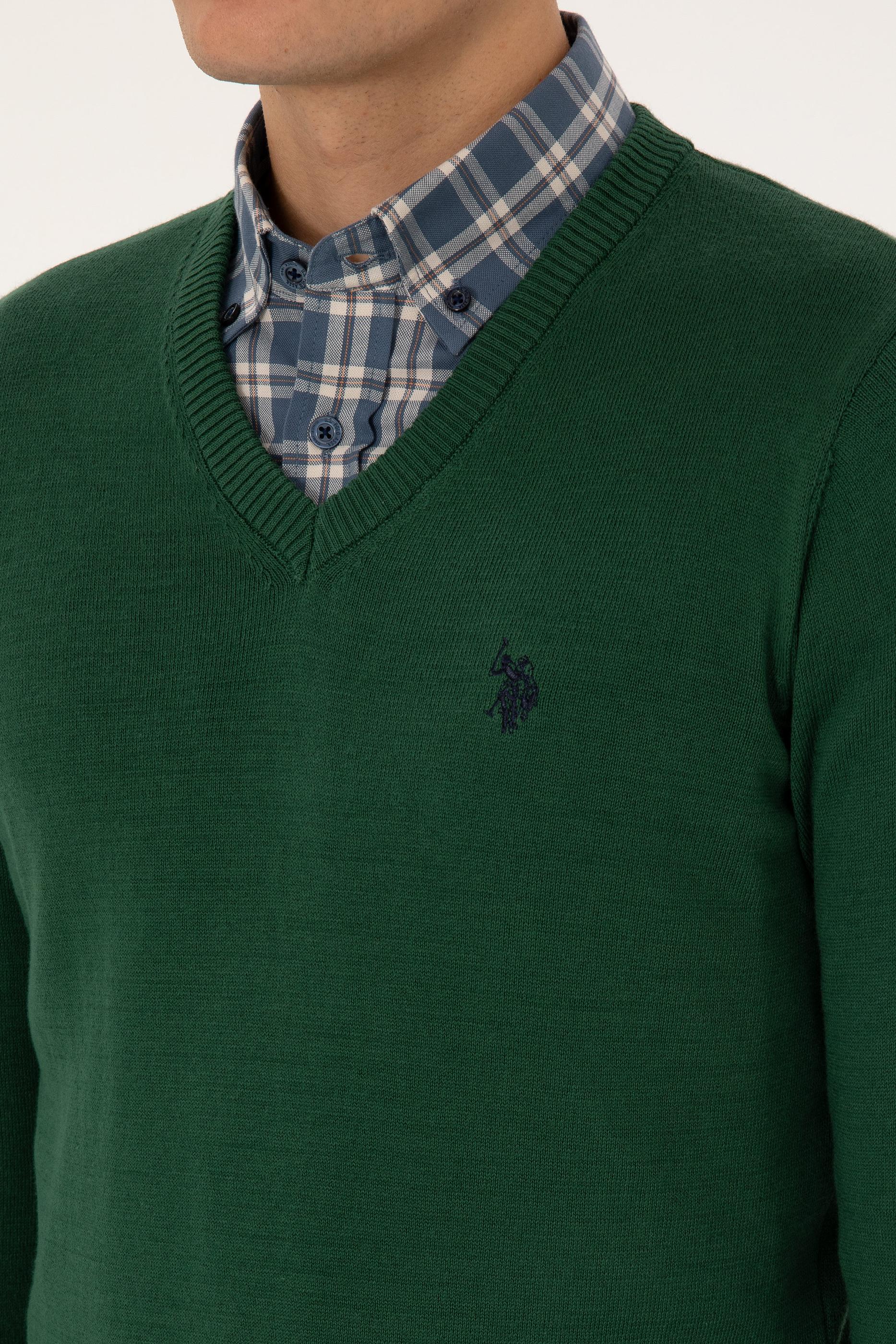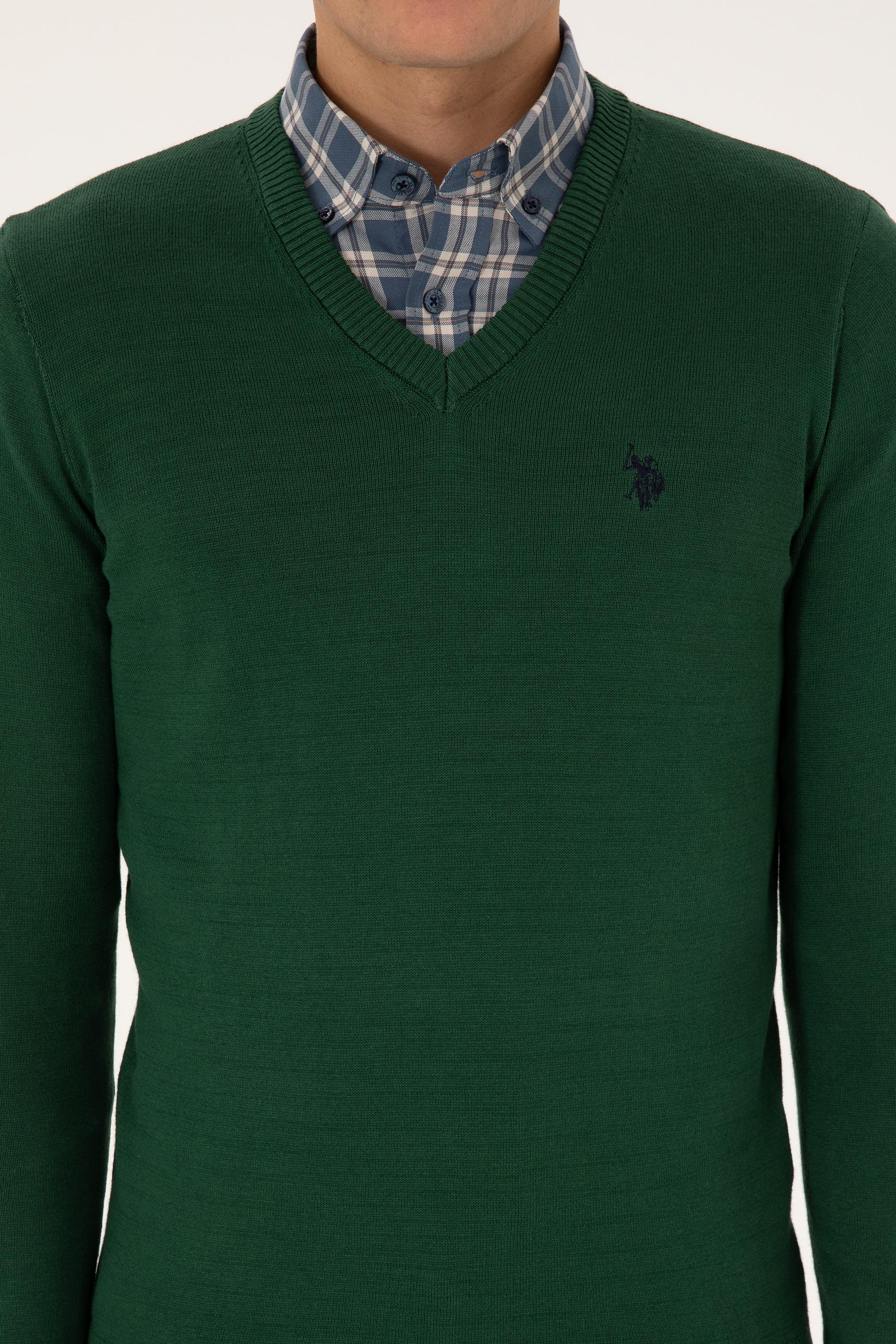 - Erkek Slim Fit V Yaka Koyu Yeşil Basic Triko Kazak