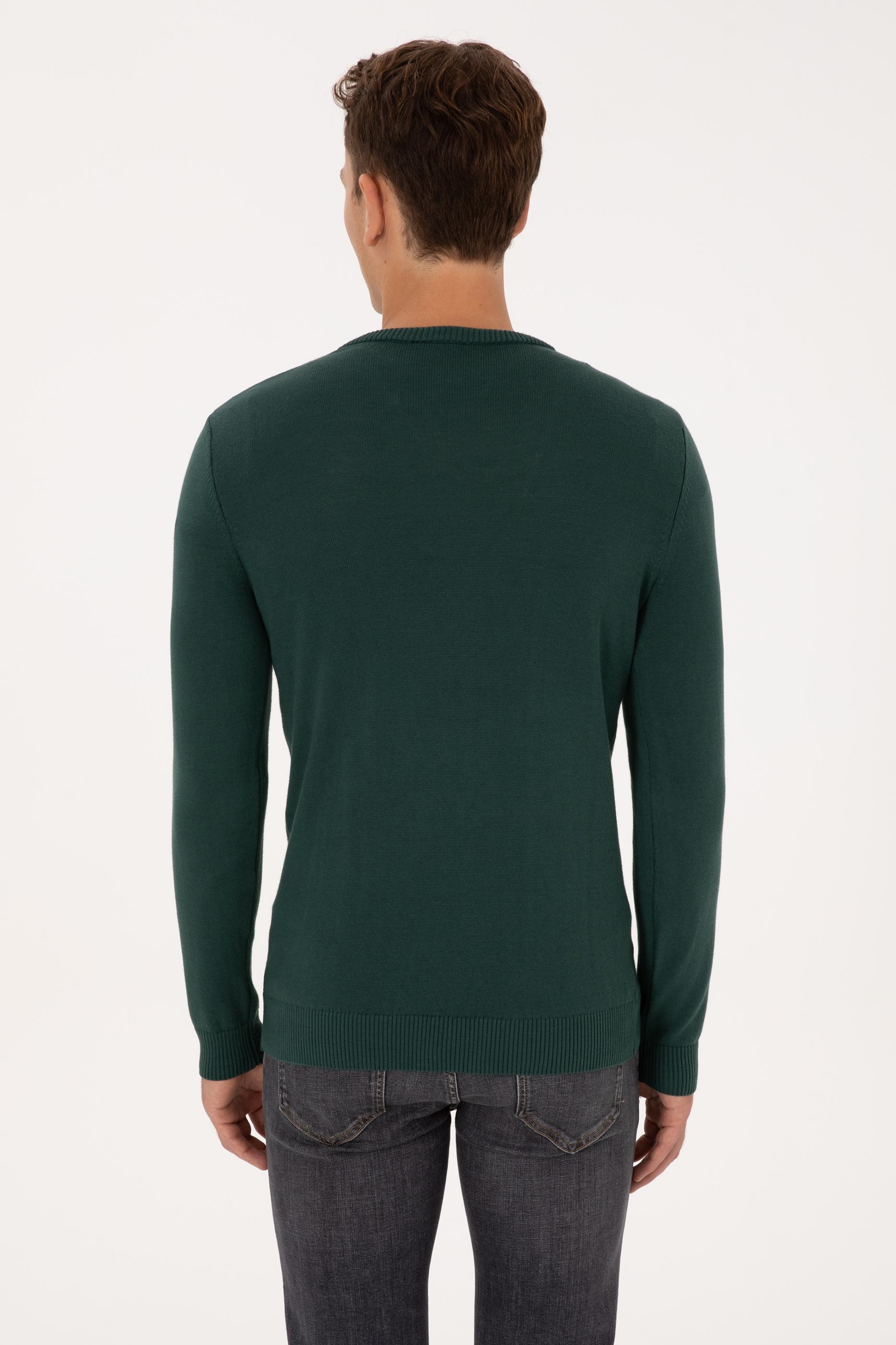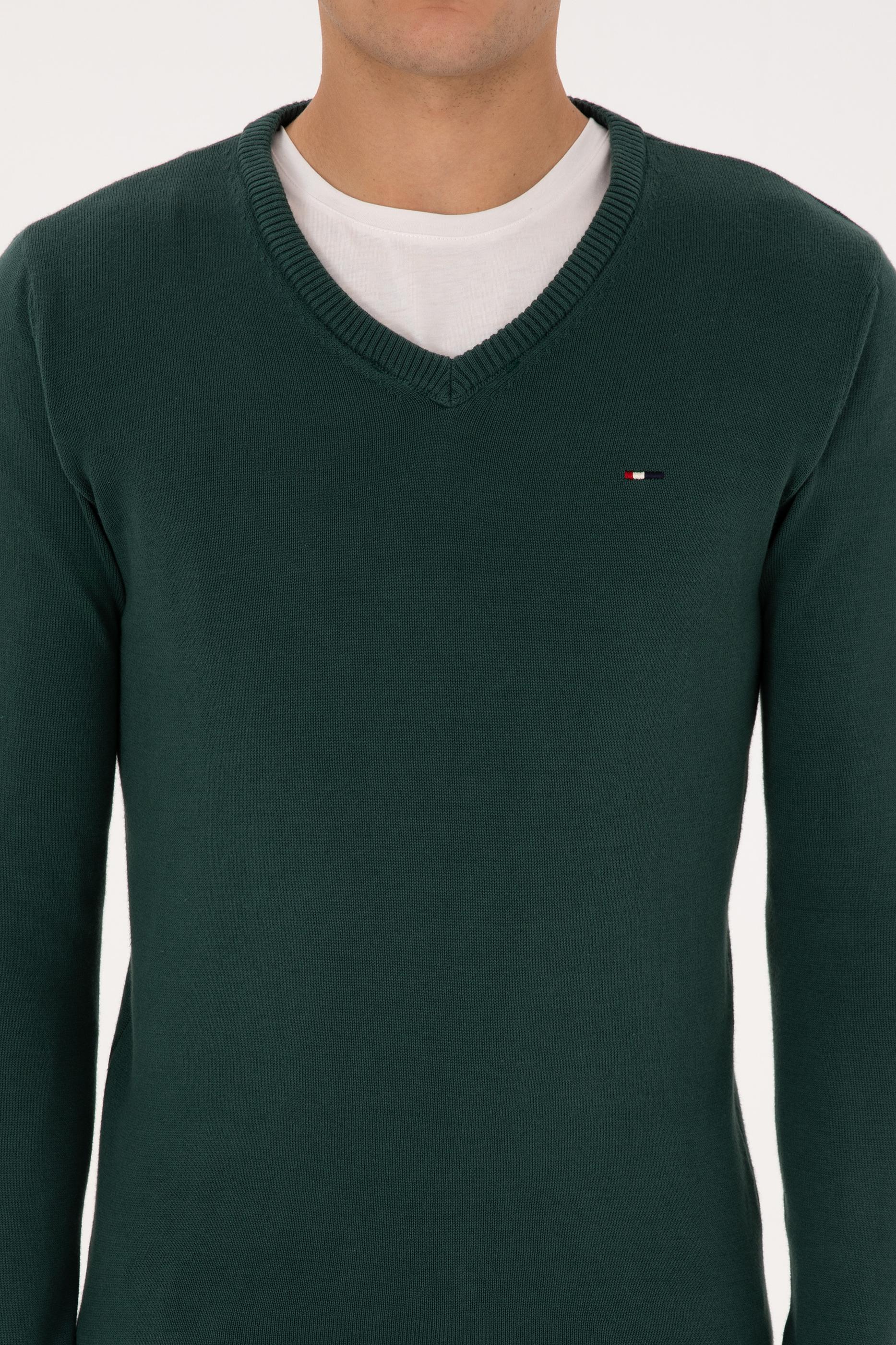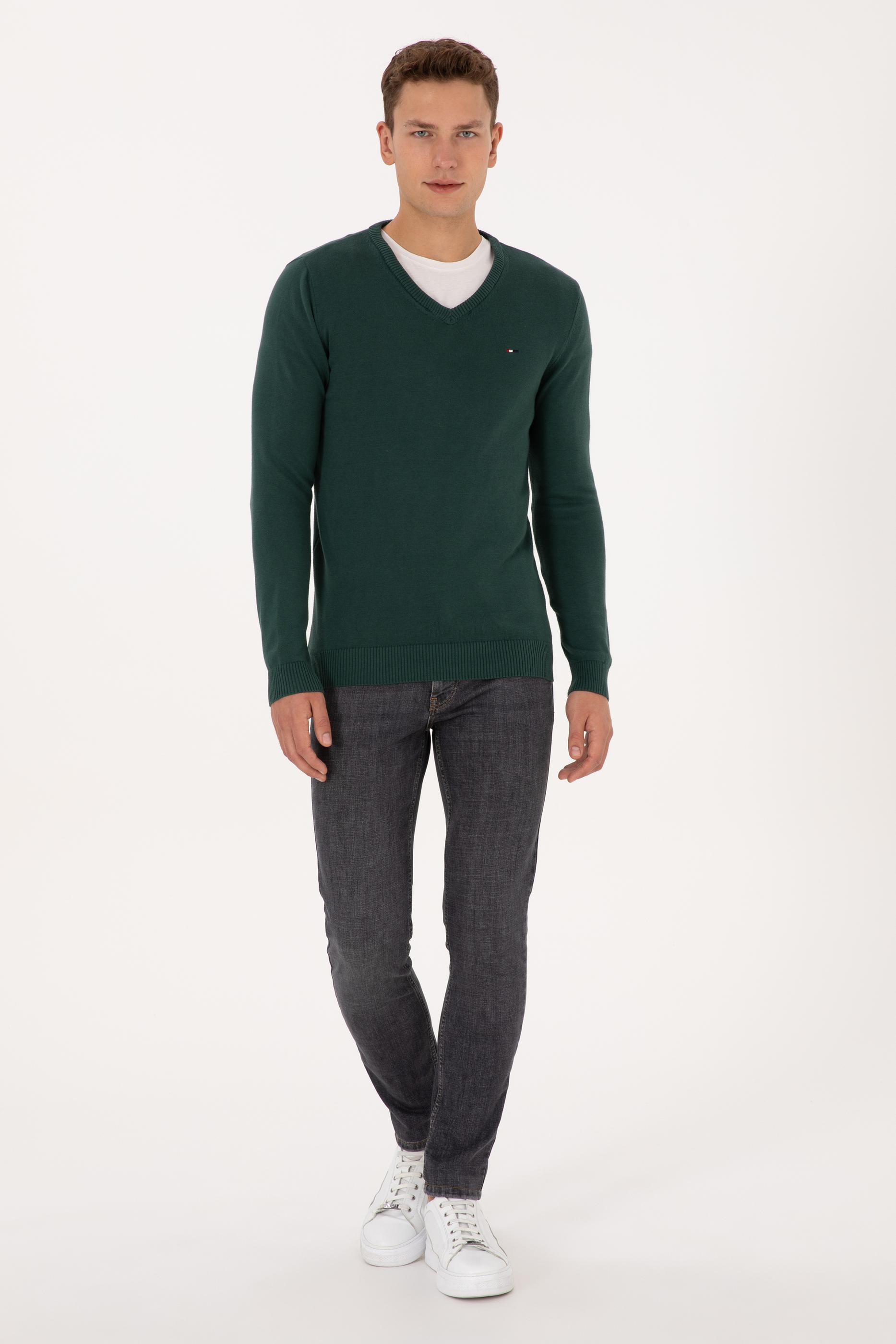 - Erkek Slim Fit V Yaka Koyu Yeşil Basic Kazak