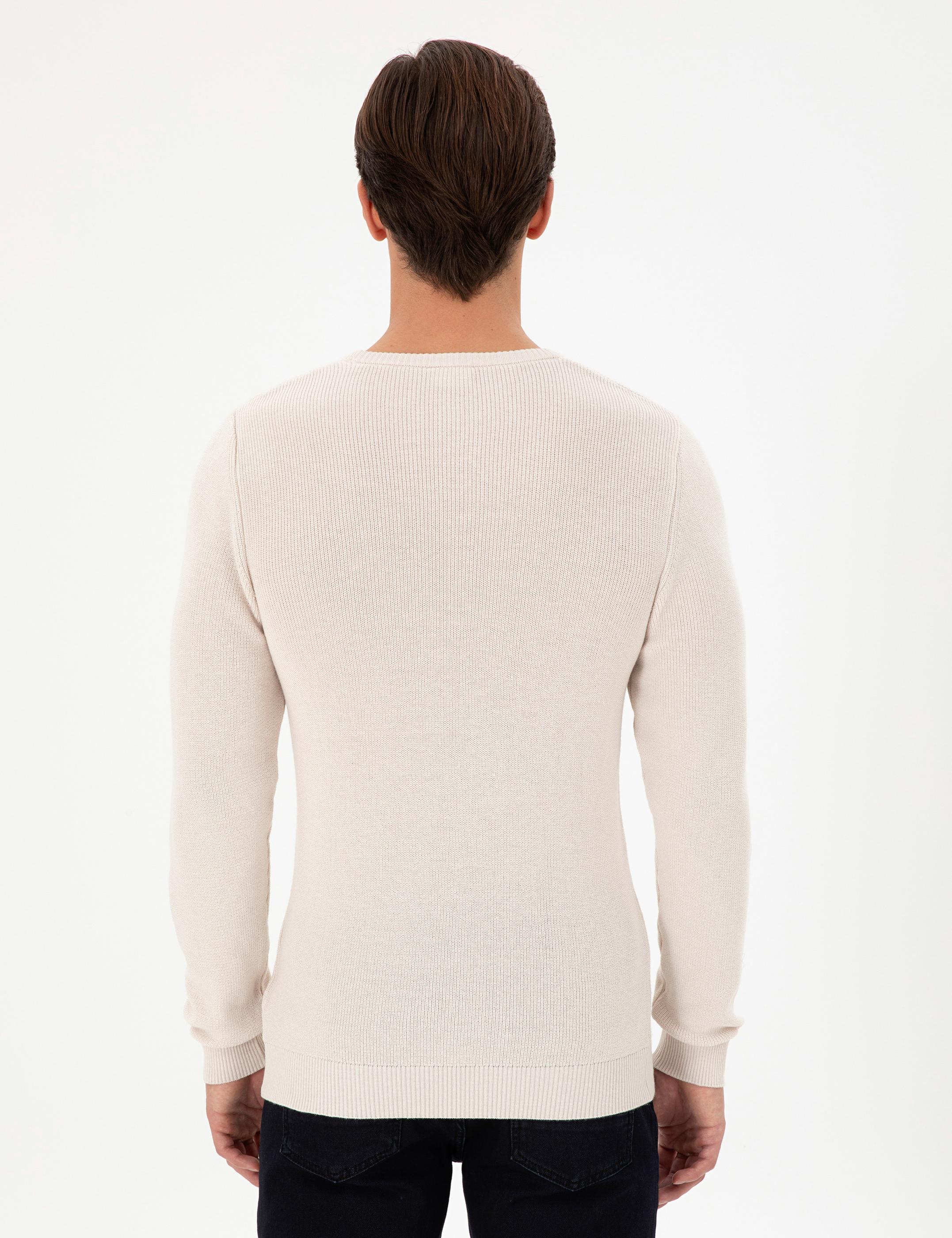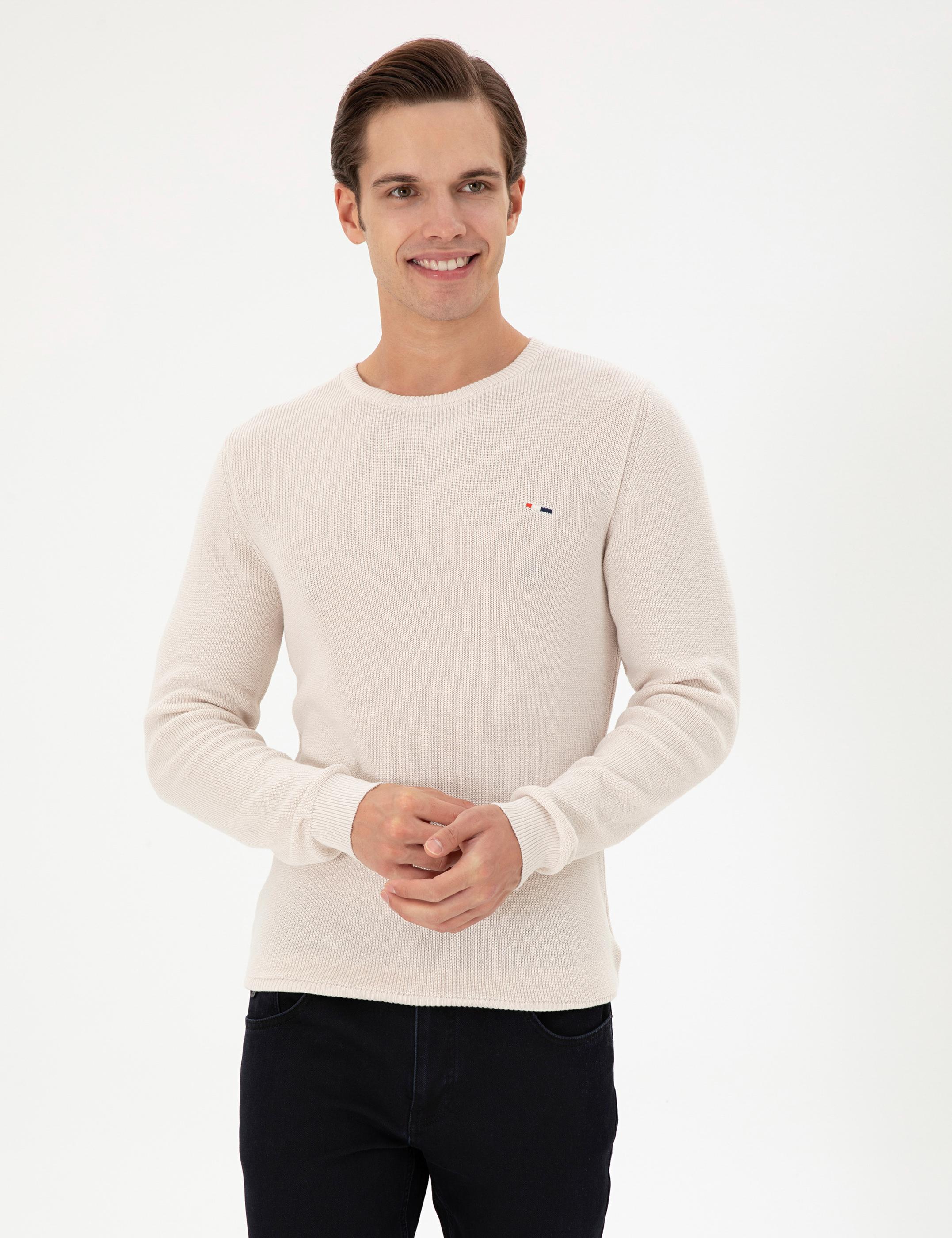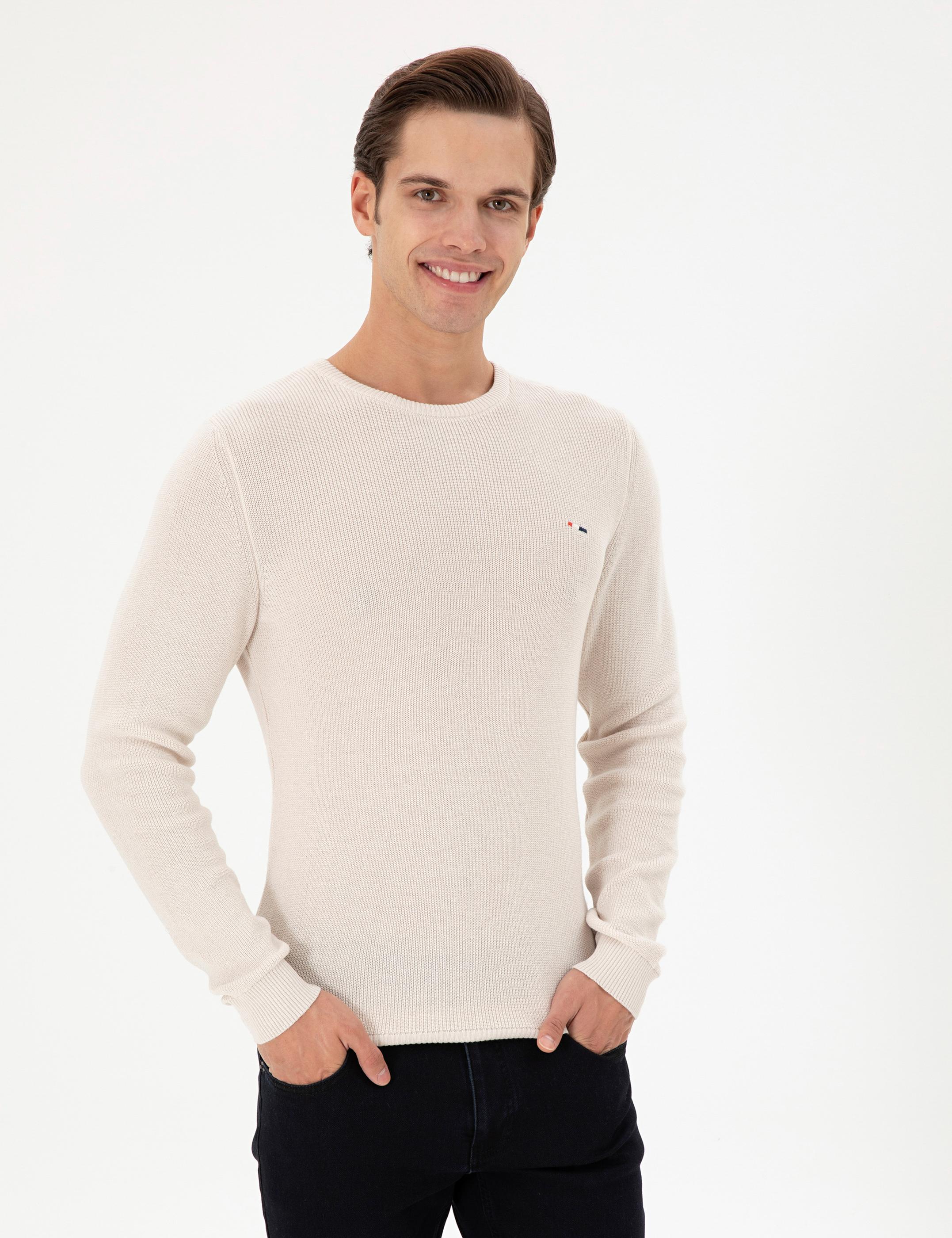 Erkek Slim Fit Bisiklet Yaka Krem Basic Kazak