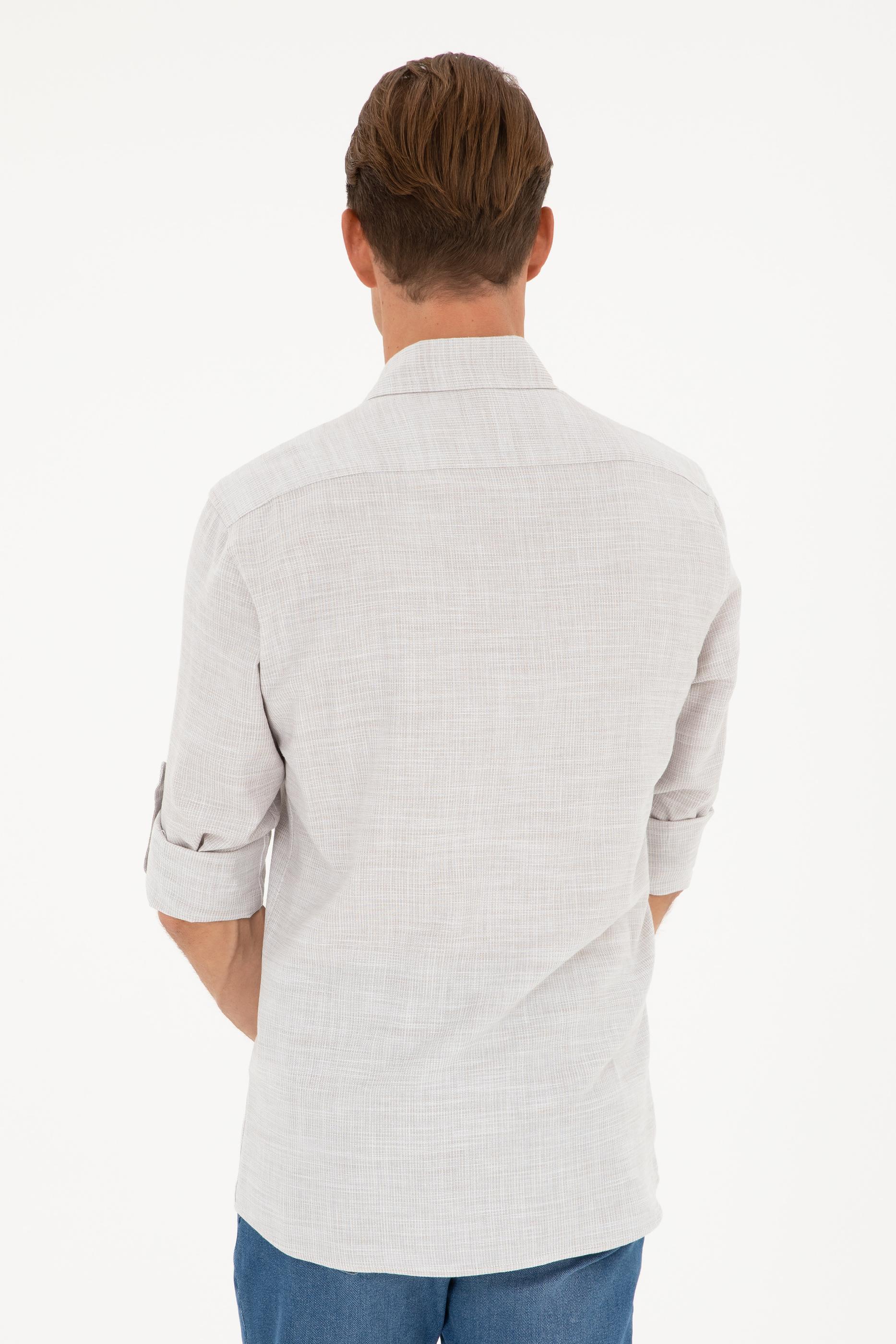 %100 pamuk malzemeden üretilmiş olan erkek krem rengi kumaş doku detaylı gömlek, zarif ve rahat bir giyim deneyimi sunar. Krem rengi, her türlü kıyafetle uyum sağlayabilecek nötr ve sofistike bir tona sahiptir. Yüksek kaliteli pamuk kumaşı, cildinizin nefes almasına olanak tanıyarak gün boyu konfor sağlar. Slim fit kesimi ile vücuda oturan ve şık bir görünüm sunan gömlek, modern erkeklerin gardırobunda mutlaka bulunması gereken bir parçadır. Doku detayları, gömleğe ekstra bir derinlik katar ve stilinizi bir üst seviyeye taşır. Uzun kollu tasarımı ve düğmeli yakası hem resmi hem de yarı resmi ortamlarda rahatlıkla kullanılabilir.