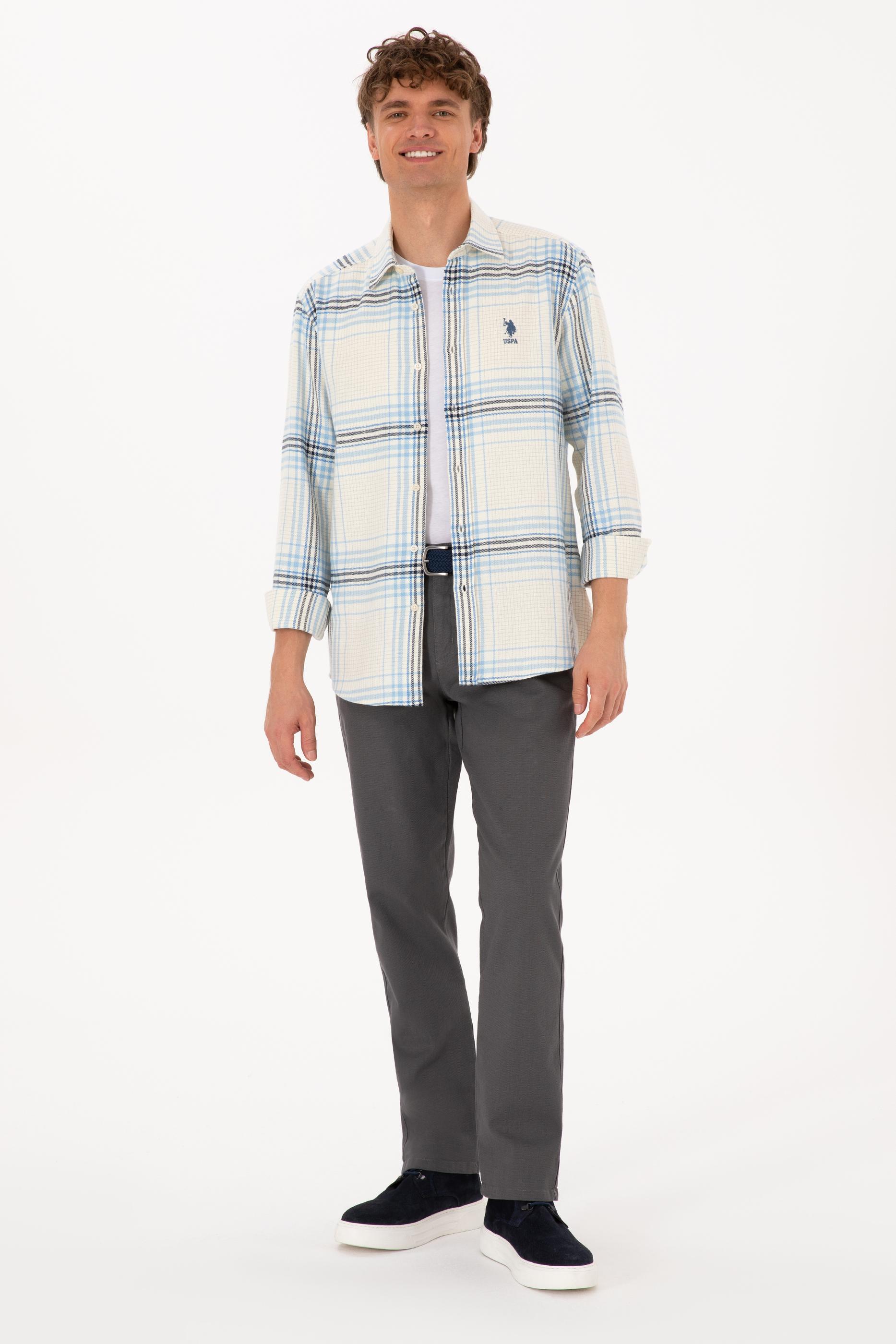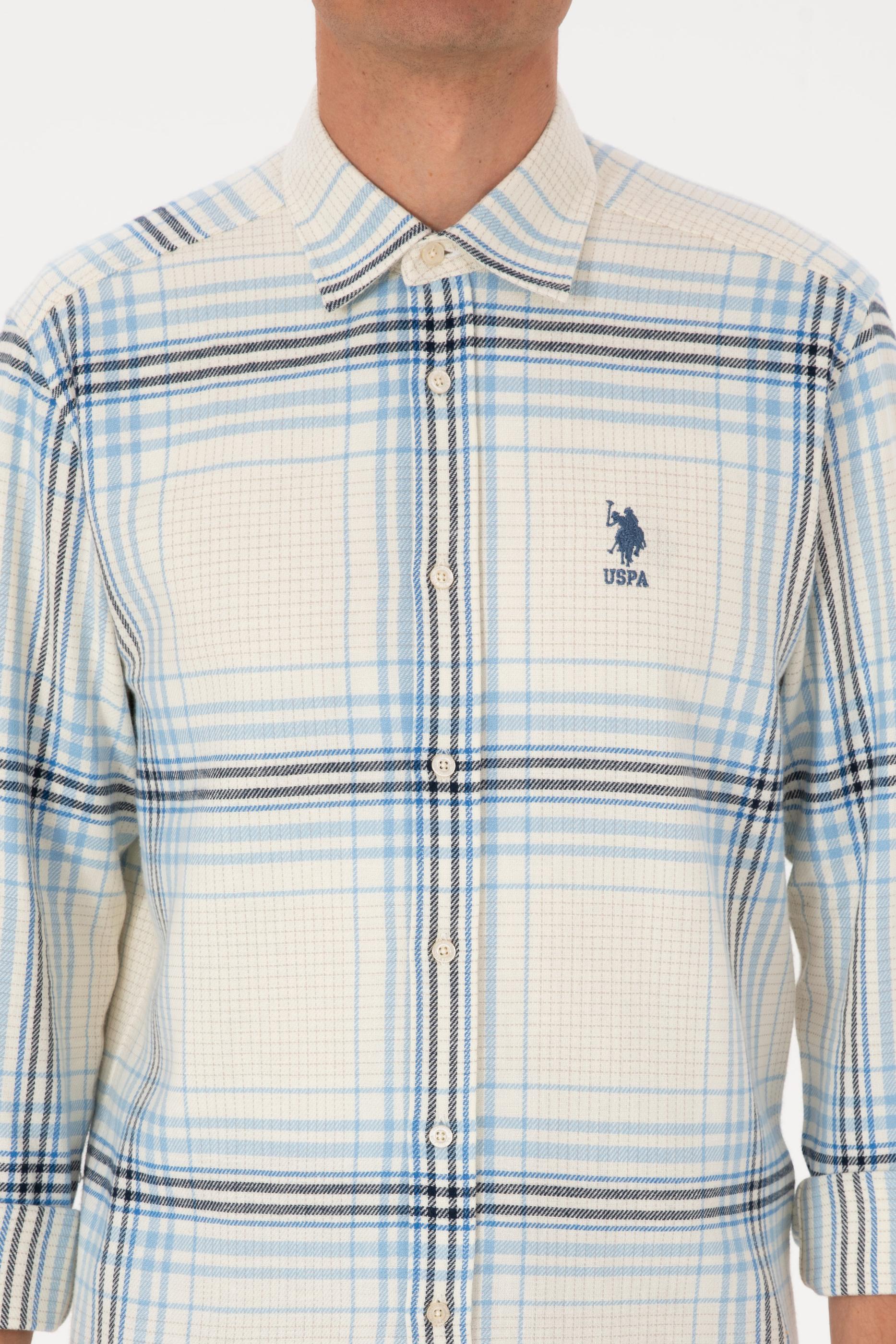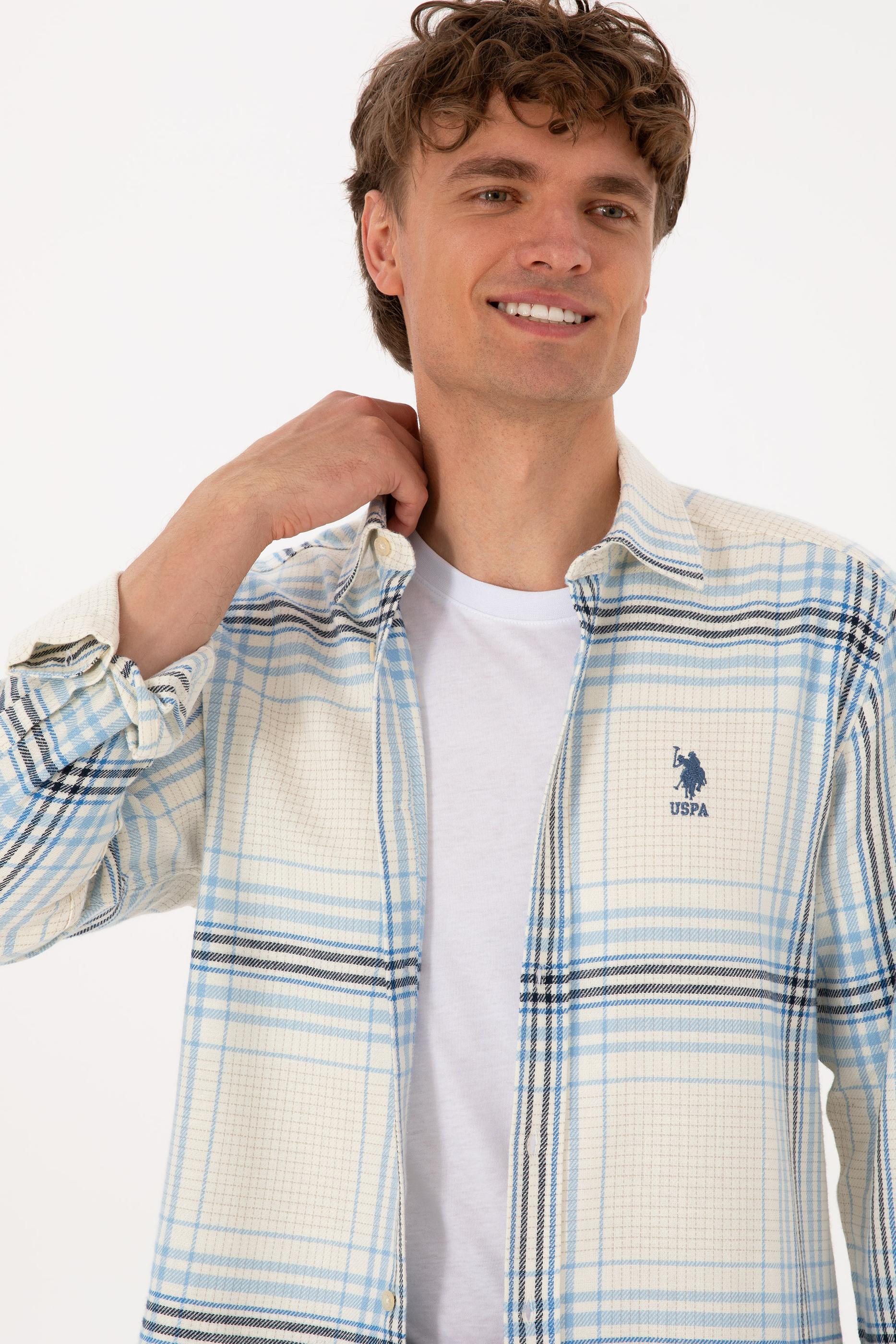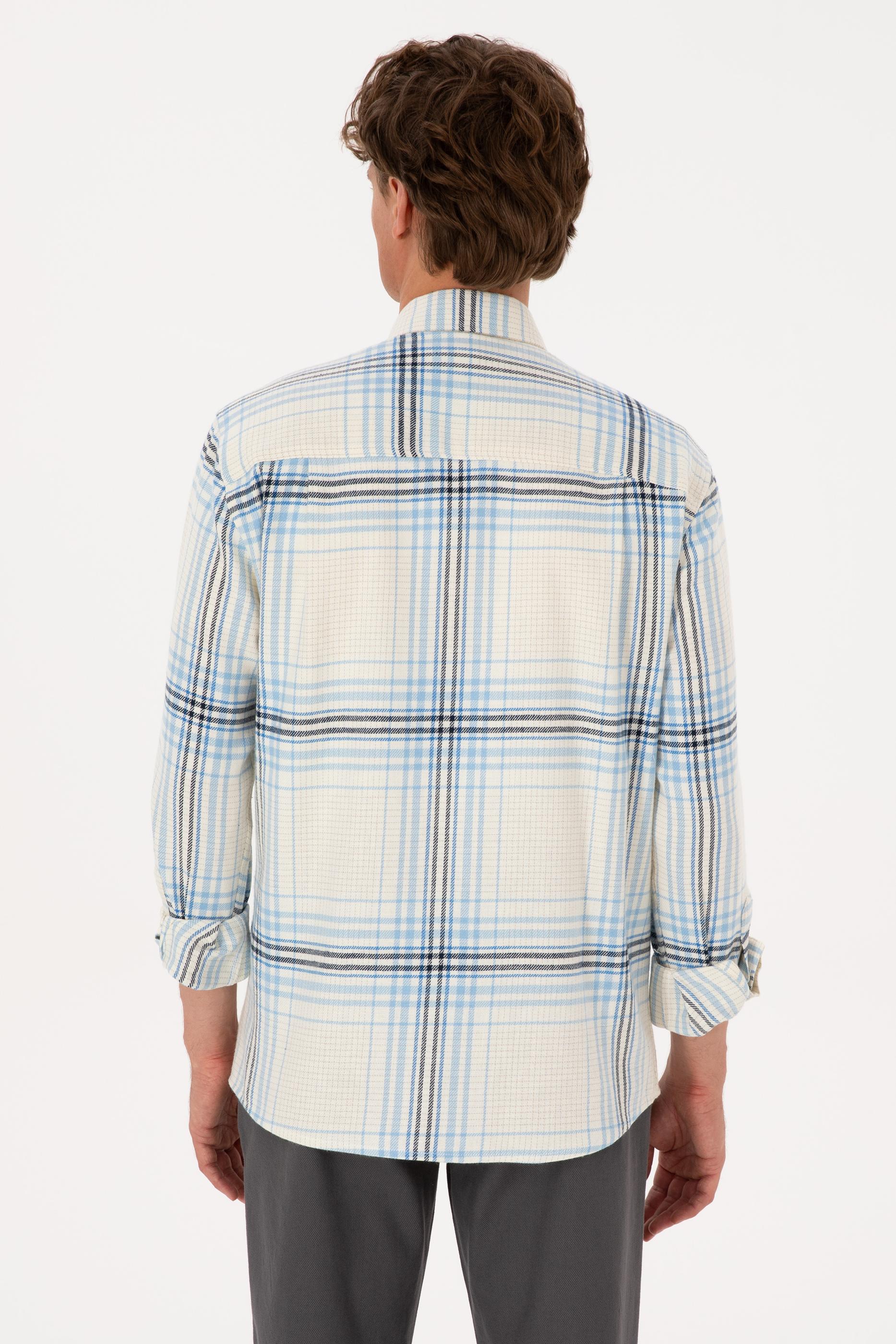 Erkek Açık Mavi Ekoseli Uzun Kollu Krem Gömlek
