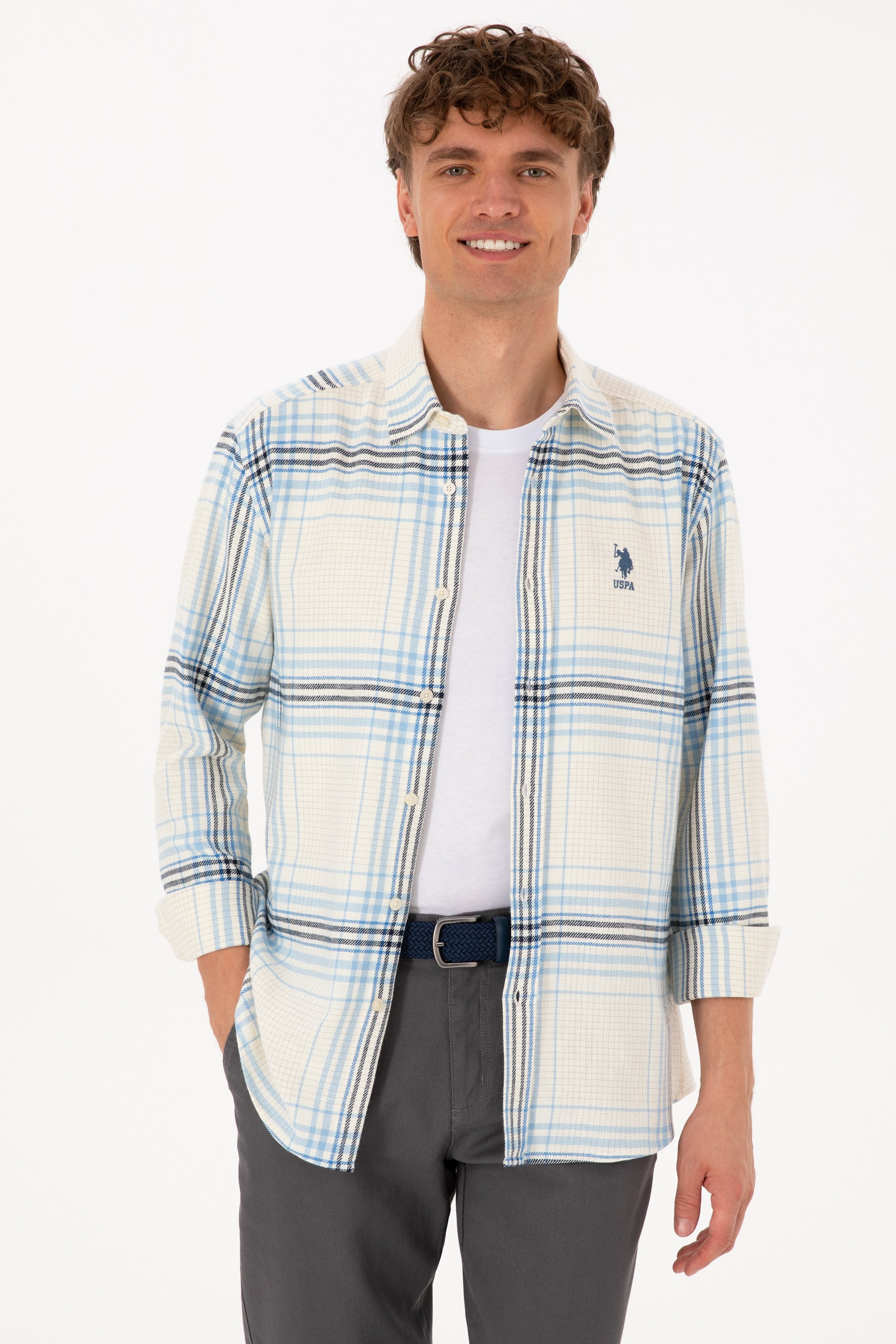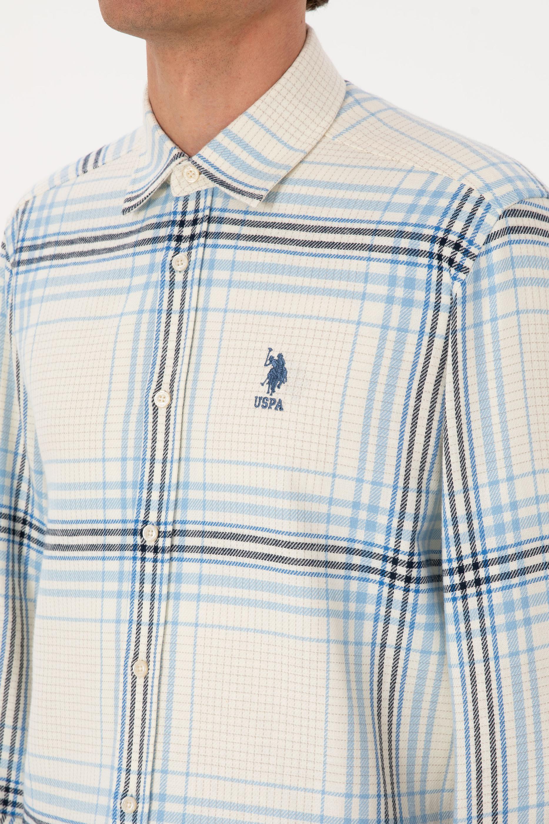 - Erkek Açık Mavi Ekoseli Uzun Kollu Krem Gömlek