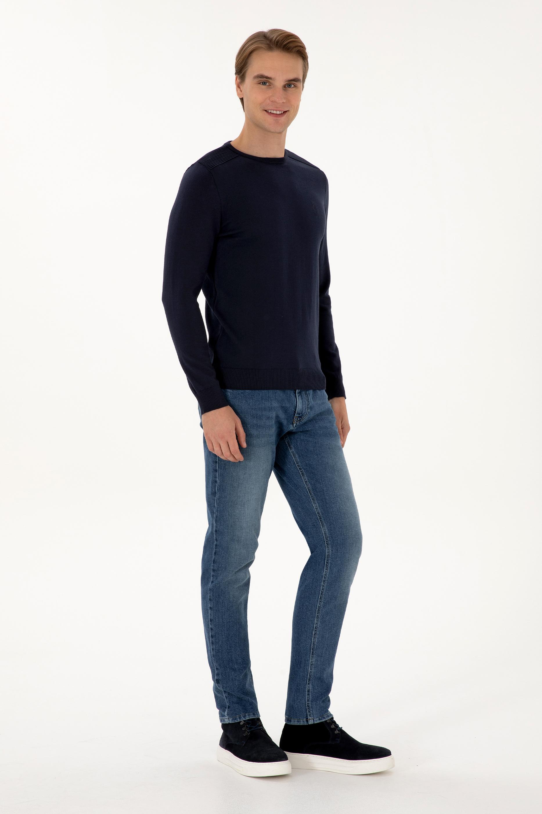 Erkek Slim Fit Bisiklet Yaka Lacivert Basic Kazak