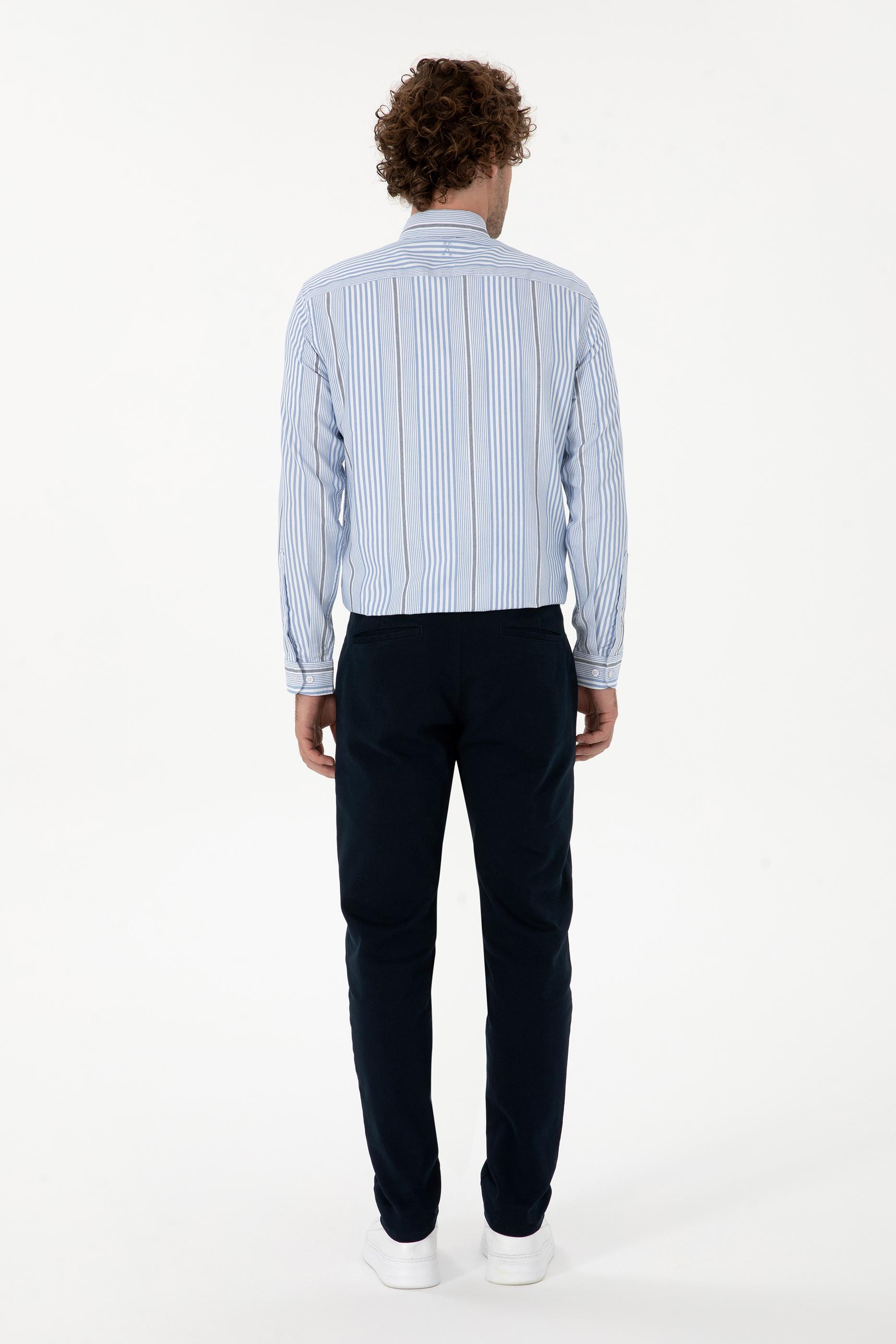 Erkek lacivert slim fit dokuma spor pantolon, şık ve modern tarzıyla her ortamda rahatlıkla tercih edebileceğiniz bir parça. Dar kesimi vücudu sararak fit bir görünüm kazandırır. Ofis şıklığından günlük kombinlere kadar geniş bir kullanım alanı sunan bu pantolon, gömlek veya tişörtlerle kolayca uyum sağlar. Hem spor hem de klasik ayakkabılarla kombinleyerek tarzınızı tamamlayabilirsiniz. Gardırobunuzda mutlaka bulunması gereken zamansız bir seçenektir.