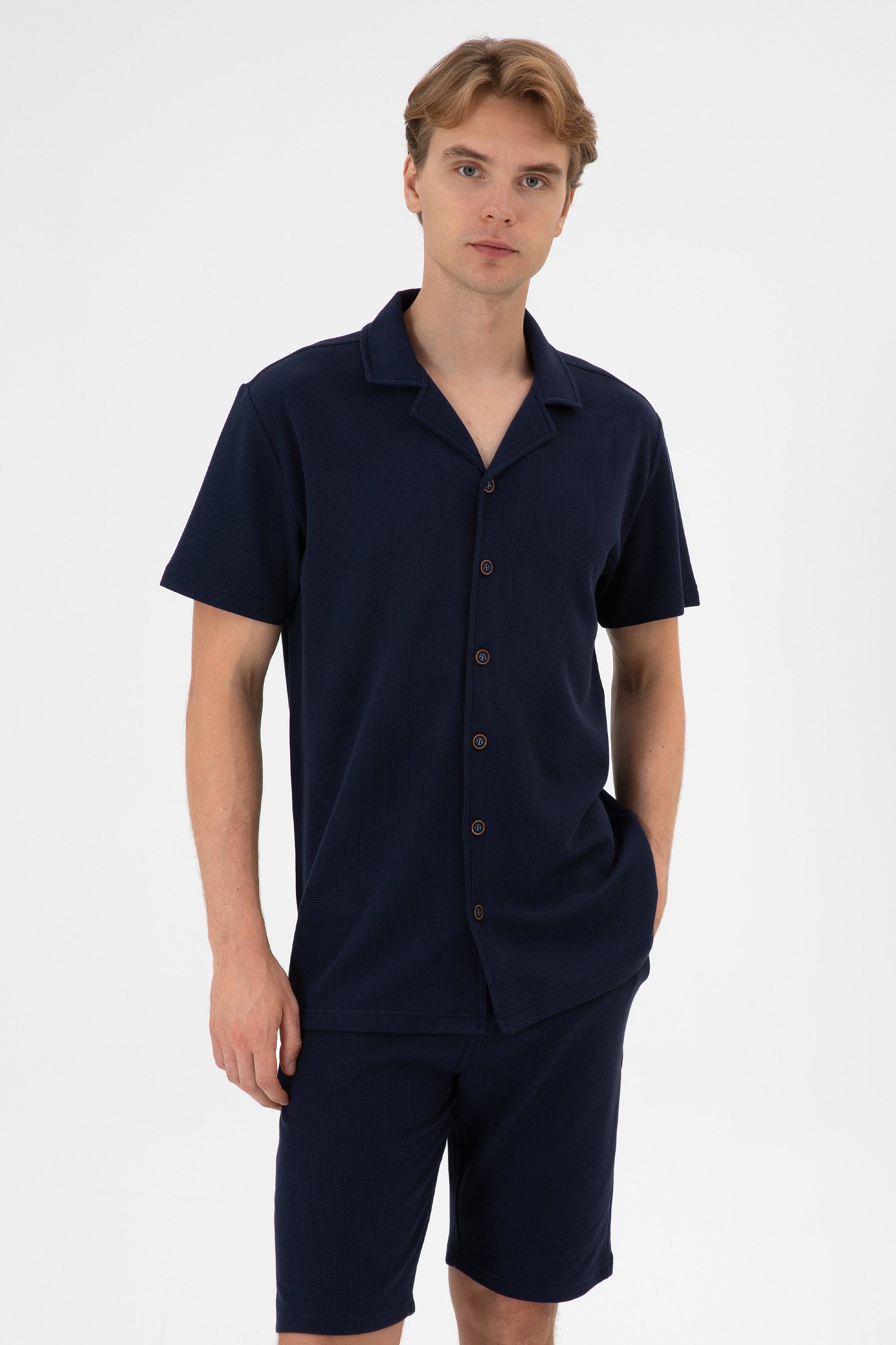 - Erkek Lacivert Apaş Yaka Kısa Kollu Örme Gömlek