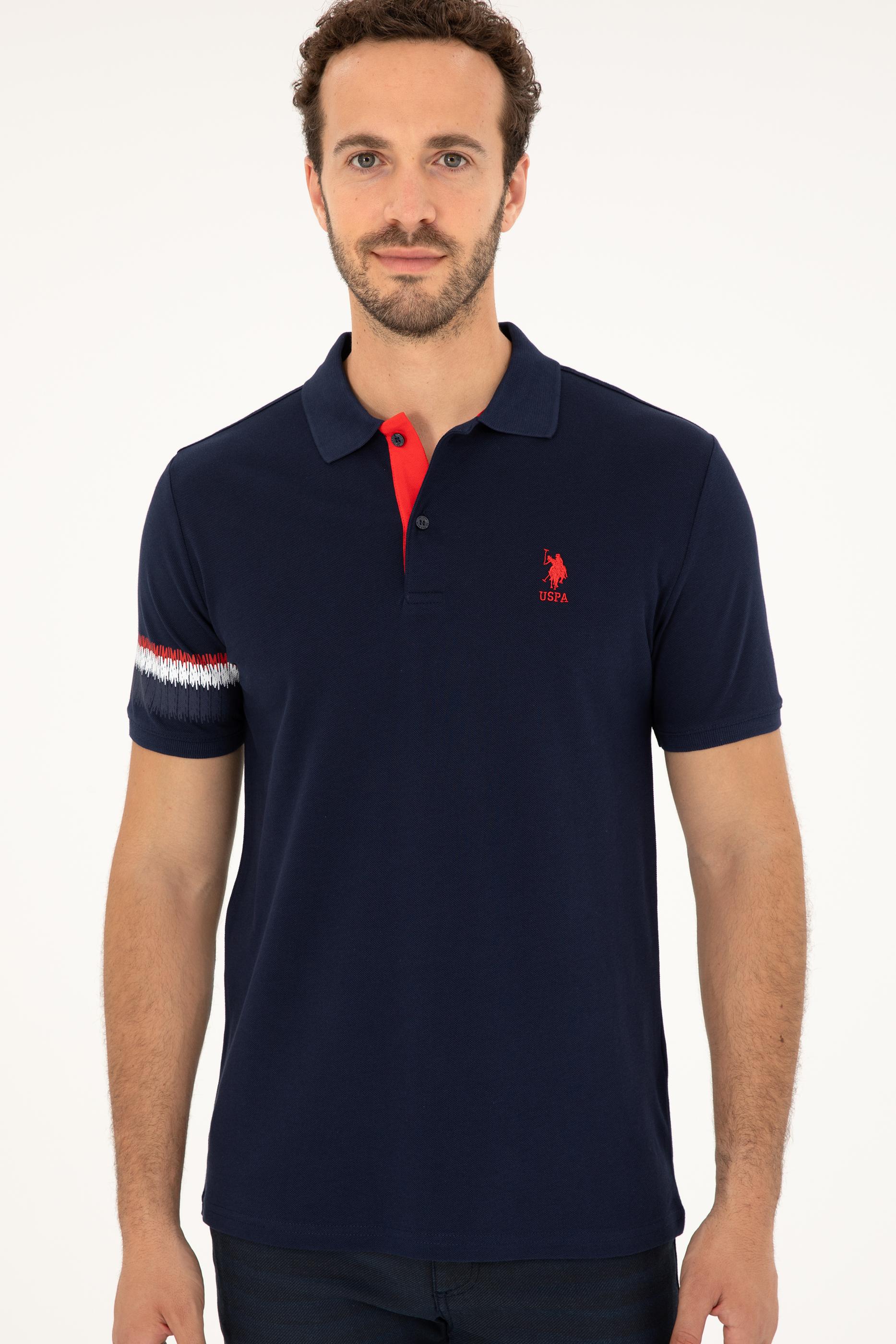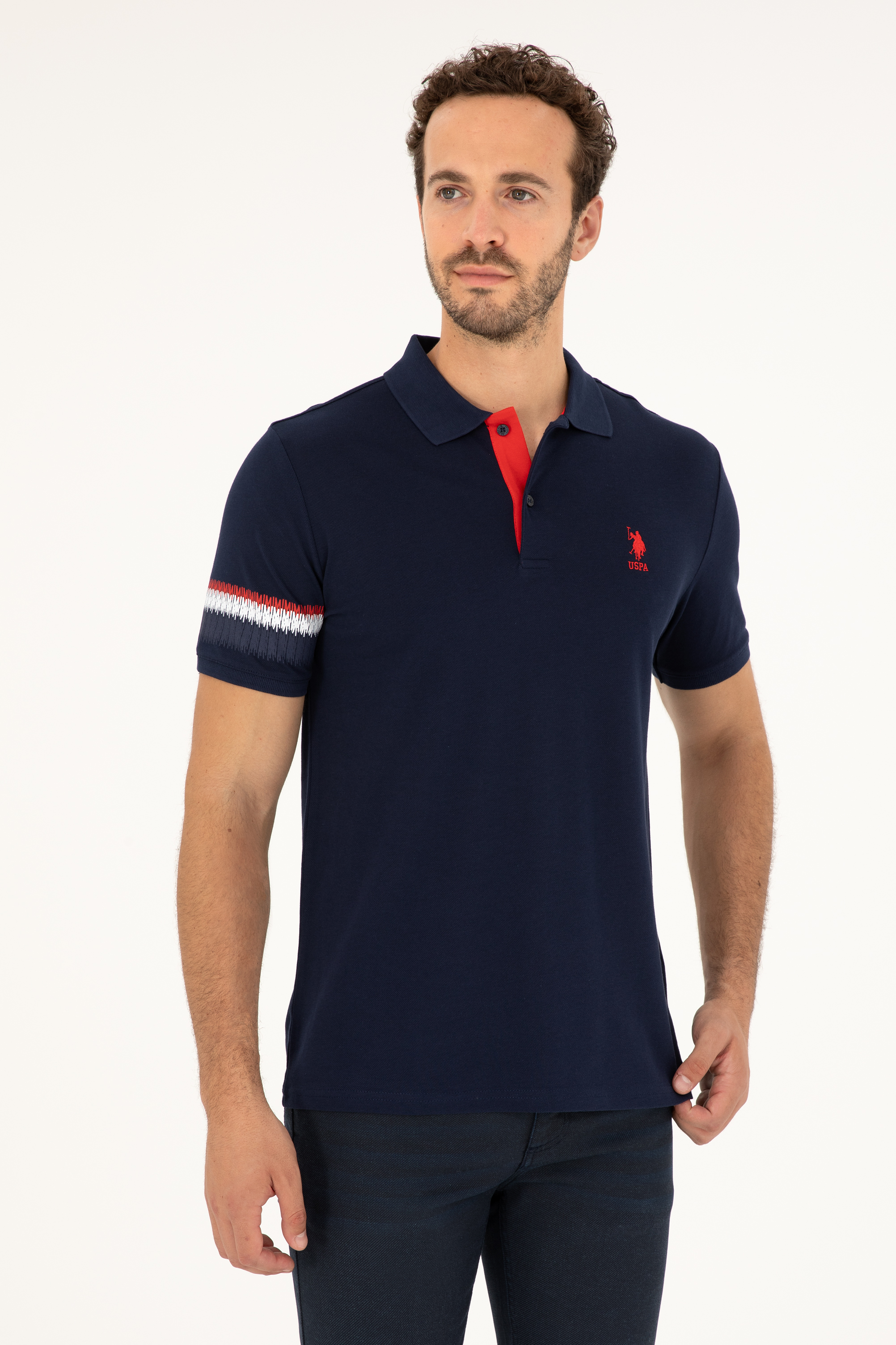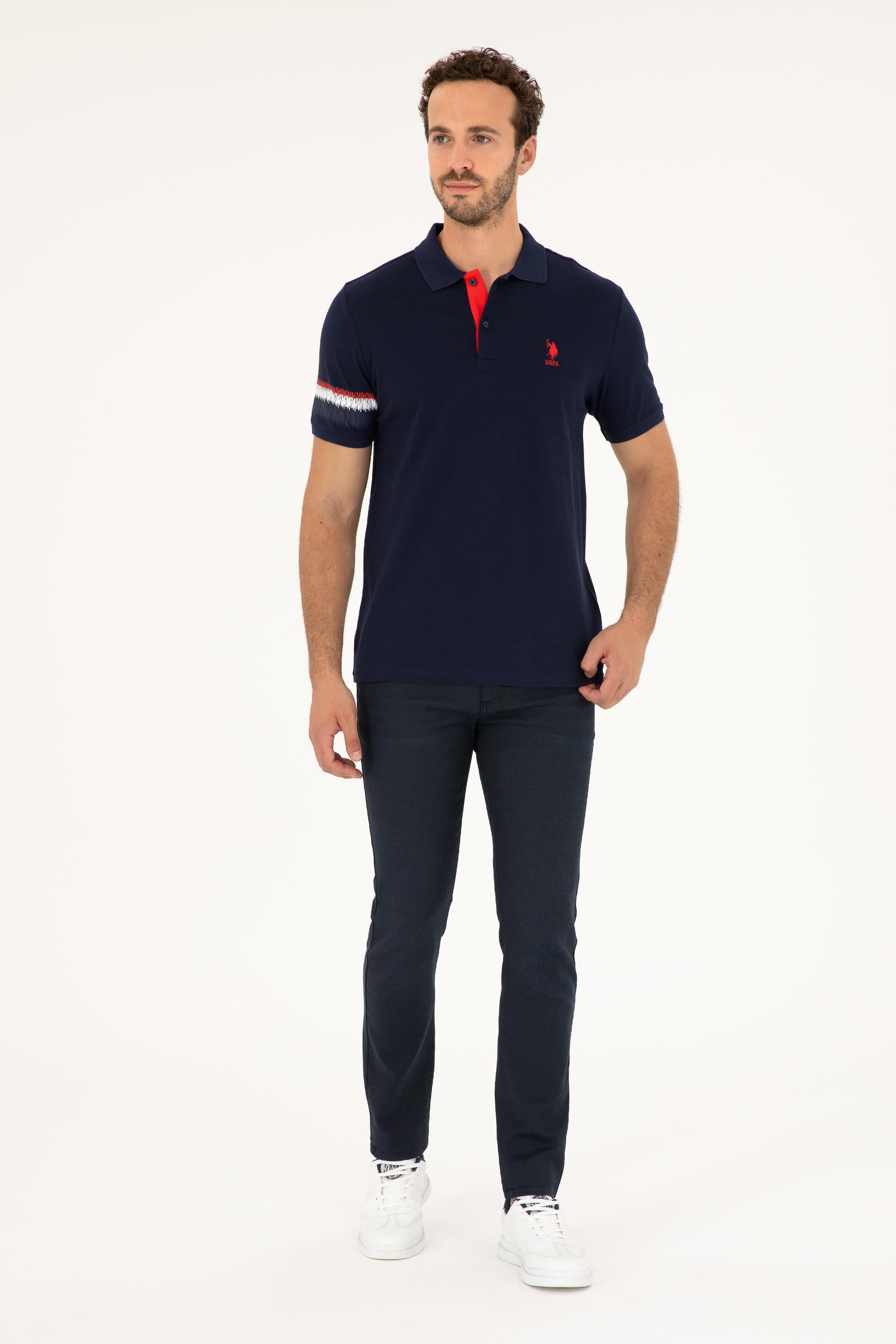 Lacivert renk kırmızı detayların enerjisiyle birleşerek dikkat çekici bir görünüm oluşturuyor. Yaka içindeki kırmızı detay ve düğme tasarımı, tişörte canlılık katarken, klasik polo yaka stiline yenilikçi bir yorum getiriyor. Ayrıca, kol kısmındaki beyaz ve kırmızı şerit baskılar, tişörtün sade tasarımını hareketlendirerek dinamik bir hava katıyor.