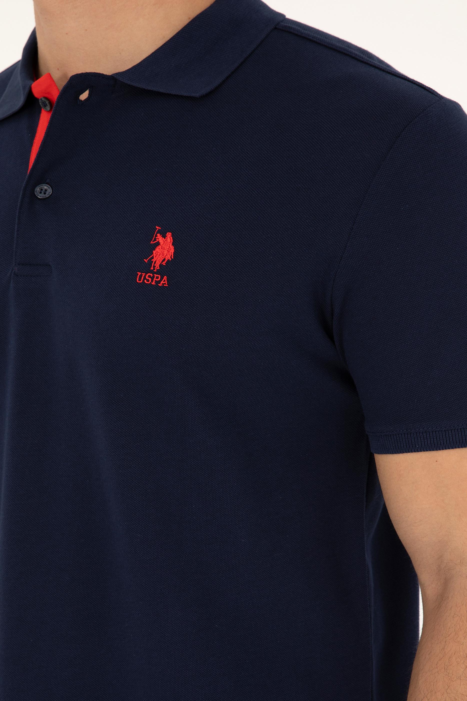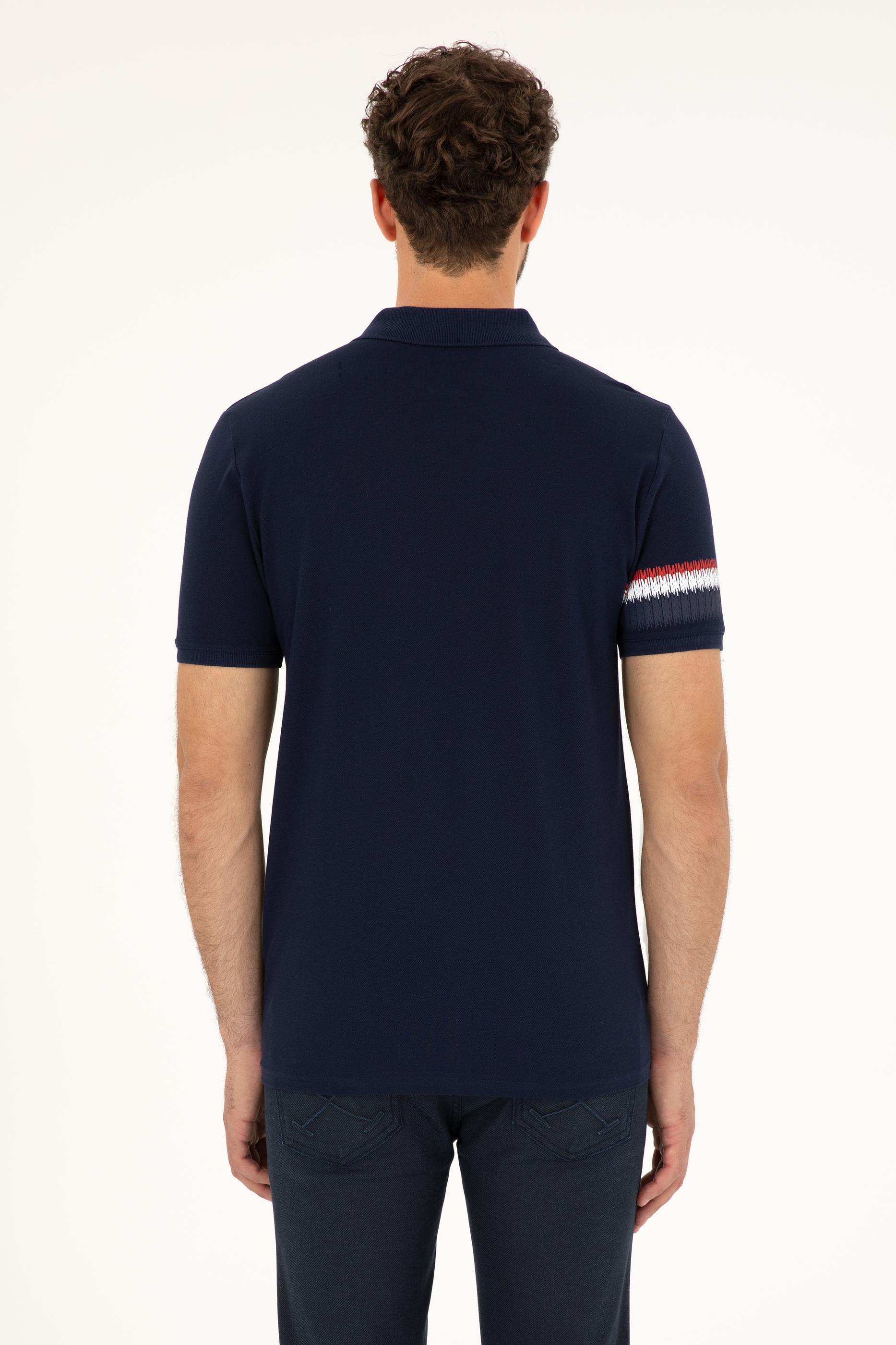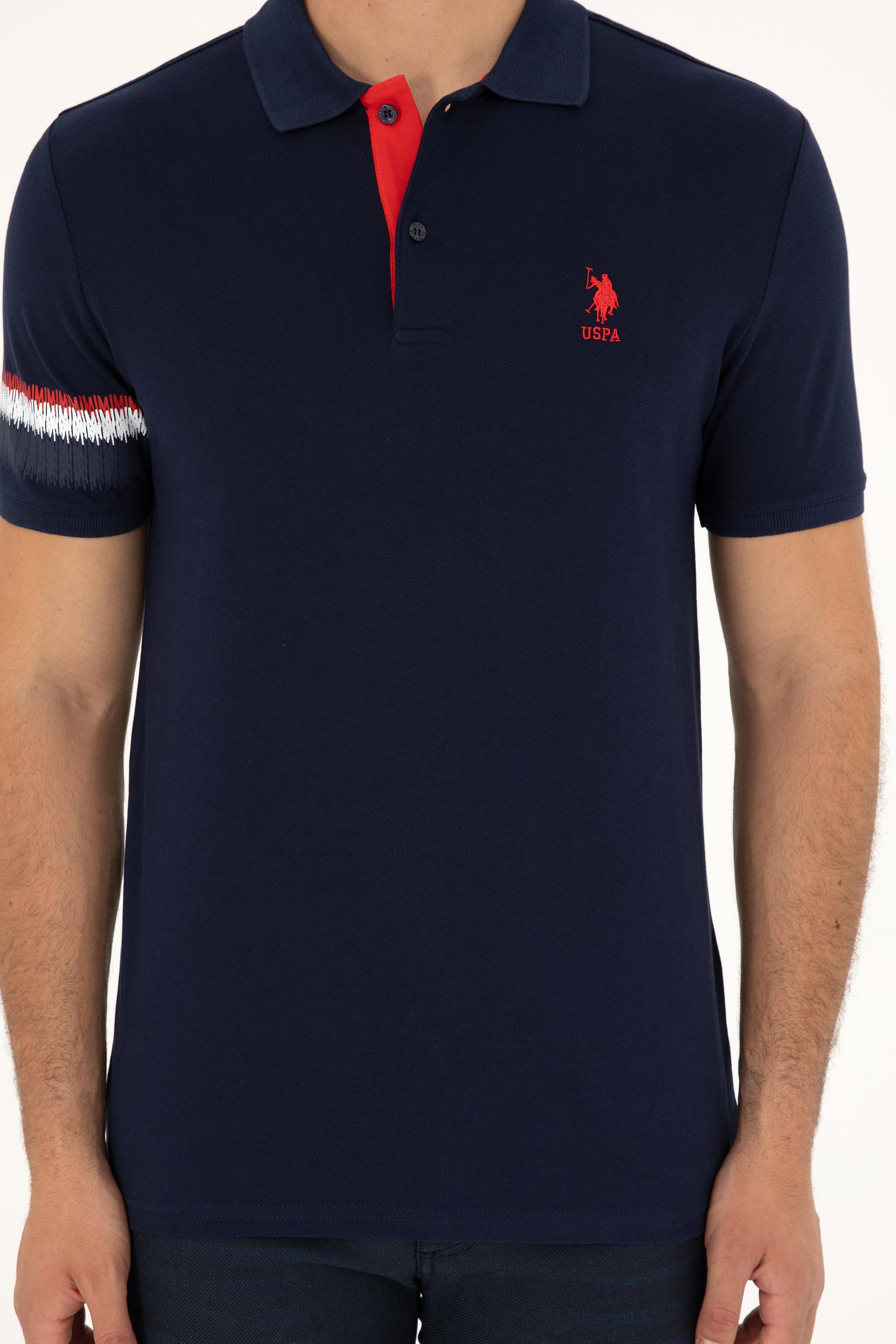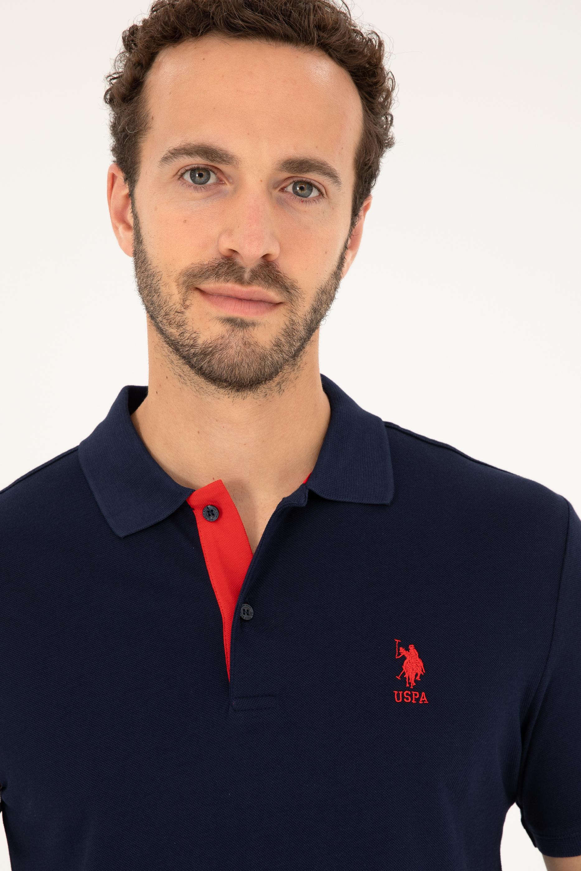 Lacivert renk kırmızı detayların enerjisiyle birleşerek dikkat çekici bir görünüm oluşturuyor. Yaka içindeki kırmızı detay ve düğme tasarımı, tişörte canlılık katarken, klasik polo yaka stiline yenilikçi bir yorum getiriyor. Ayrıca, kol kısmındaki beyaz ve kırmızı şerit baskılar, tişörtün sade tasarımını hareketlendirerek dinamik bir hava katıyor.