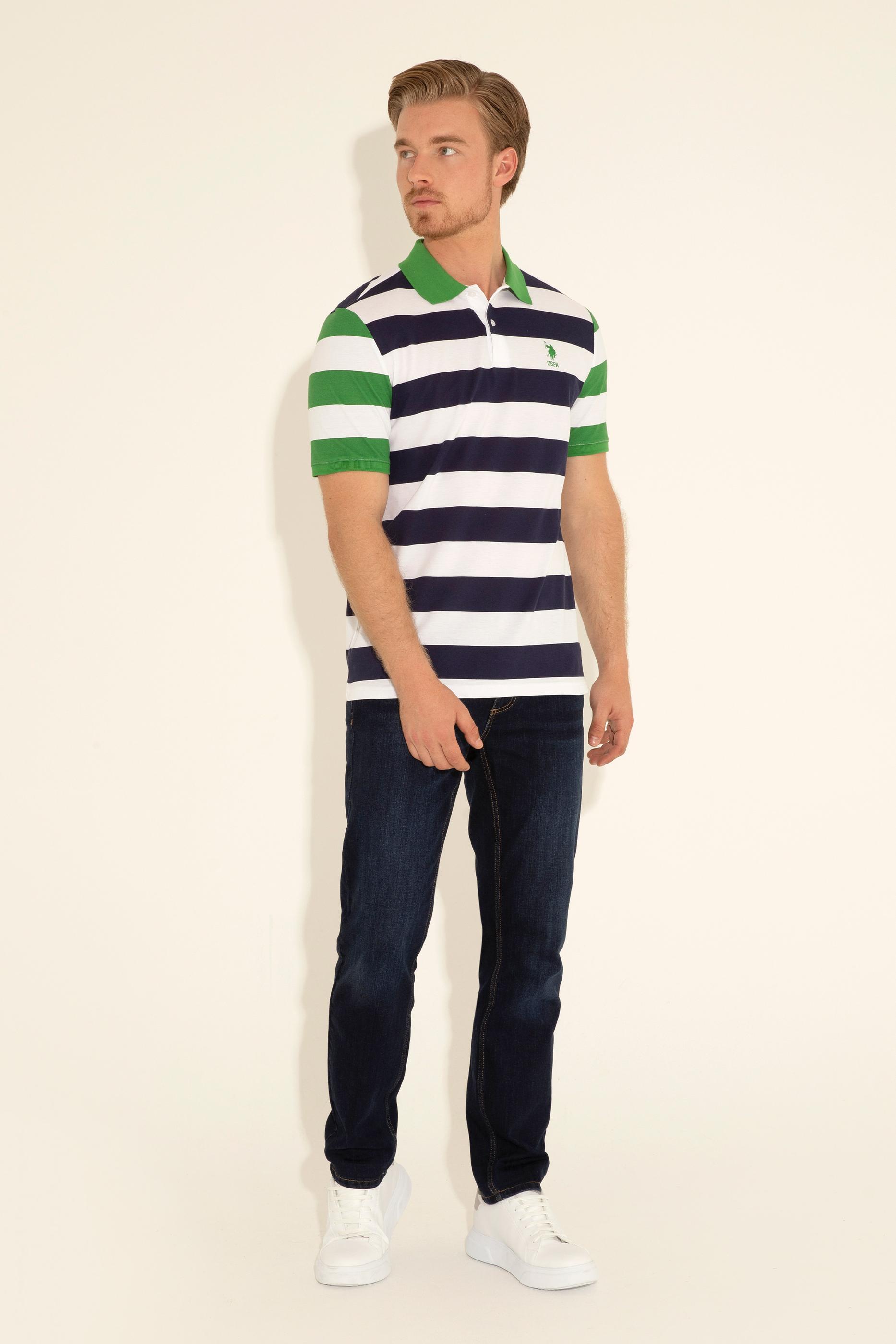 Lacivert ve beyaz yatay çizgilerin arasında yeşil detaylar, tişörtü klasik bir görünümden çıkararak modern ve şık bir tarza kavuşturuyor. Yeşil yakası ve manşet detayları, tişörtün genel çizgileriyle uyum oluşturarak dikkat çekici bir kontrast sergiliyor. %100 pamuk kumaş kullanılarak üretilmiş olan tişört, yumuşak bir dokunuş ve nefes alabilirlik sağlar.