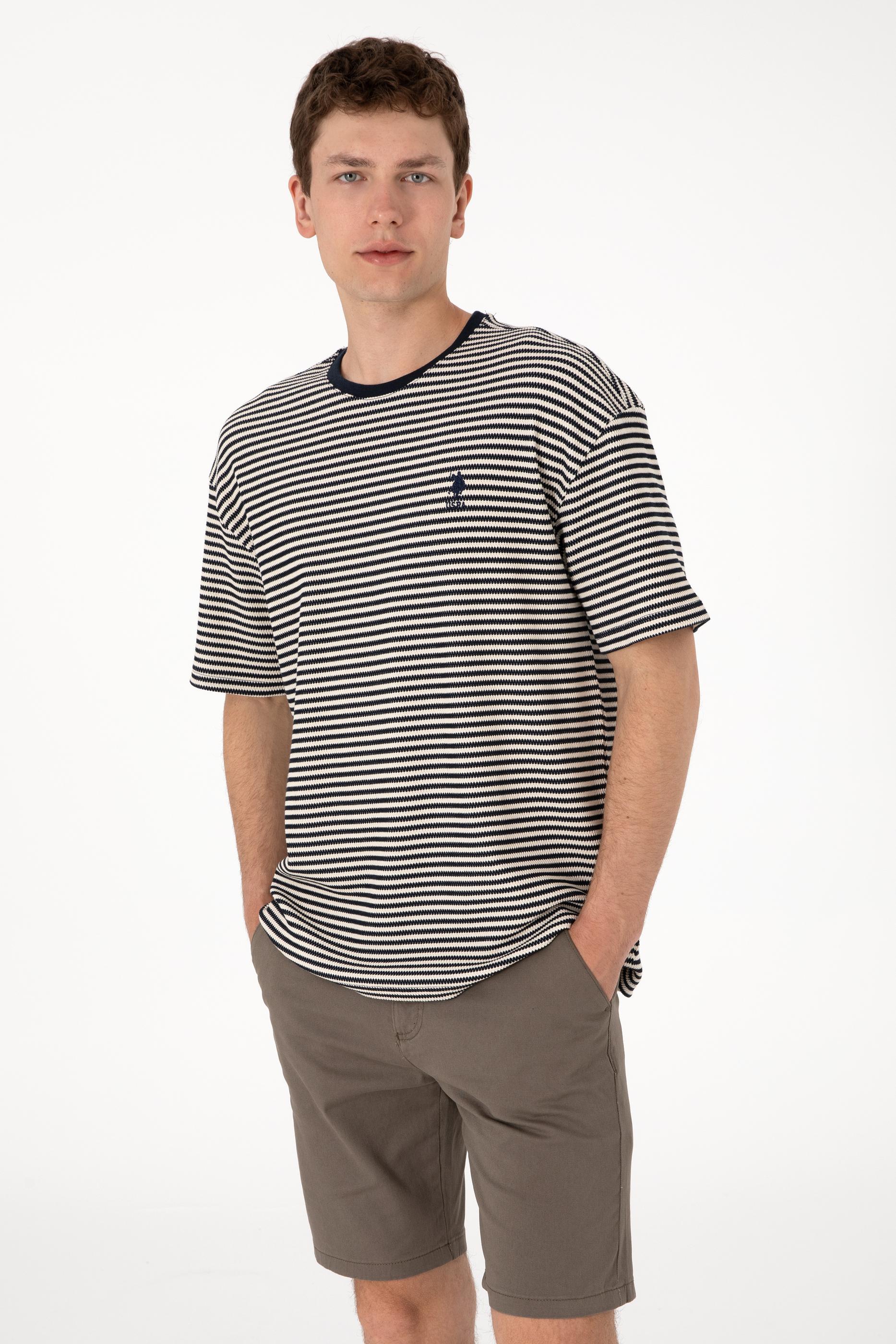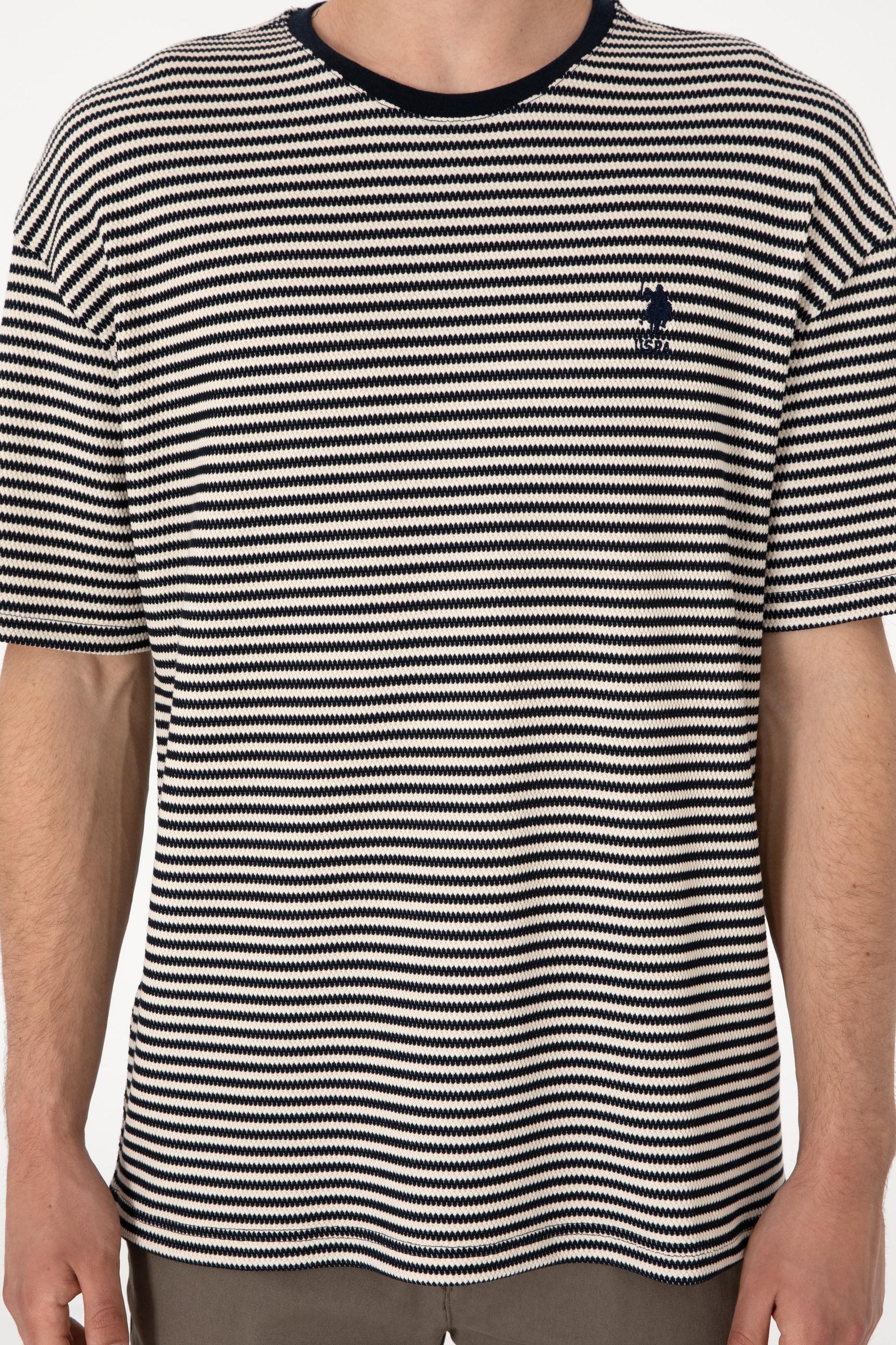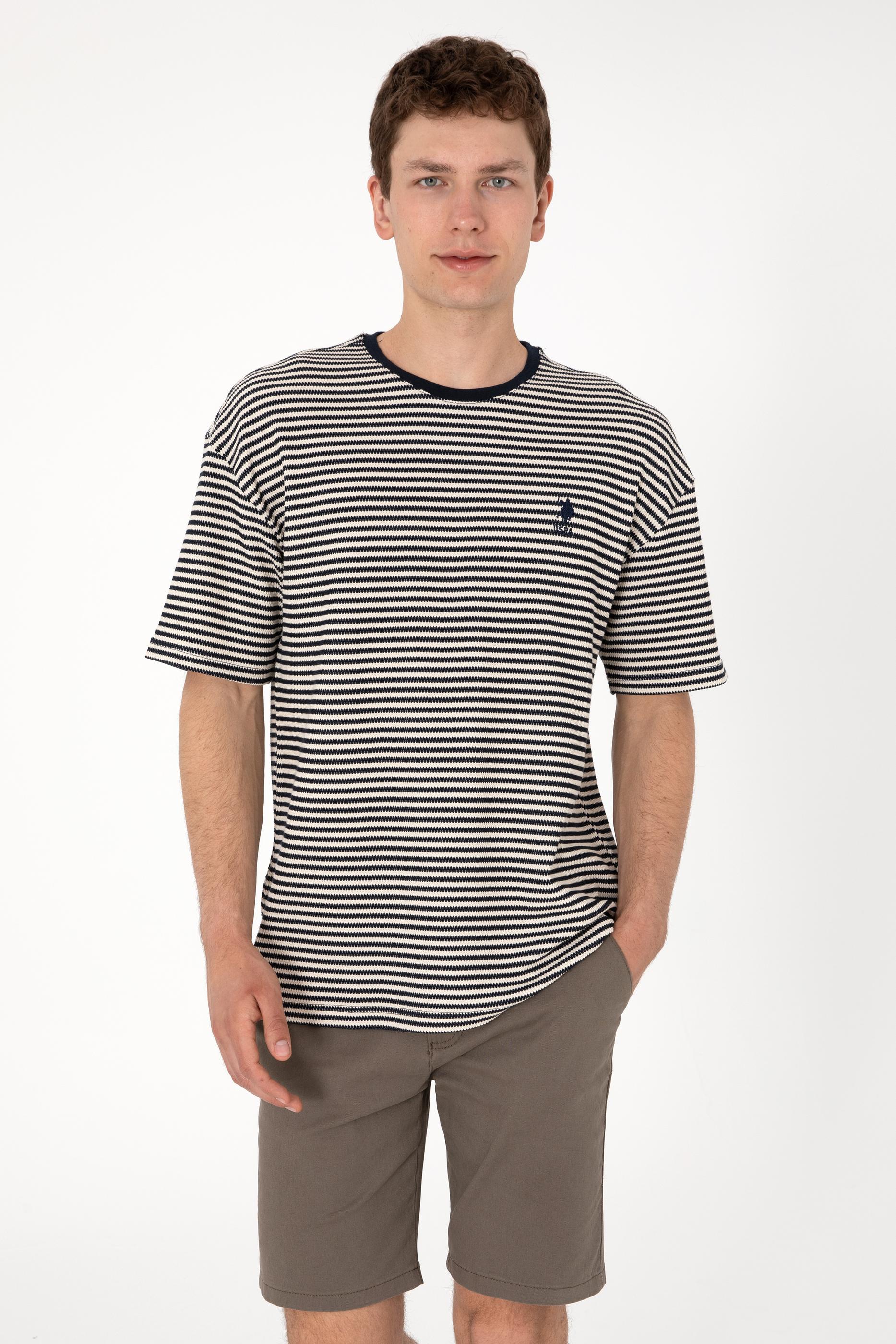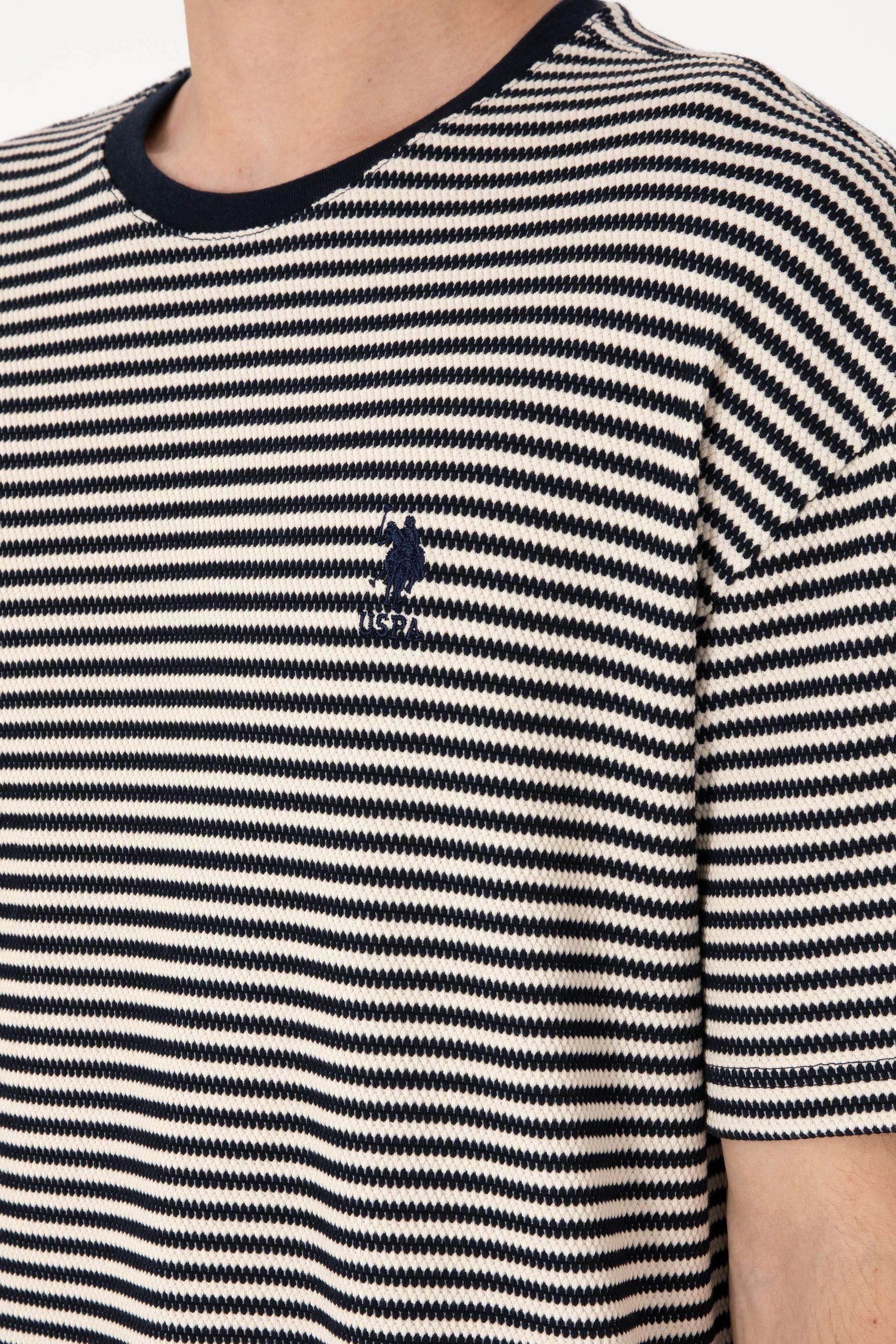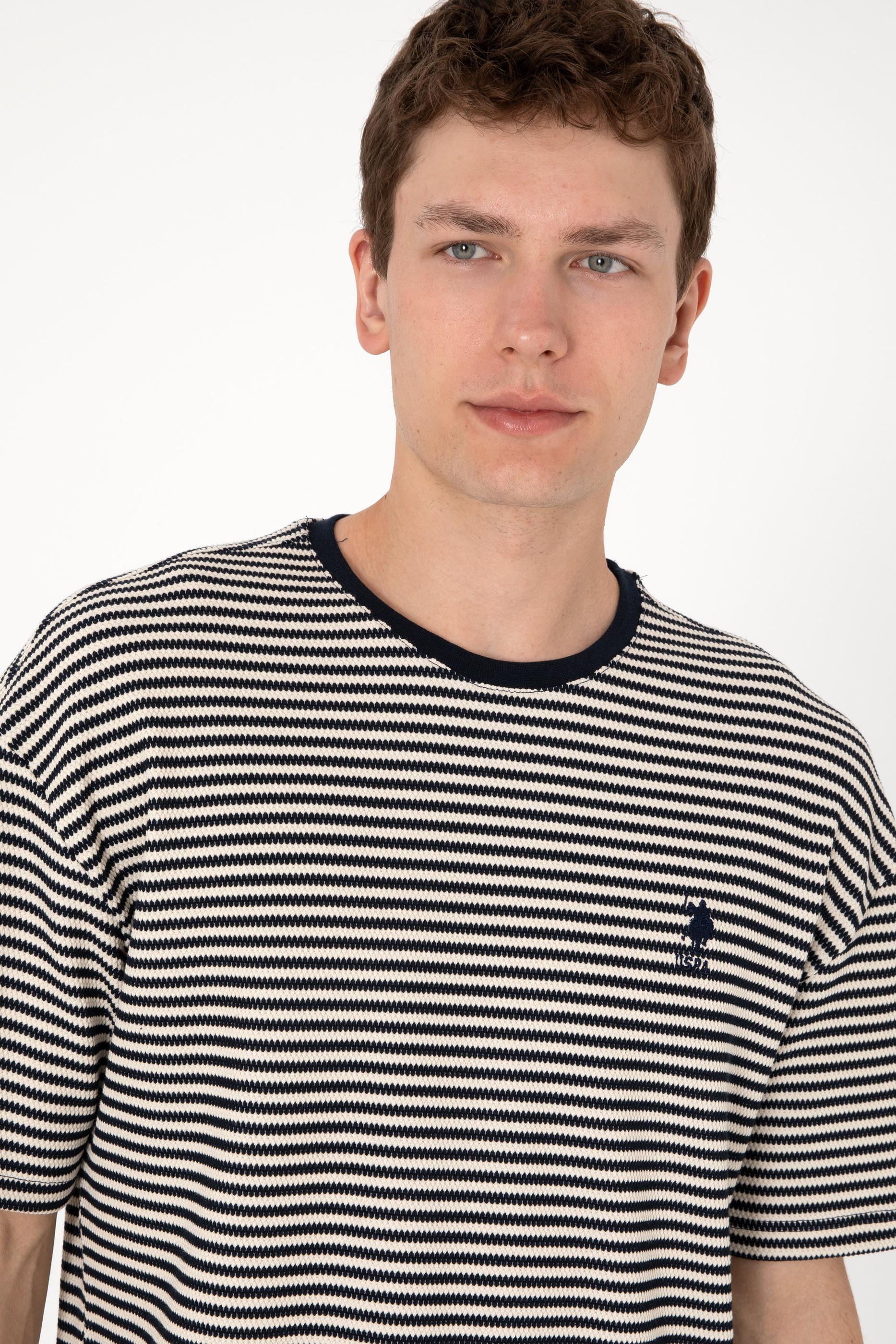 Erkek Comfort Fit Bisiklet Yaka Lacivert Örgü Desenli Tişört
