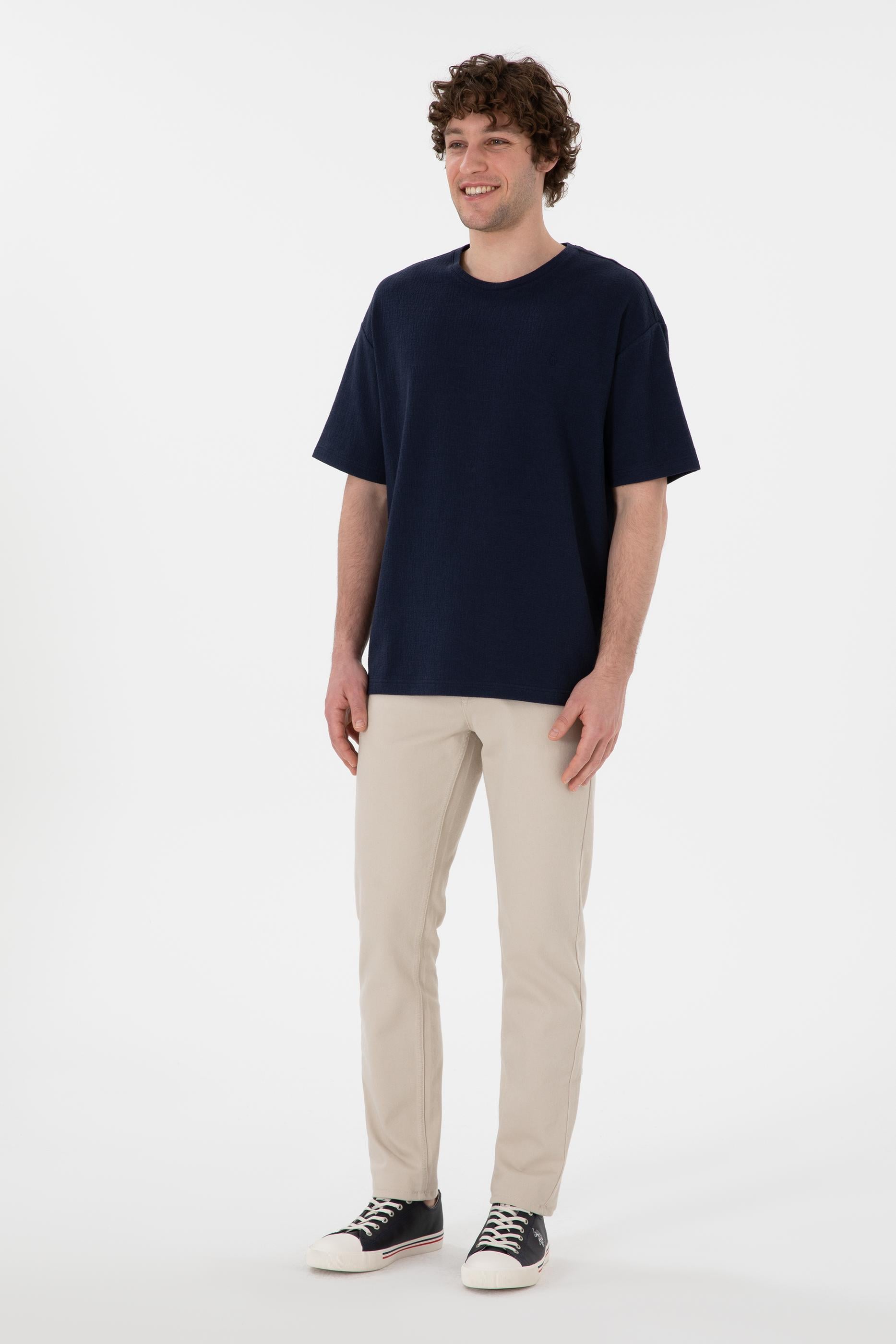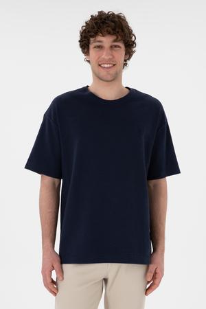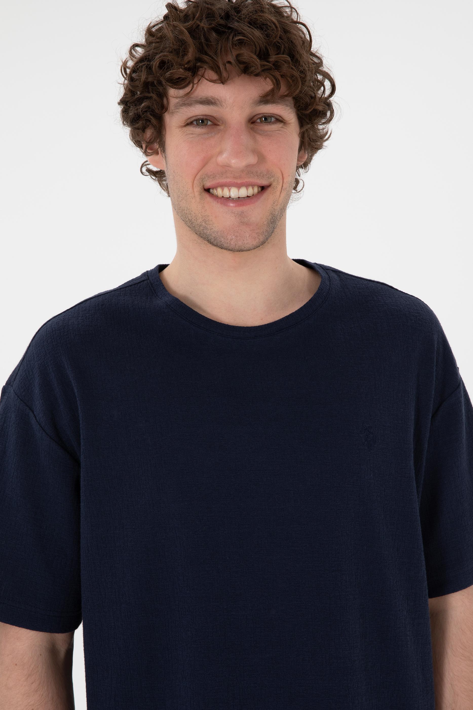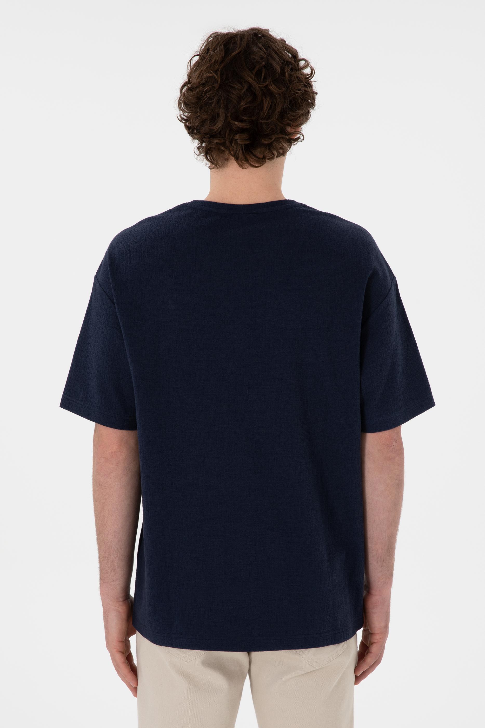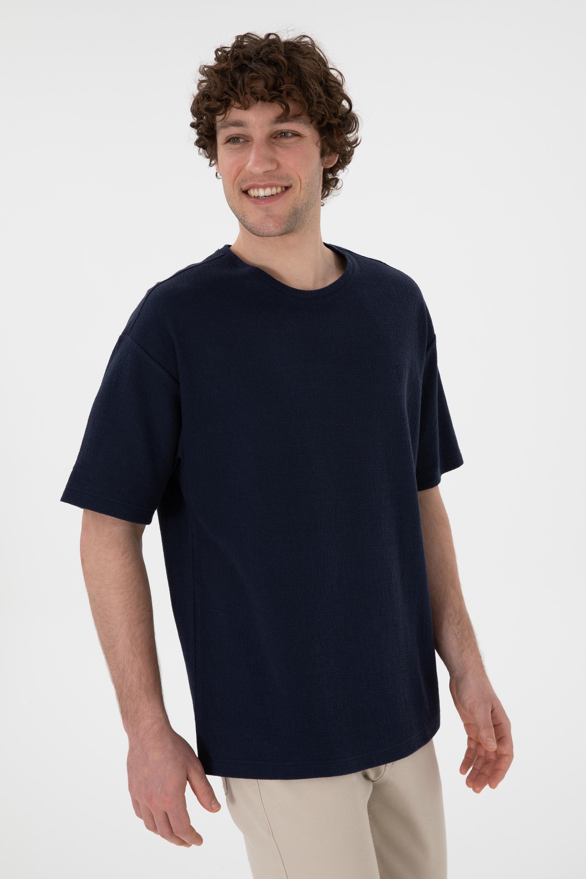 Erkek Comfort Fit Bisiklet Yaka Lacivert Jakarlı İnterlok Tişört