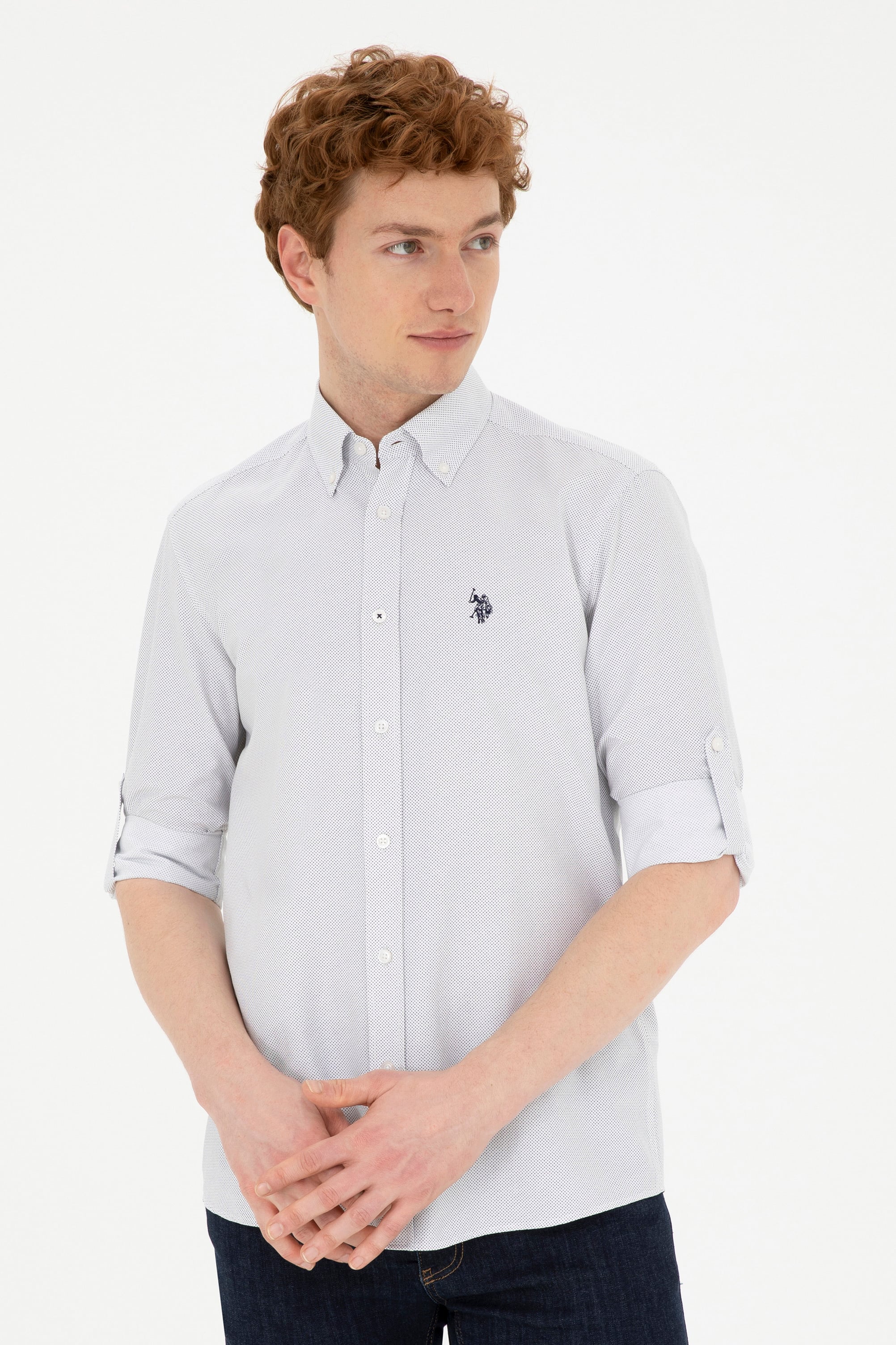 Lacivert mikro desenli katlamalı kol beyaz gömlek, %60 pamuk ve %40 polyester karışımından üretilmiştir. Pamuk dokusu cildin nefes almasını sağlarken, polyester malzeme dayanıklılık ve uzun ömürlülük kazandırır. Lacivert mikro desenlerin zarif tasarımı gömleğe modern hava katar. Katlanabilir kolları sayesinde çok yönlü kullanım sunan bu gömlek, hem iş hem de günlük giyim için idealdir.