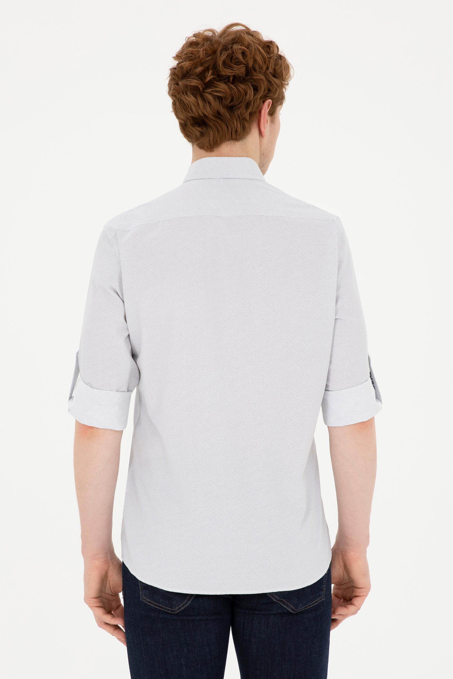 Slim fit kesimi ile vücudu saran gömlek şık ve modern bir siluet oluşturur. Düğme detayları ve yaka tasarımı, klasik tarzın modern unsurlarla birleştiği bir görünüm sunar. Beyaz rengi ve lacivert desenleri çeşitli kombinasyonlarla uyum sağlar ve her ortama uygun hale getirir. Uzun kollu tasarımı kolları kıvırarak kısa kol gibi kullanılabilir böylece her mevsimde rahat bir kullanım sunar. Yerli üretim olan ürün, kaliteli kumaşı ve özenli işçiliği ile dikkat çeker. Gömleğin bakımı da son derece kolaydır makinede yıkanabilir ve ütü gerektirmeyen yapısı ile pratik bir kullanım sunar.