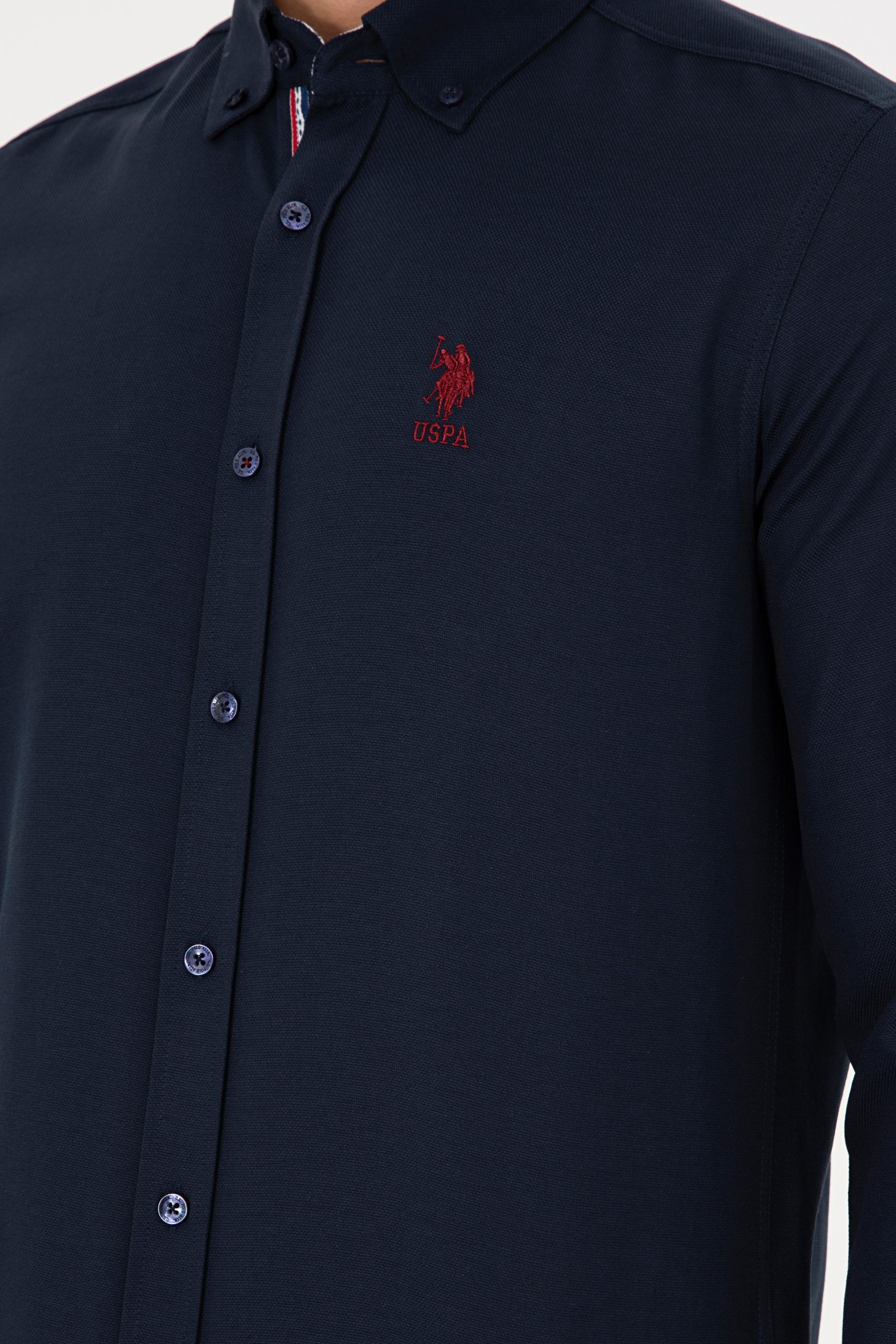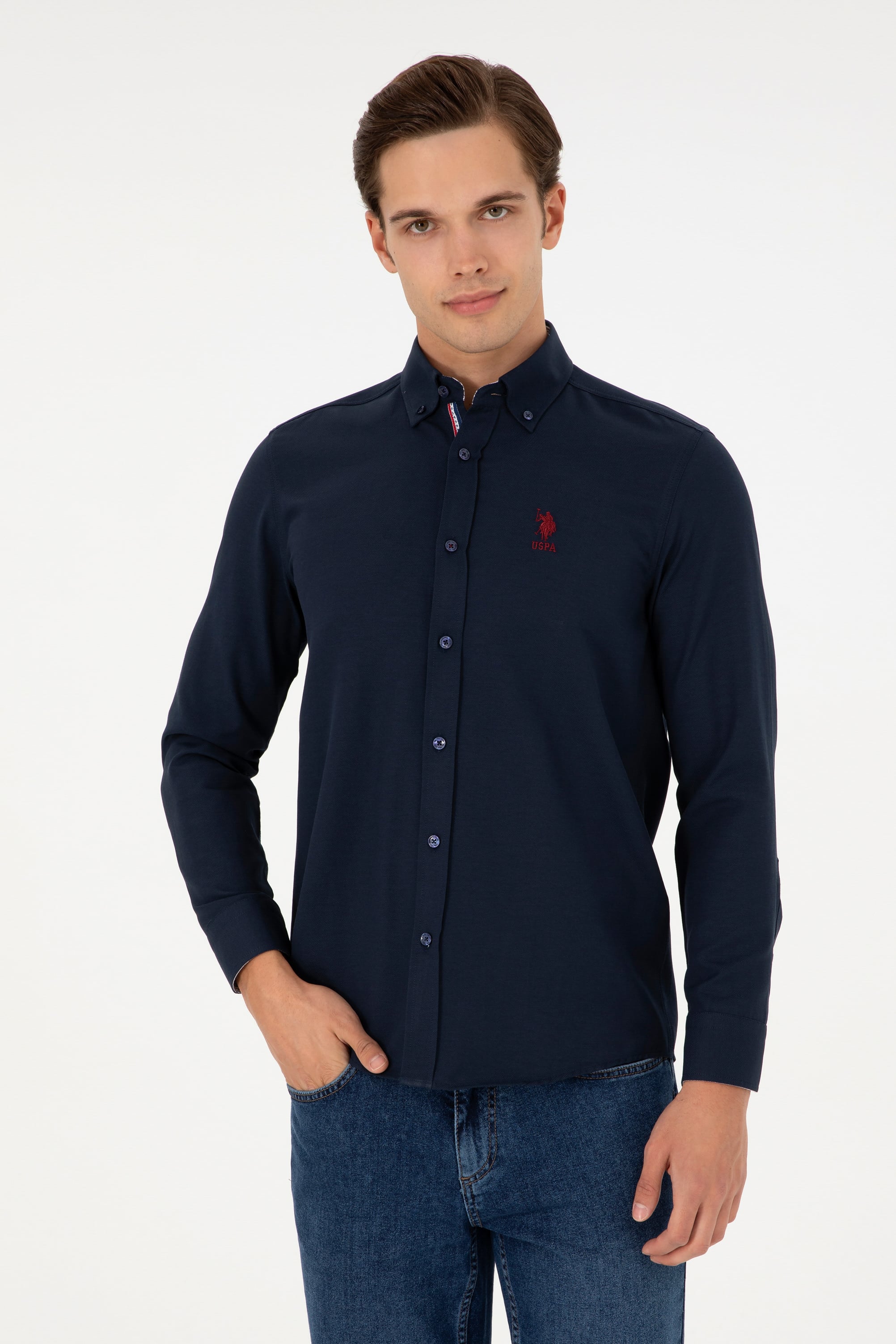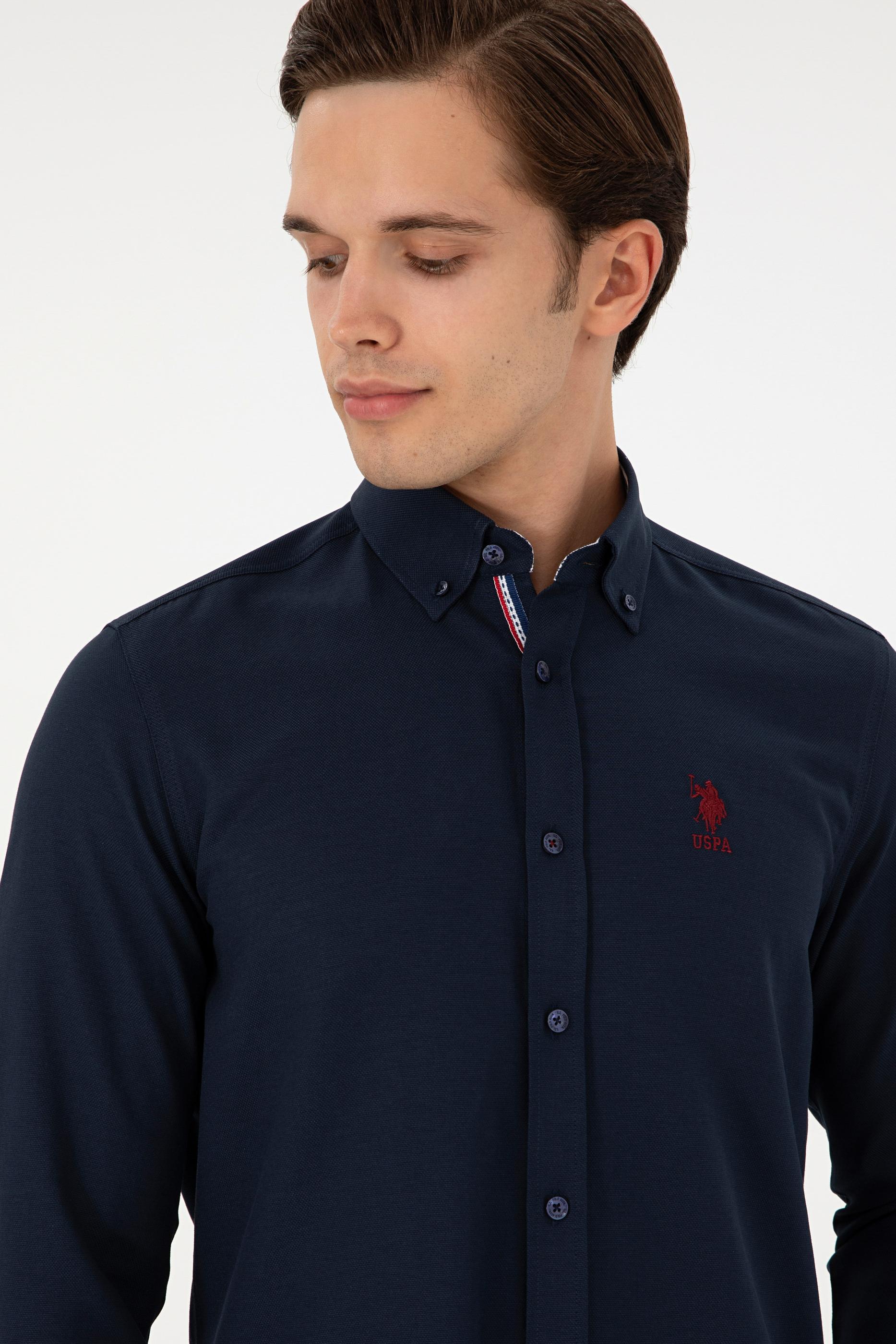 Gömleğin düz lacivert rengi, sade ama etkileyici bir görünüm sağlar. Her türlü kombinle kolayca uyum sağlayabilecek renk, gündüzden geceye rahatlıkla geçiş yapabilecek bir şıklık sunar. Yaka ve kol içlerinde kullanılan garnili kurumsal şerit detayları ise gömleğe şık dinamizm katar. Detaylar, hem profesyonel ortamlarda hem de günlük kullanımda dikkat çekici bir dokunuş eklerken, gömleğin genel sadeliğine modern bir hava katar. Düğmeli yakası ise klasik erkek giyim tarzını öne çıkaran parçayı, daha formal ortamlarda da rahatlıkla kullanılabilir hale getirir.