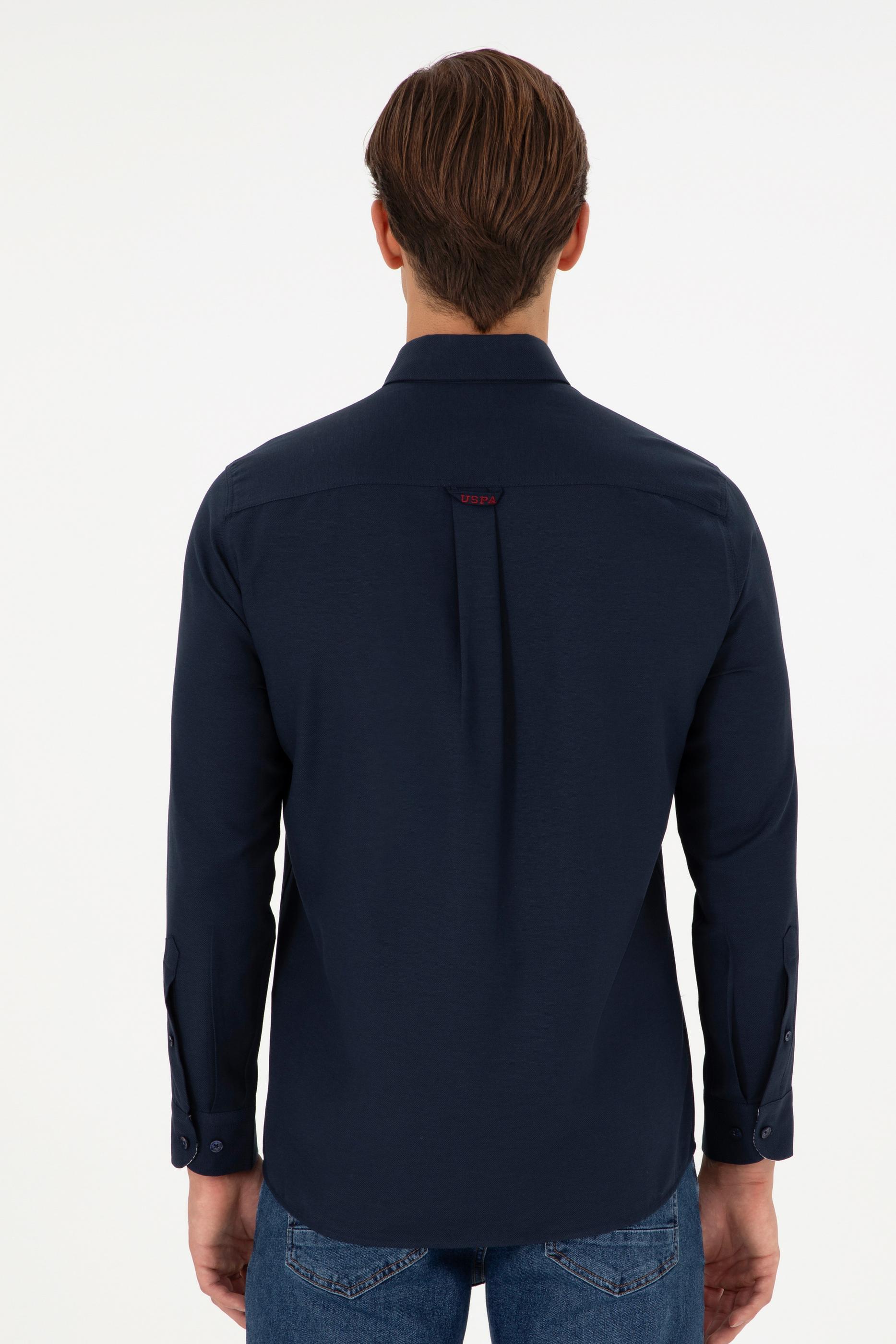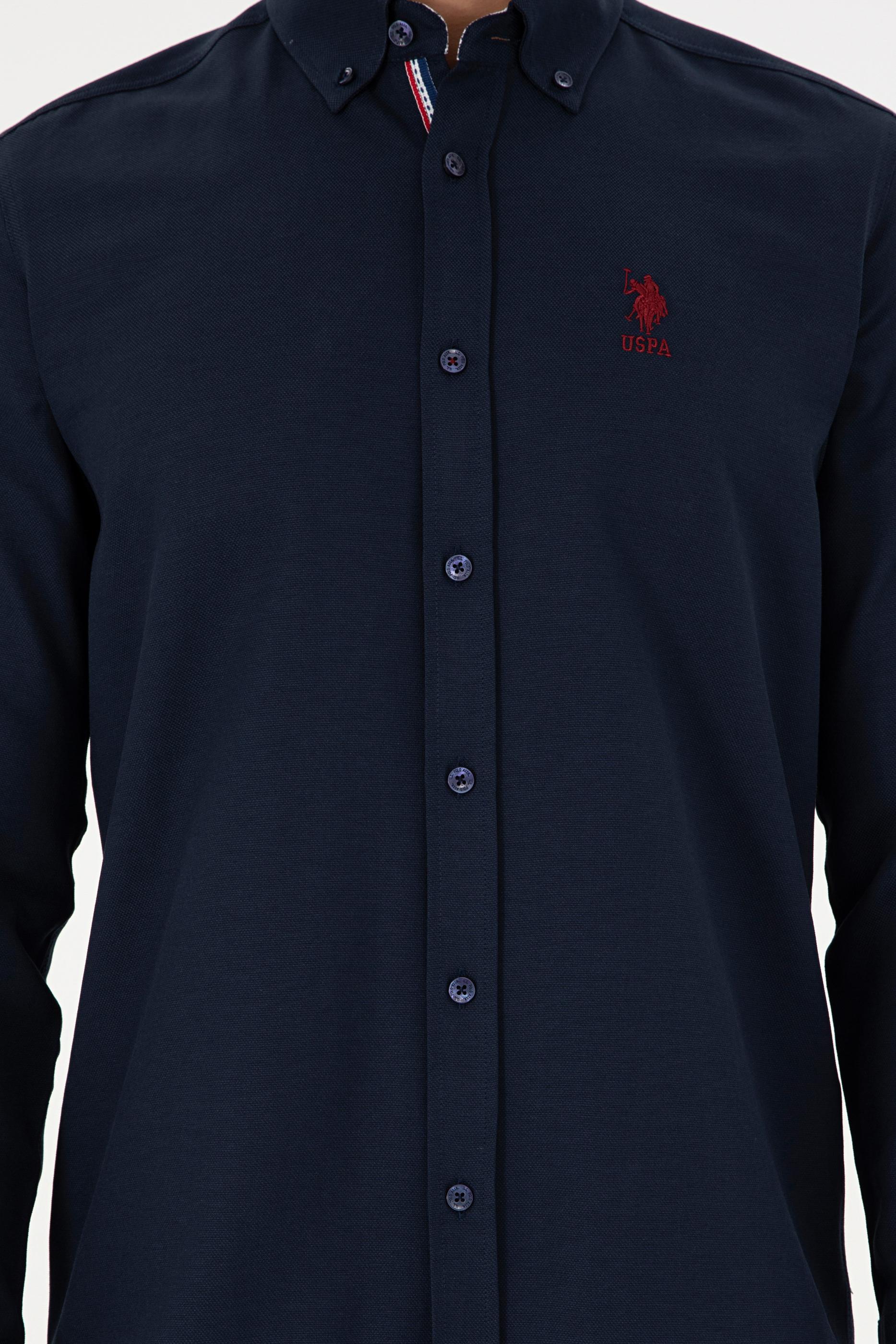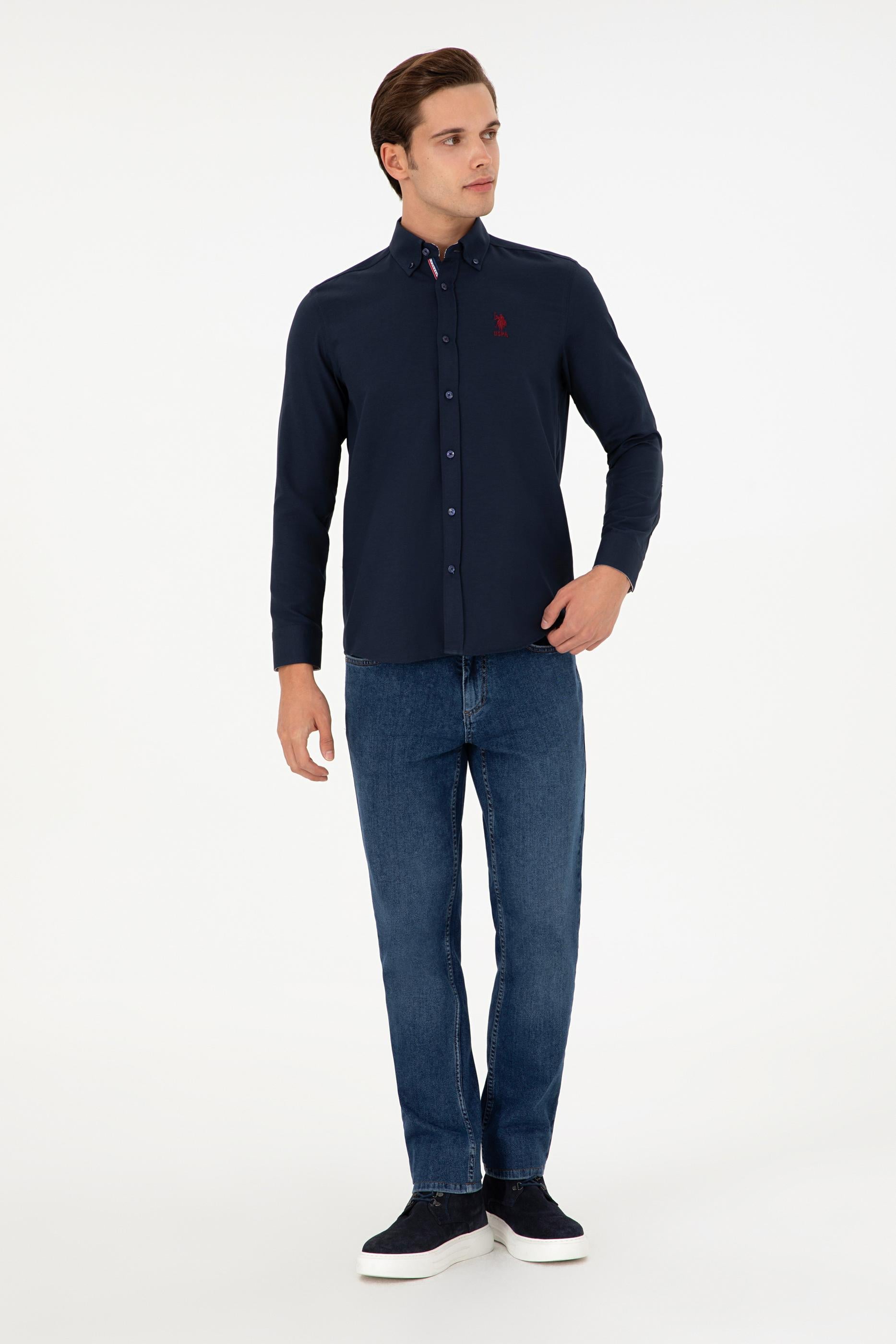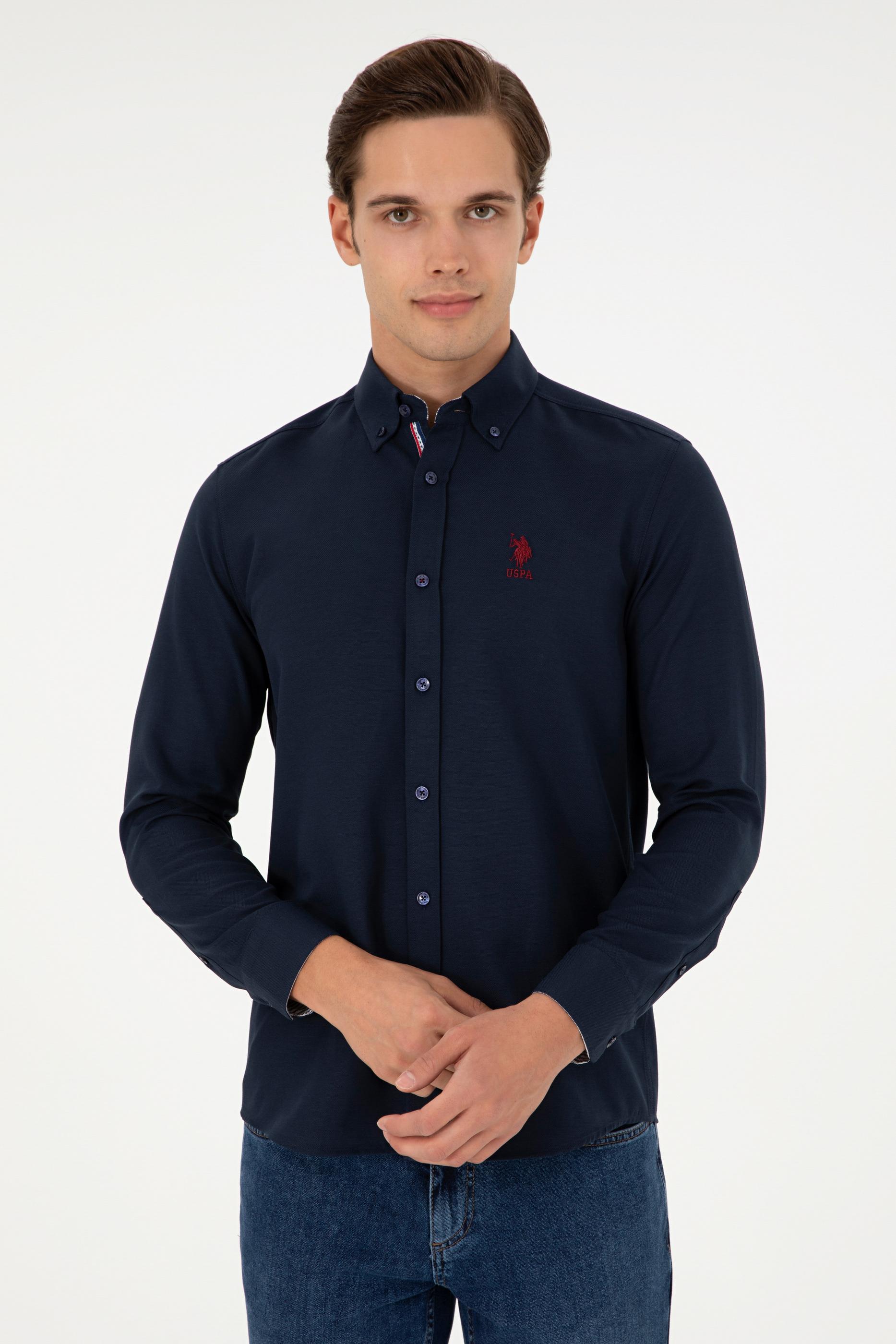 Gömleğin düz lacivert rengi, sade ama etkileyici bir görünüm sağlar. Her türlü kombinle kolayca uyum sağlayabilecek renk, gündüzden geceye rahatlıkla geçiş yapabilecek bir şıklık sunar. Yaka ve kol içlerinde kullanılan garnili kurumsal şerit detayları ise gömleğe şık dinamizm katar. Detaylar, hem profesyonel ortamlarda hem de günlük kullanımda dikkat çekici bir dokunuş eklerken, gömleğin genel sadeliğine modern bir hava katar. Düğmeli yakası ise klasik erkek giyim tarzını öne çıkaran parçayı, daha formal ortamlarda da rahatlıkla kullanılabilir hale getirir.