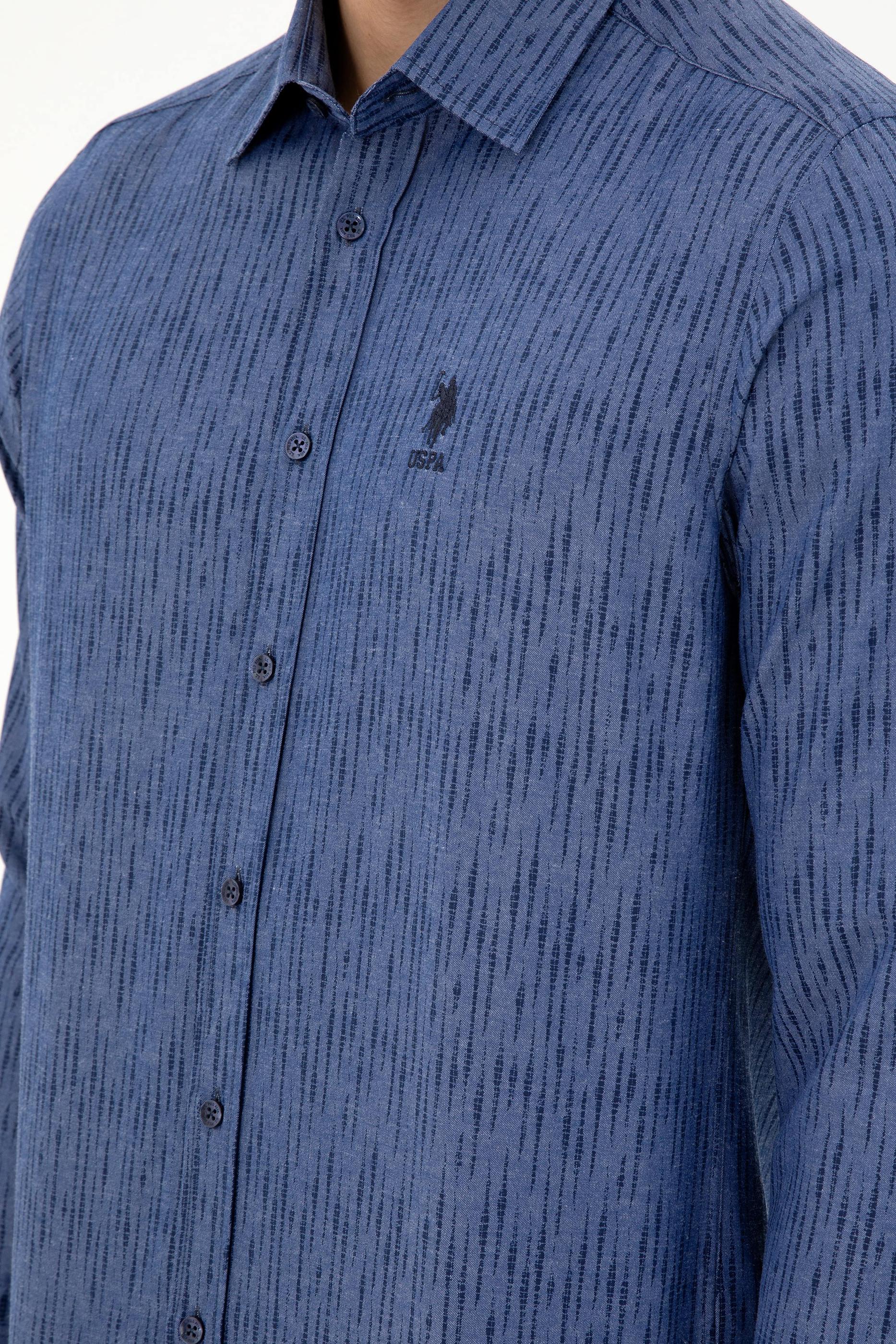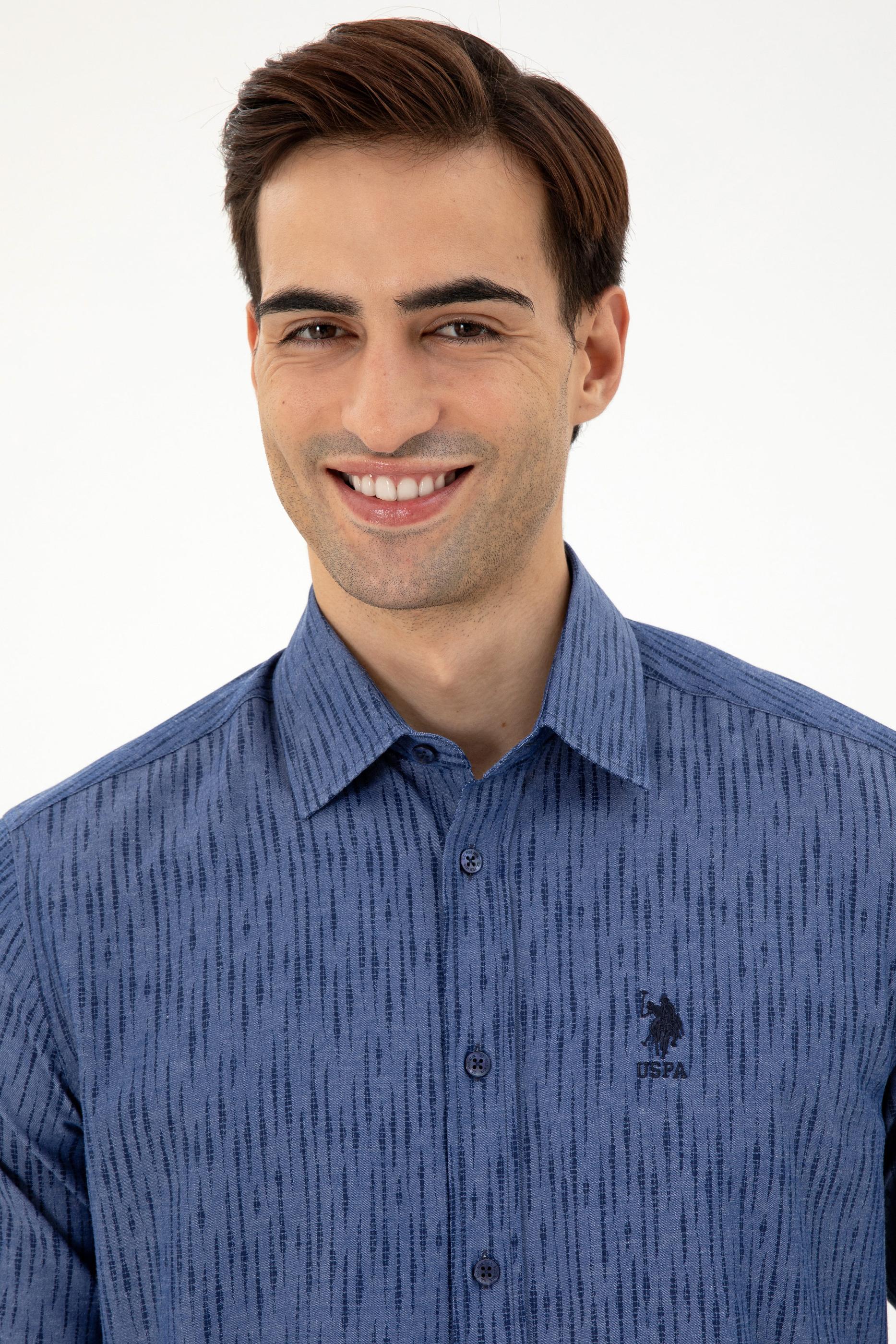 Gömlek, lacivert renk üzerine siyah çizgili bir desenle tasarlanmış olup şık görünüme sahiptir. Çizgilerin ince ve düzenli dağılımı, tasarımda göz yormayan ancak dikkat çekici bir estetik sağlamaktadır. Düz kesim hatları, regular fit yapısı ile birleşerek vücuda oturur ancak fazla sıkmaz, hareket özgürlüğü sunmaktadır. Düğmeli kapama sistemiyle işlevsellik kazandırılmış olan gömlek, günlük kullanımda rahatlık ve pratiklik sağlar. Polyester içeriği, kumaşın kırışmasını önler ve uzun ömürlü bir kullanım sunar. Tasarımda yer alan düğmeler ise minimal ve gömleğin genel rengiyle uyumlu olacak şekilde seçilmiştir.