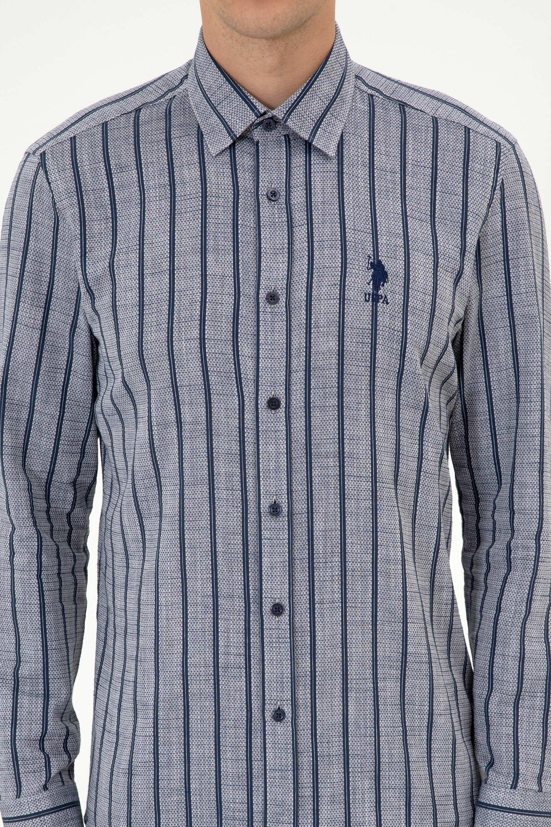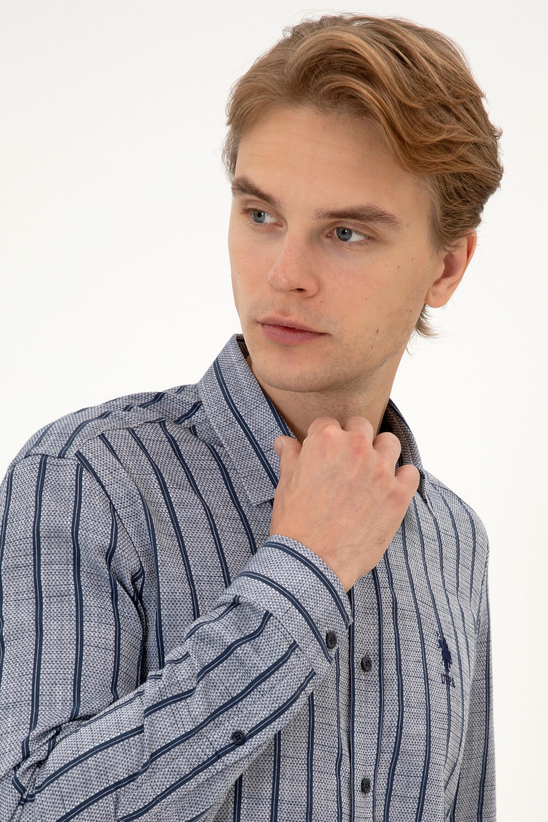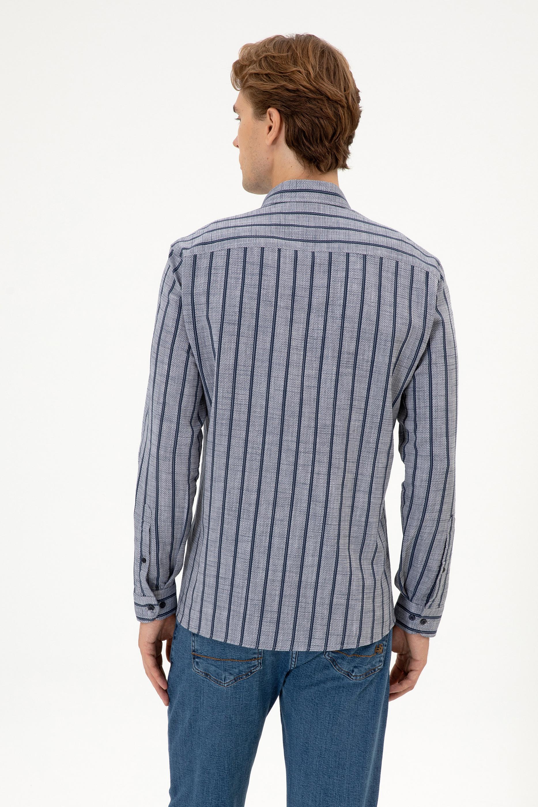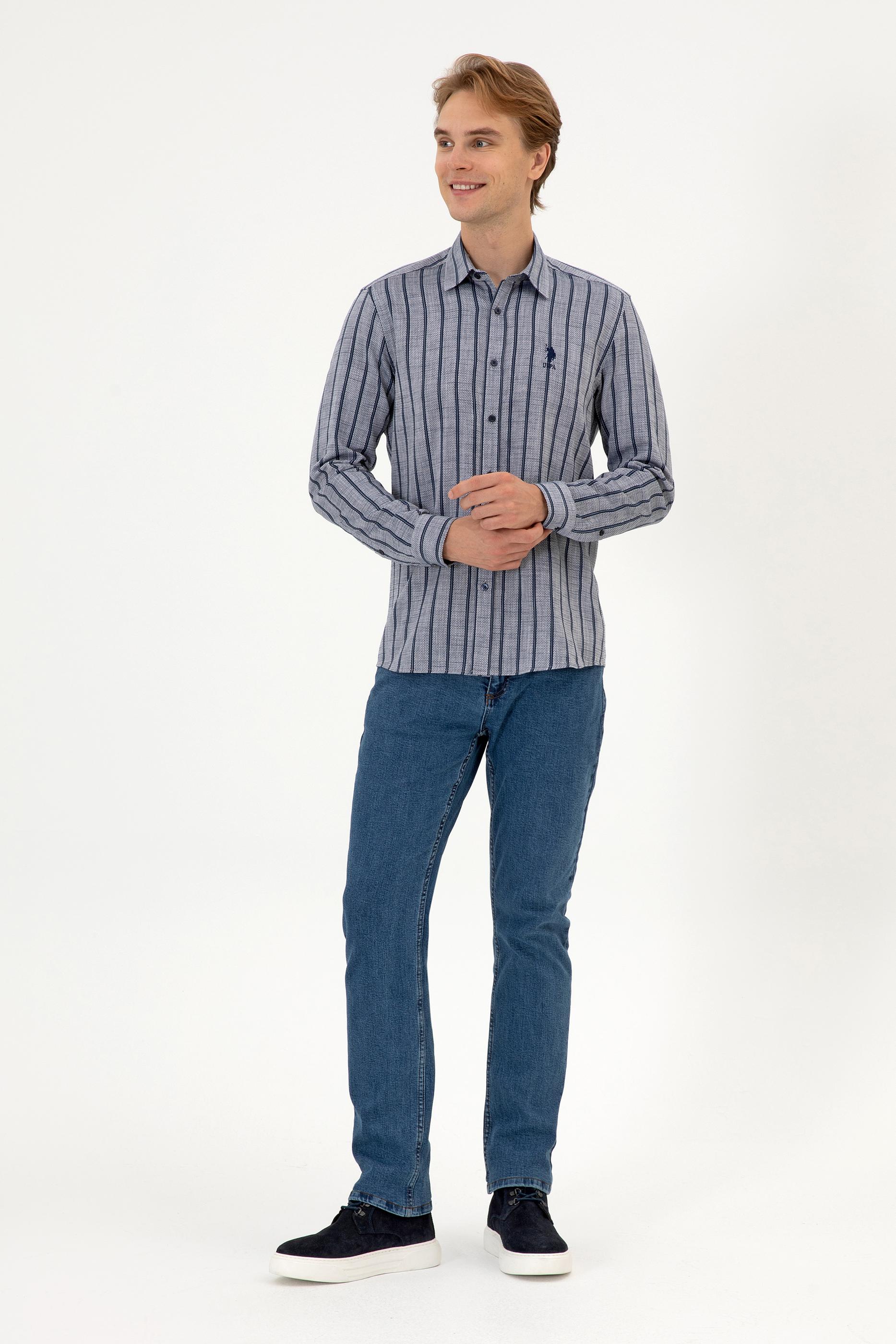Erkek gömlek, lacivert çizgili deseni ve slim fit kesimiyle modern ve zarif bir görünüm sunar. %100 pamuk dokuma kumaşı nefes alabilir yapısıyla gün boyu konfor sağlar ve cilde yumuşak bir his verir. Slim fit kalıbı vücudu hafifçe sararak fit bir görünüm kazandırır, aynı zamanda rahat hareket etme imkânı tanır. Polo yaka detayı gömleğe şık bir hava katar, uzun kollu tasarımı ise klasik duruşu tamamlar. Düğmeli kapama sistemi pratik kullanım sağlarken, çizgili desen yapısı modeli daha dinamik ve dikkat çekici hale getirir. Jean, chino veya klasik pantolonlarla kombinlenebilen bu gömlek; iş yaşamında, günlük kombinlerde ya da özel davetlerde şıklıkla tercih edilebilir. Gardırobun her dönem kullanılabilecek zamansız parçalarından biridir.