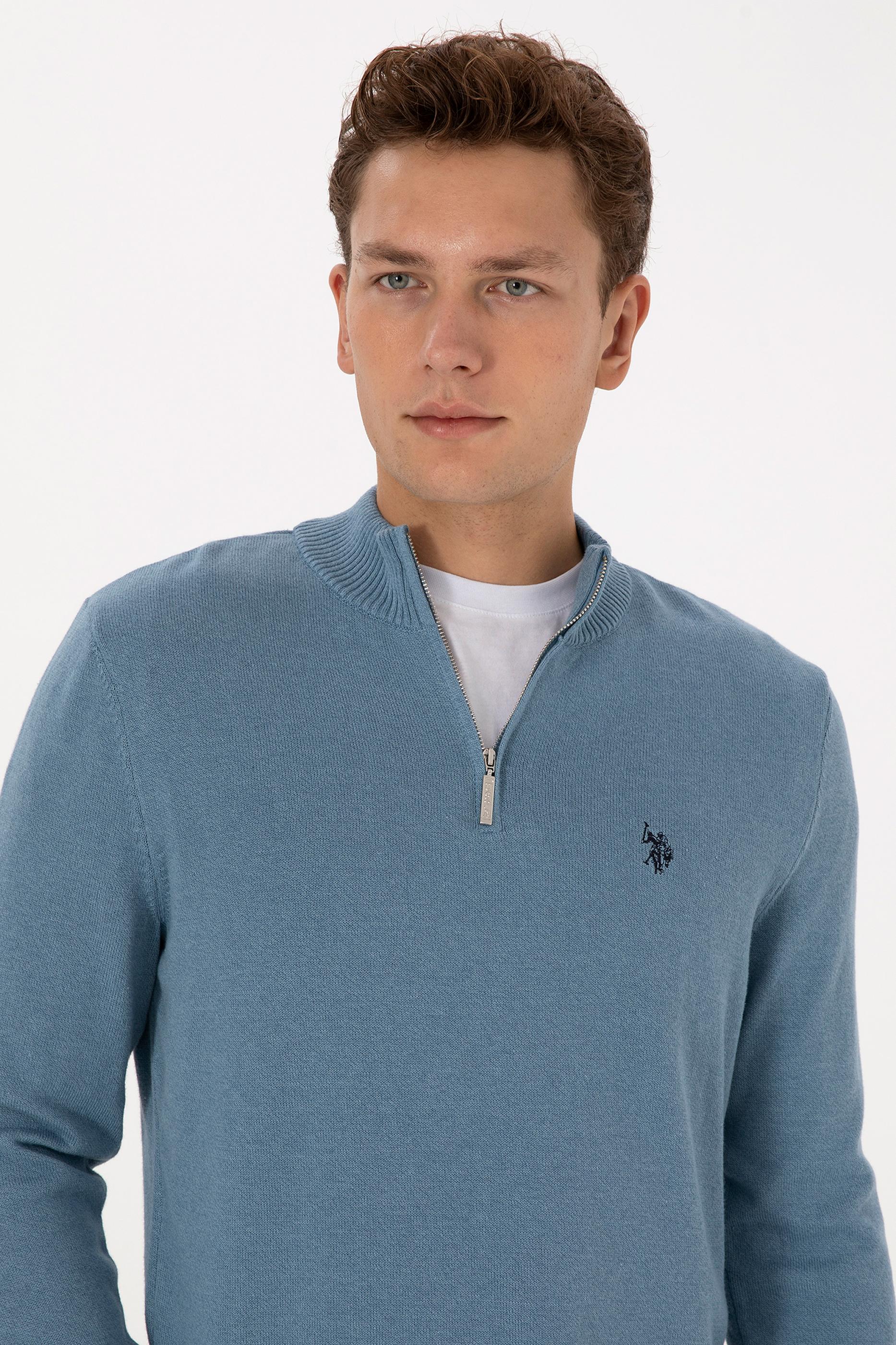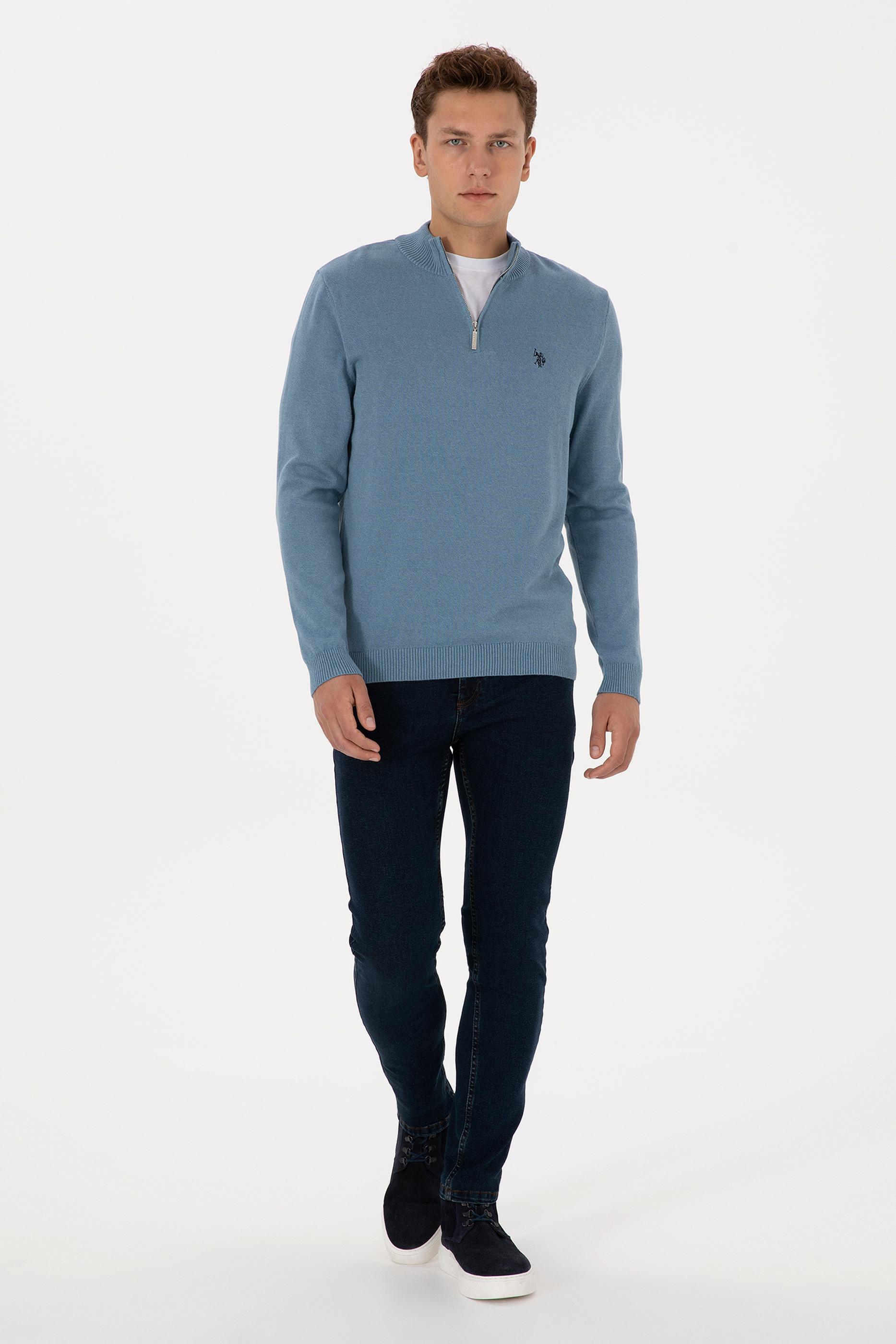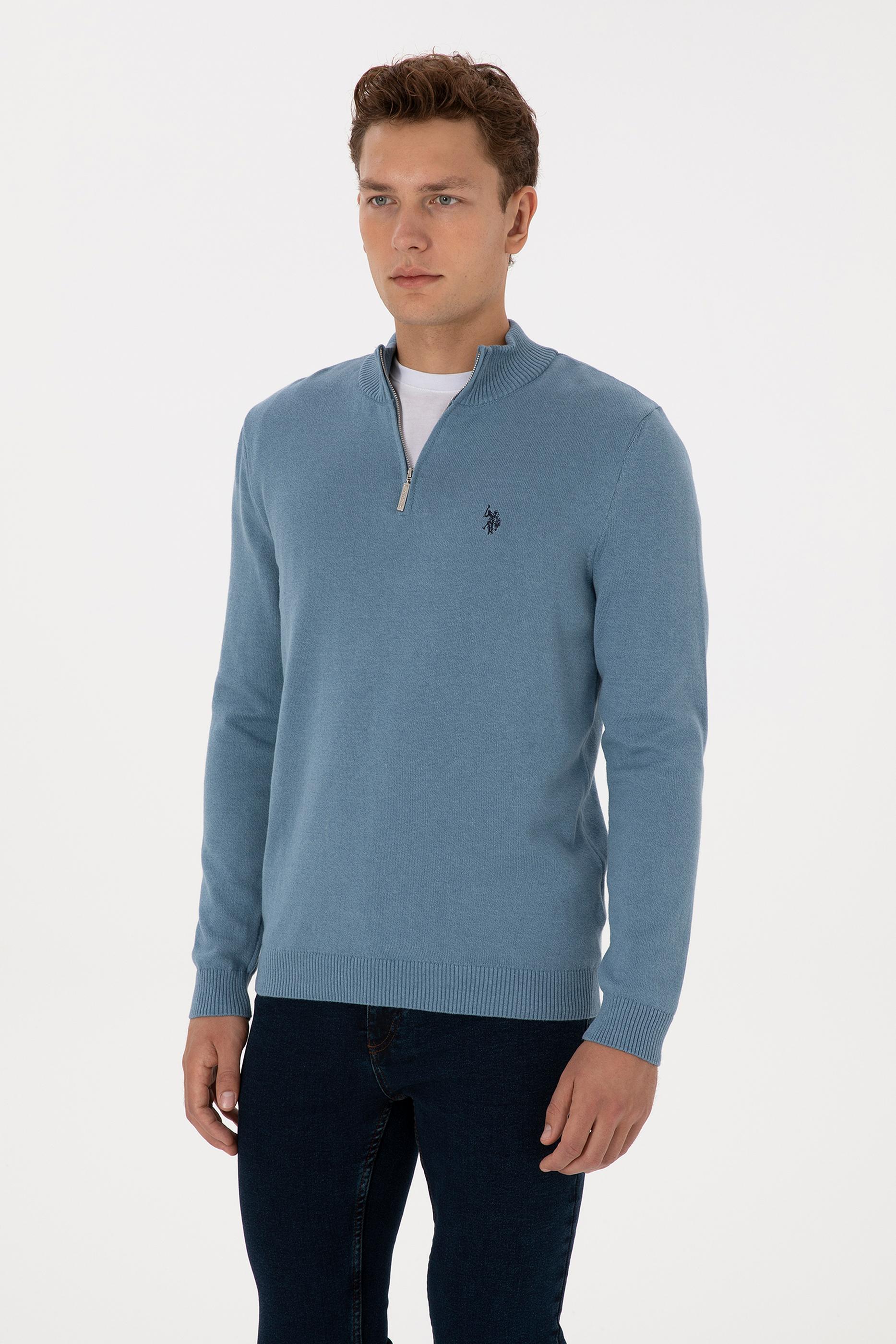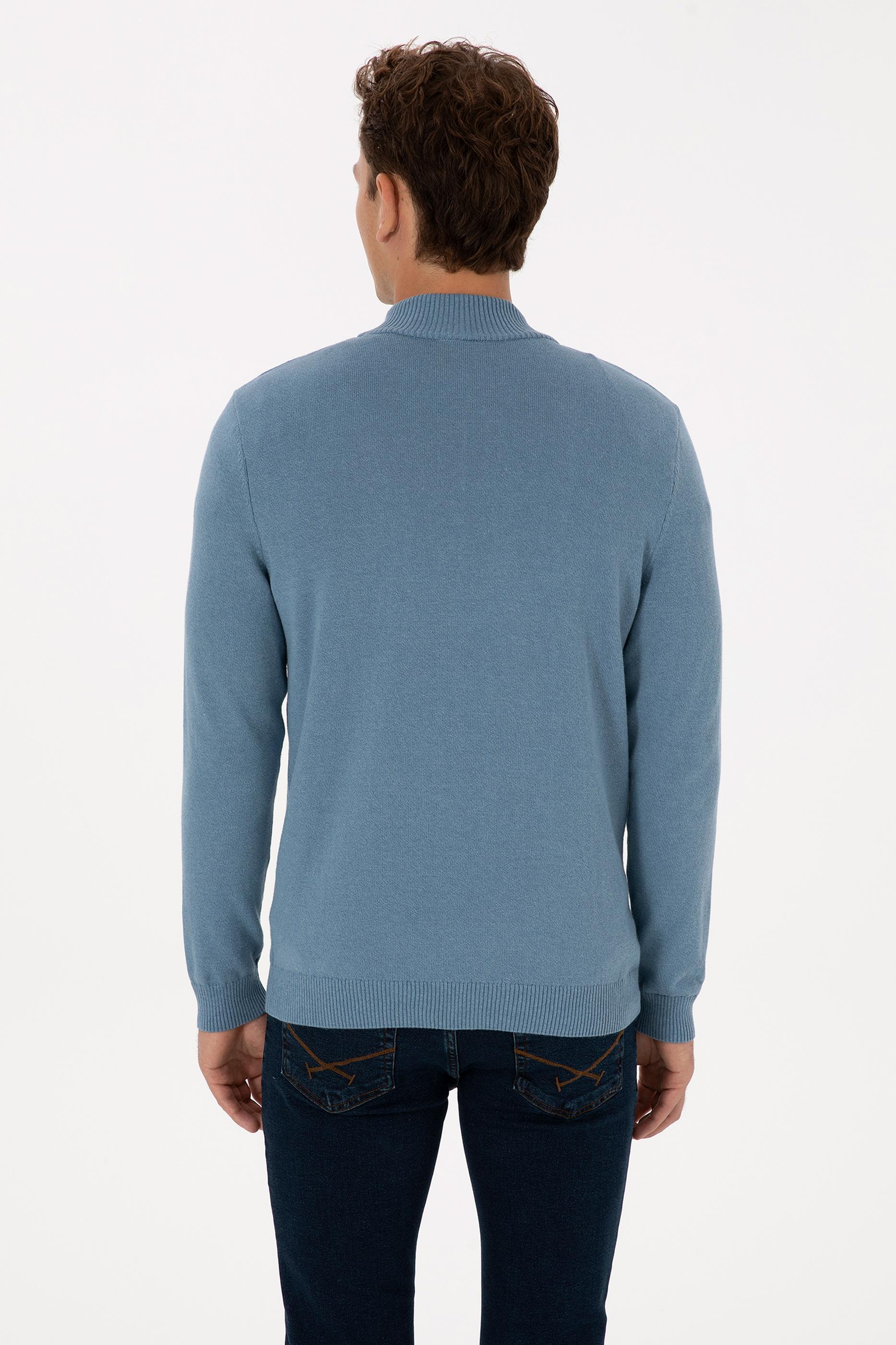 Erkek Slim Fit Yarım Fermuarlı Mavi Basic Kazak