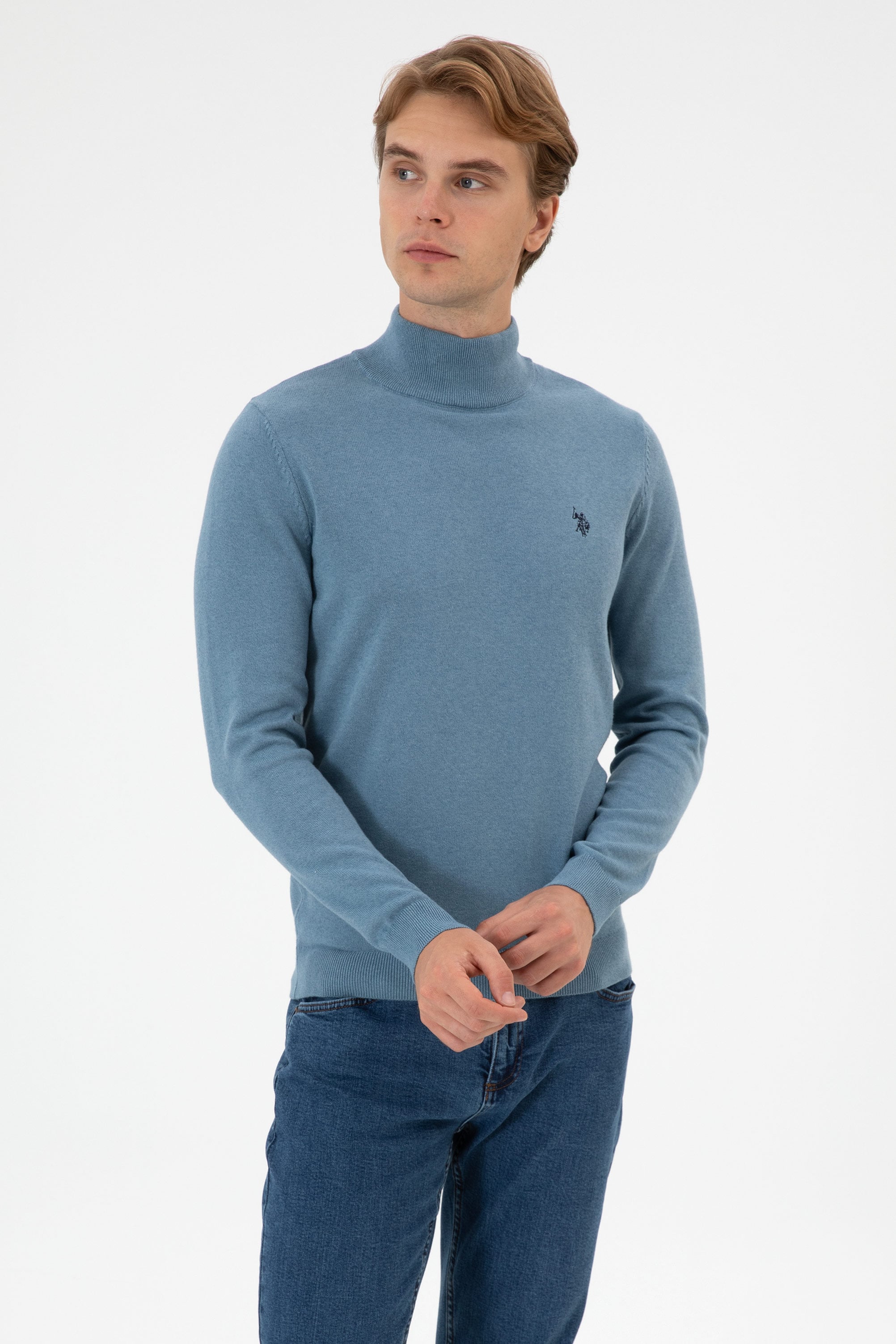 Erkek Slim Fit Boğazlı Mavi Basic Kazak