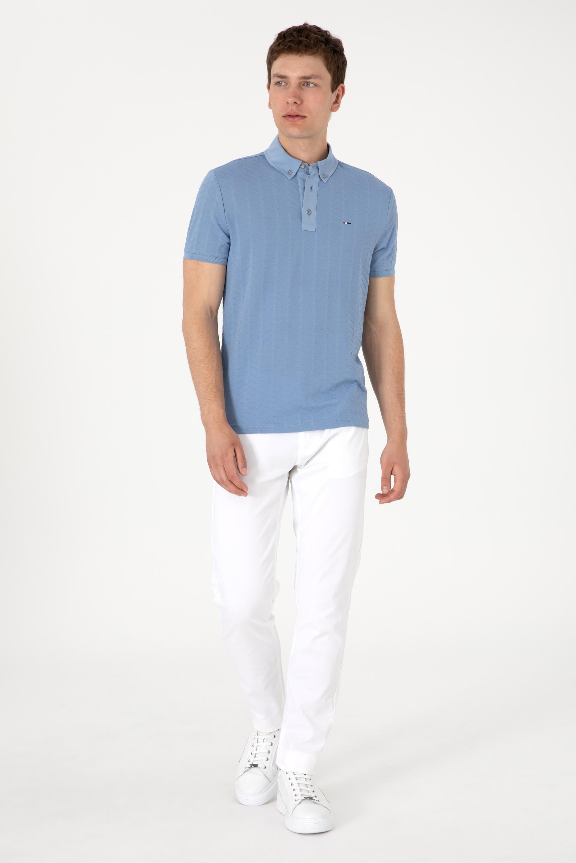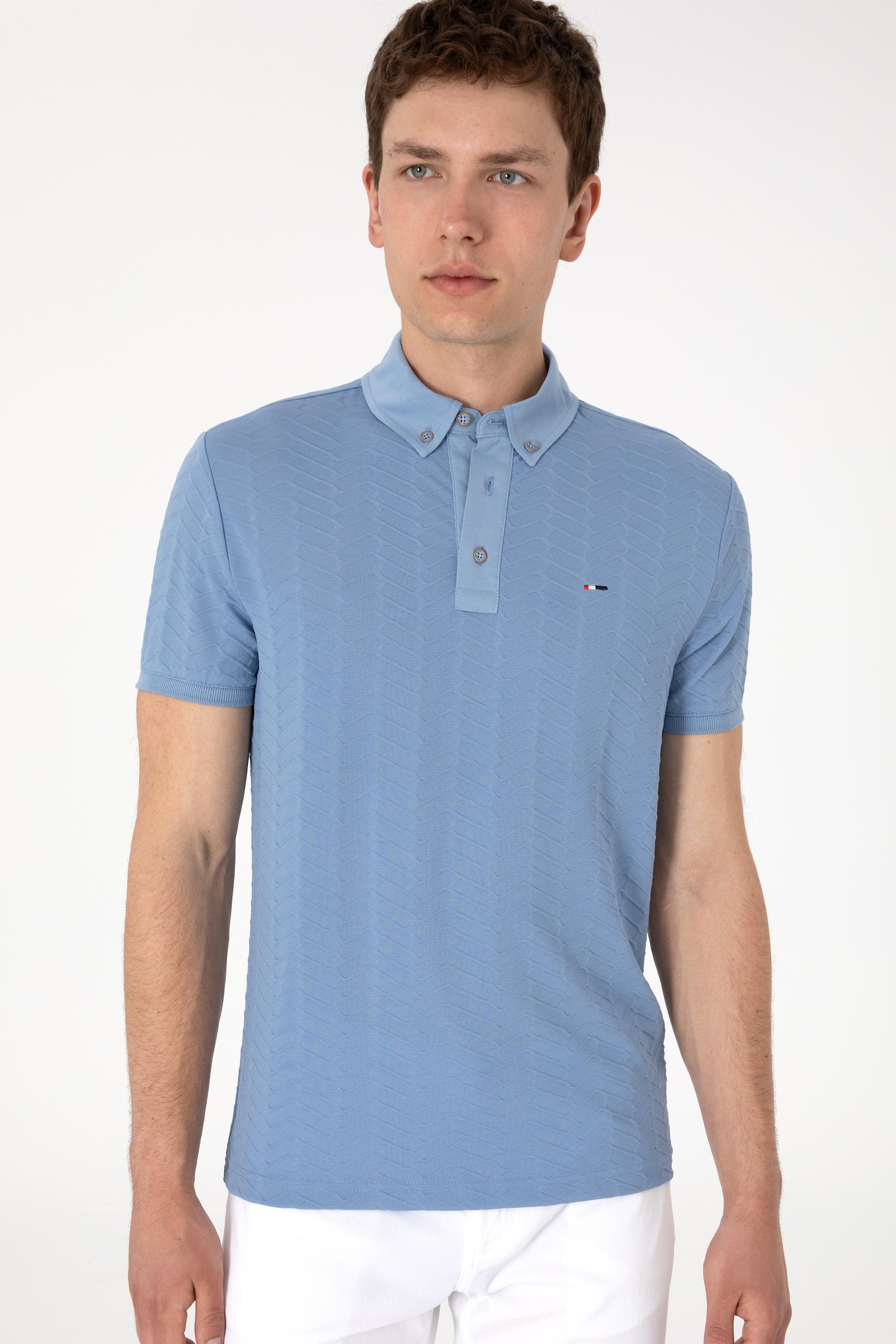 - Erkek Slim Fit Polo Yaka Mavi Dokulu Tişört