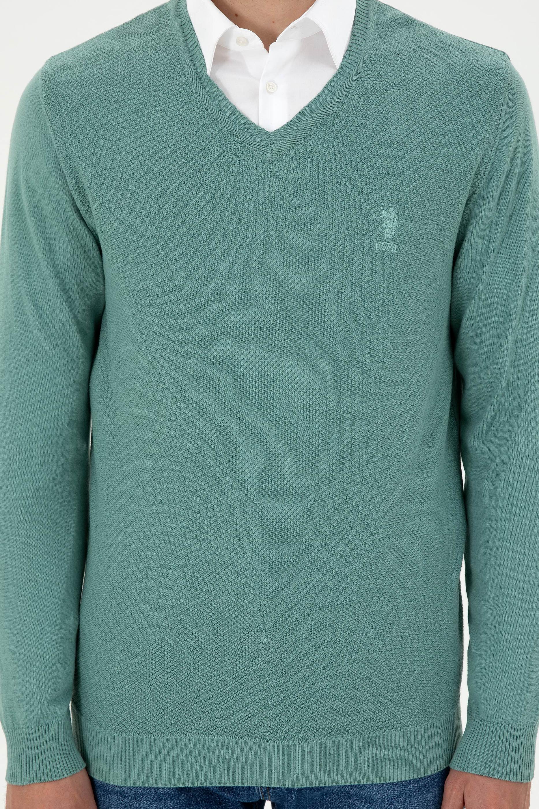 Erkek Slim Fit V Yaka Mint Basic Kazak