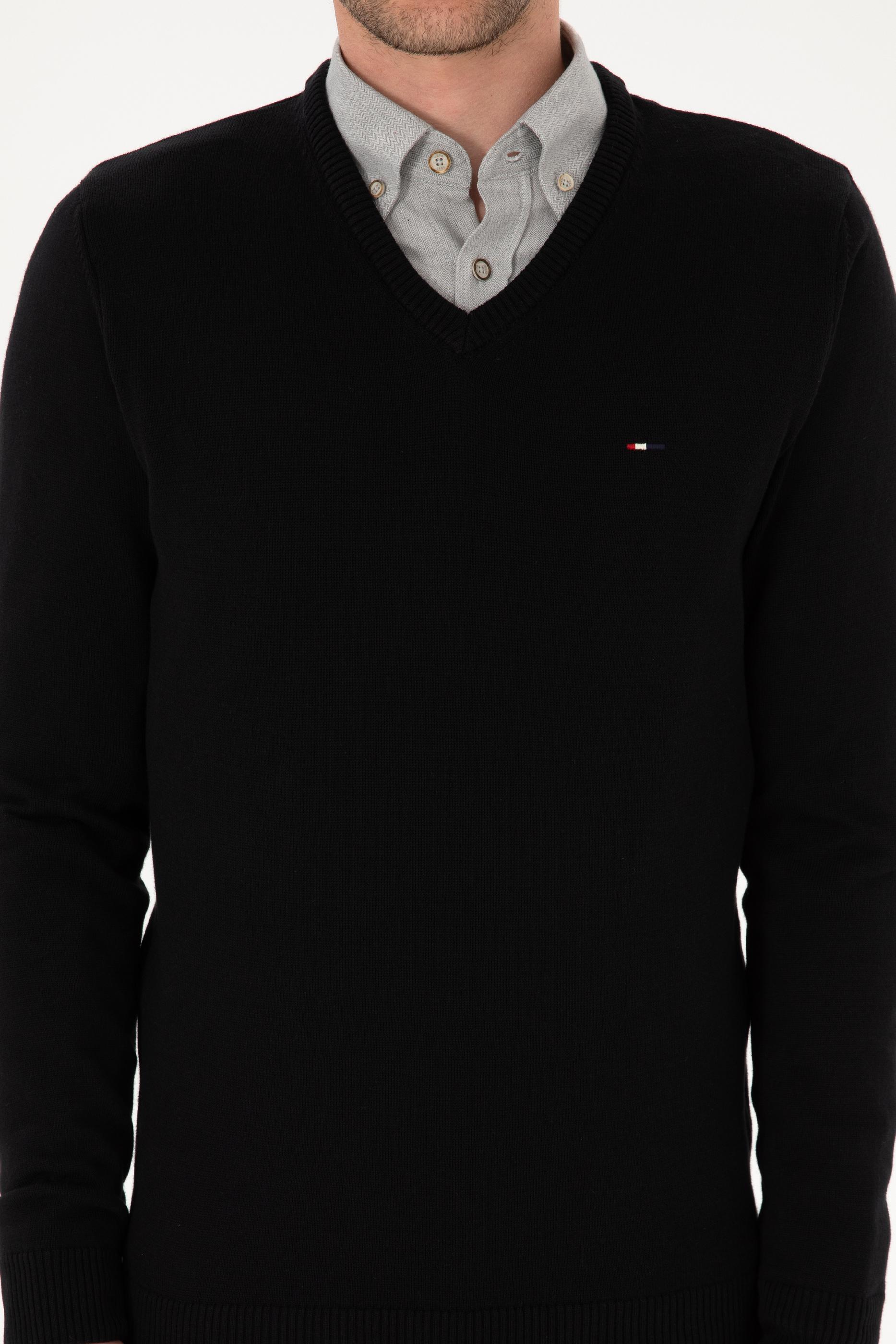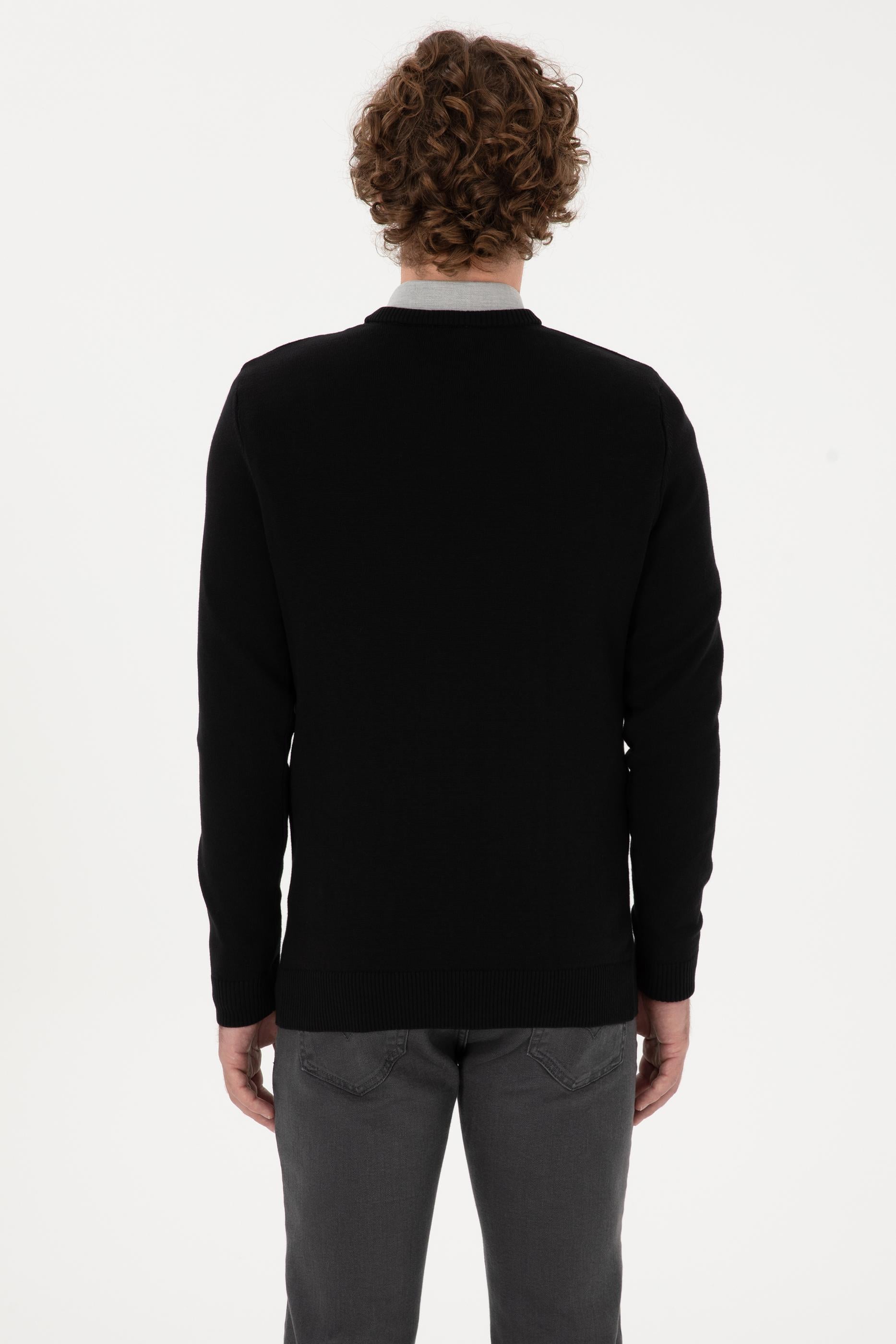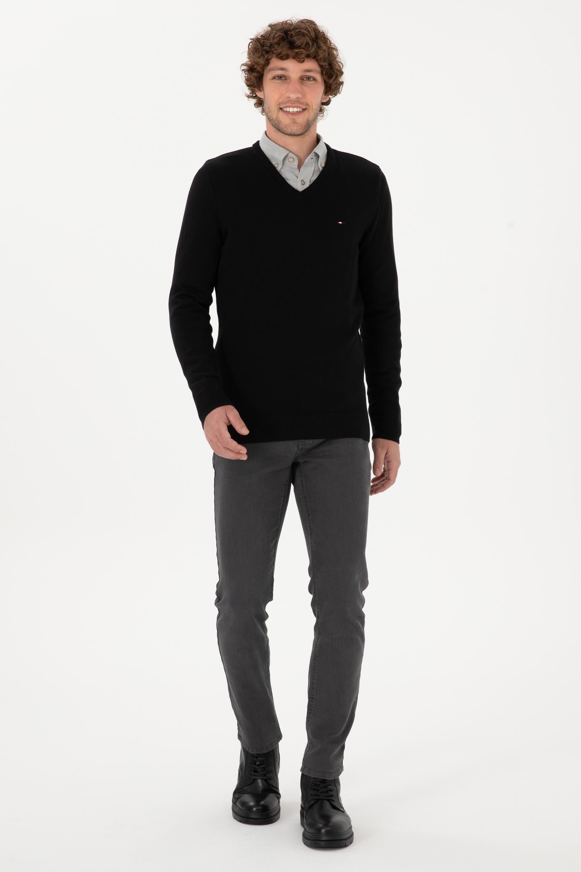 - Erkek Slim Fit V Yaka Siyah Basic Kazak
