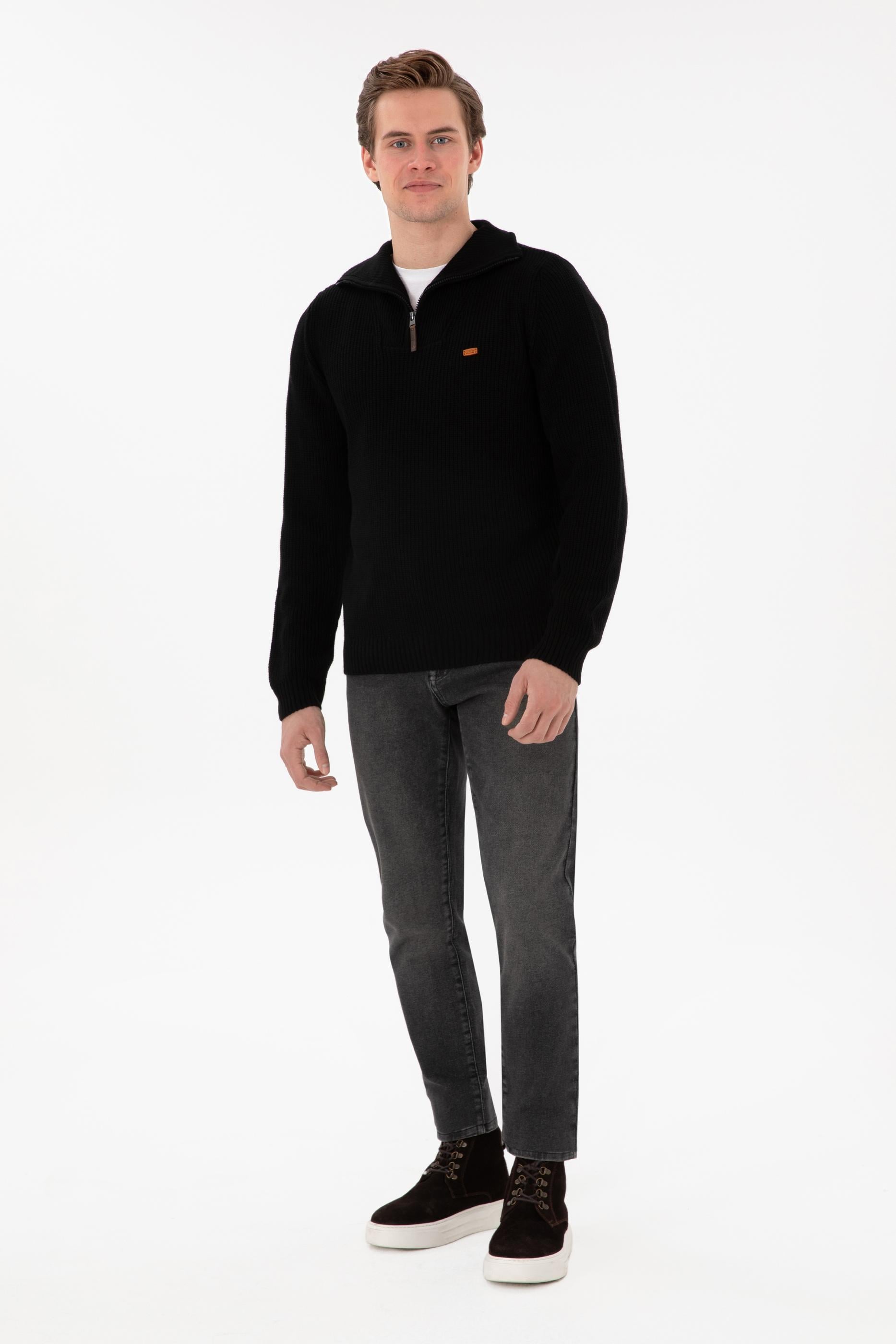 Erkek Regular Fit Yarım Fermuarlı Siyah Kazak