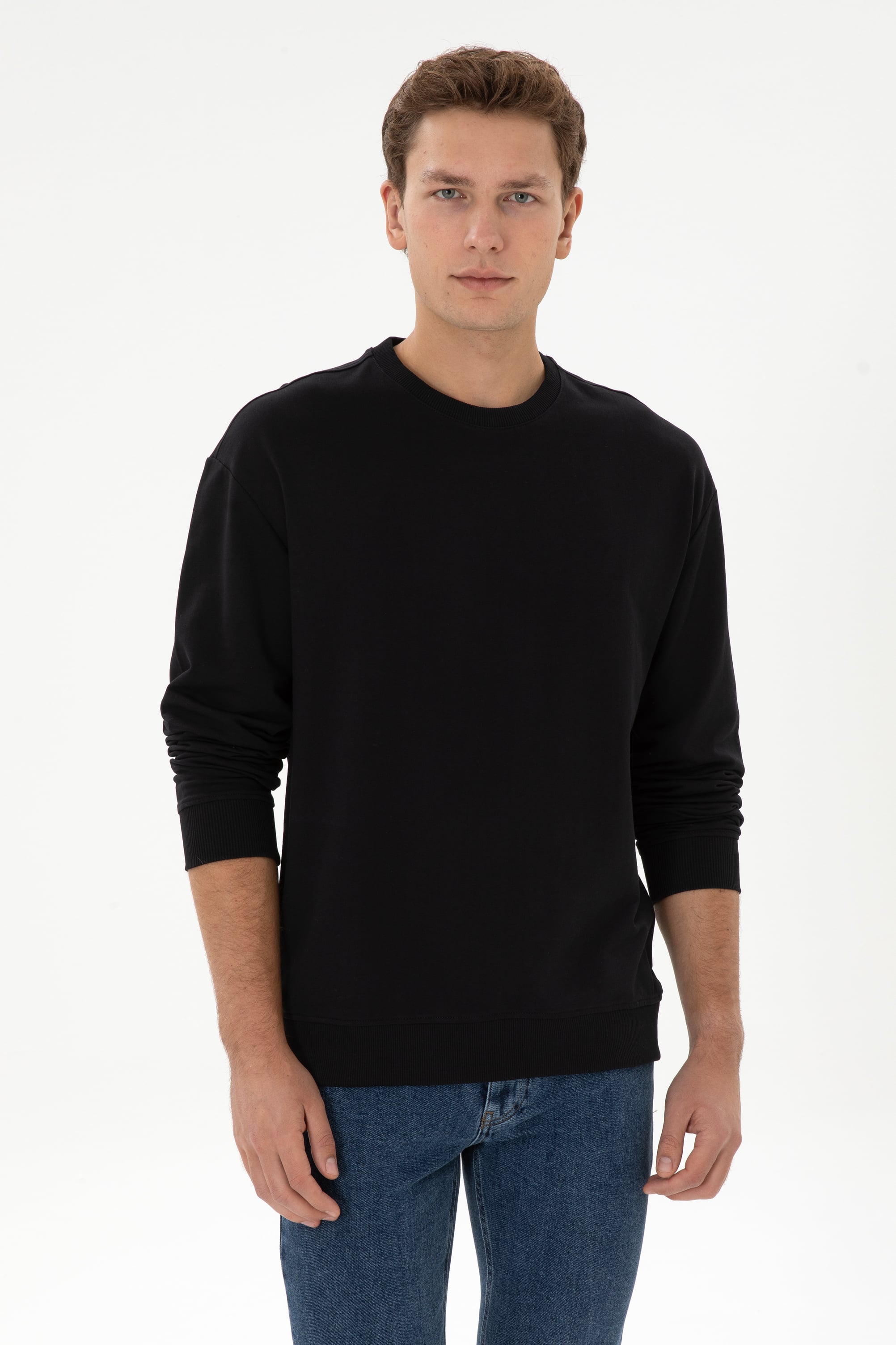 - Erkek Comfort Fit Bisiklet Yaka Siyah İnce Sweatshirt
