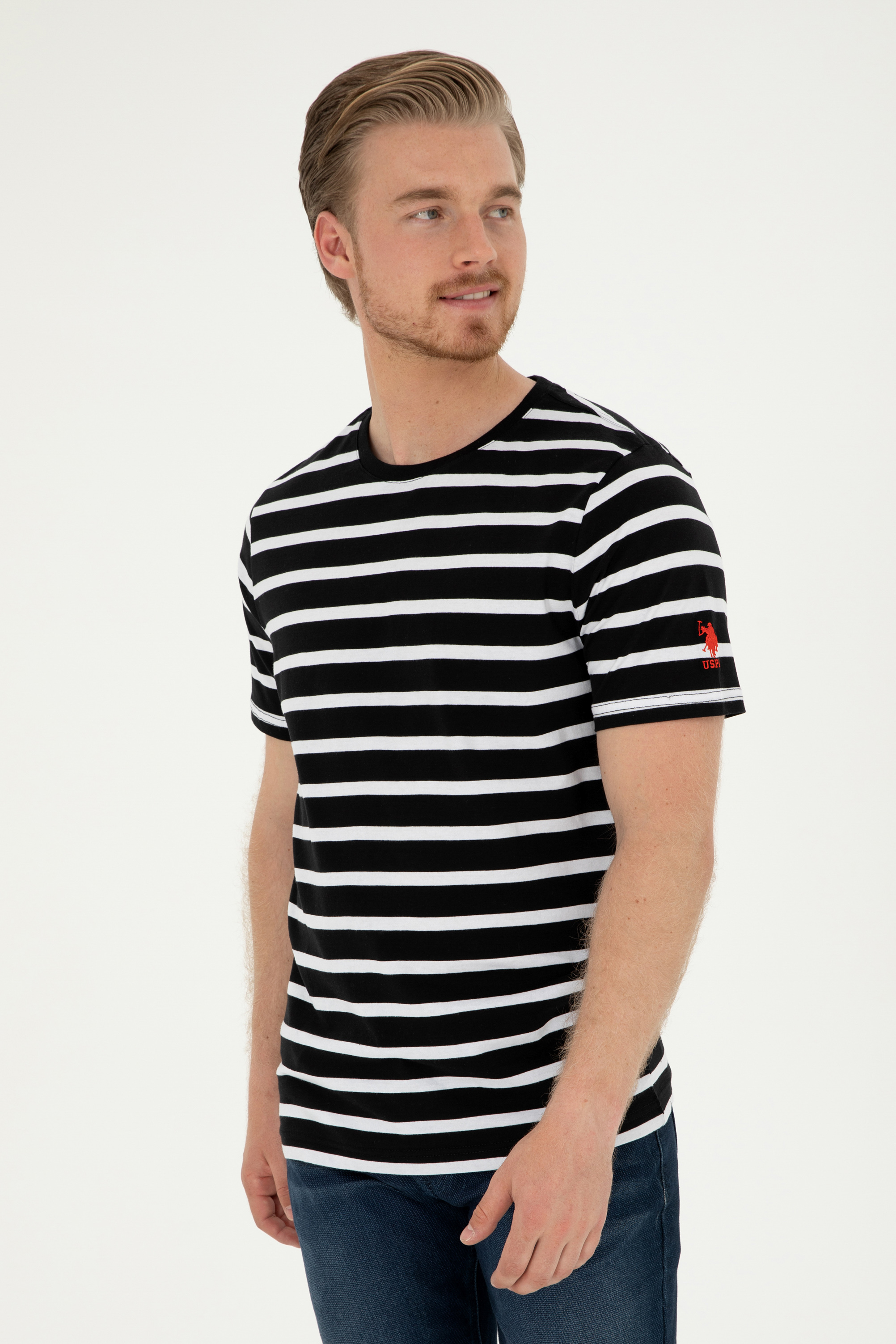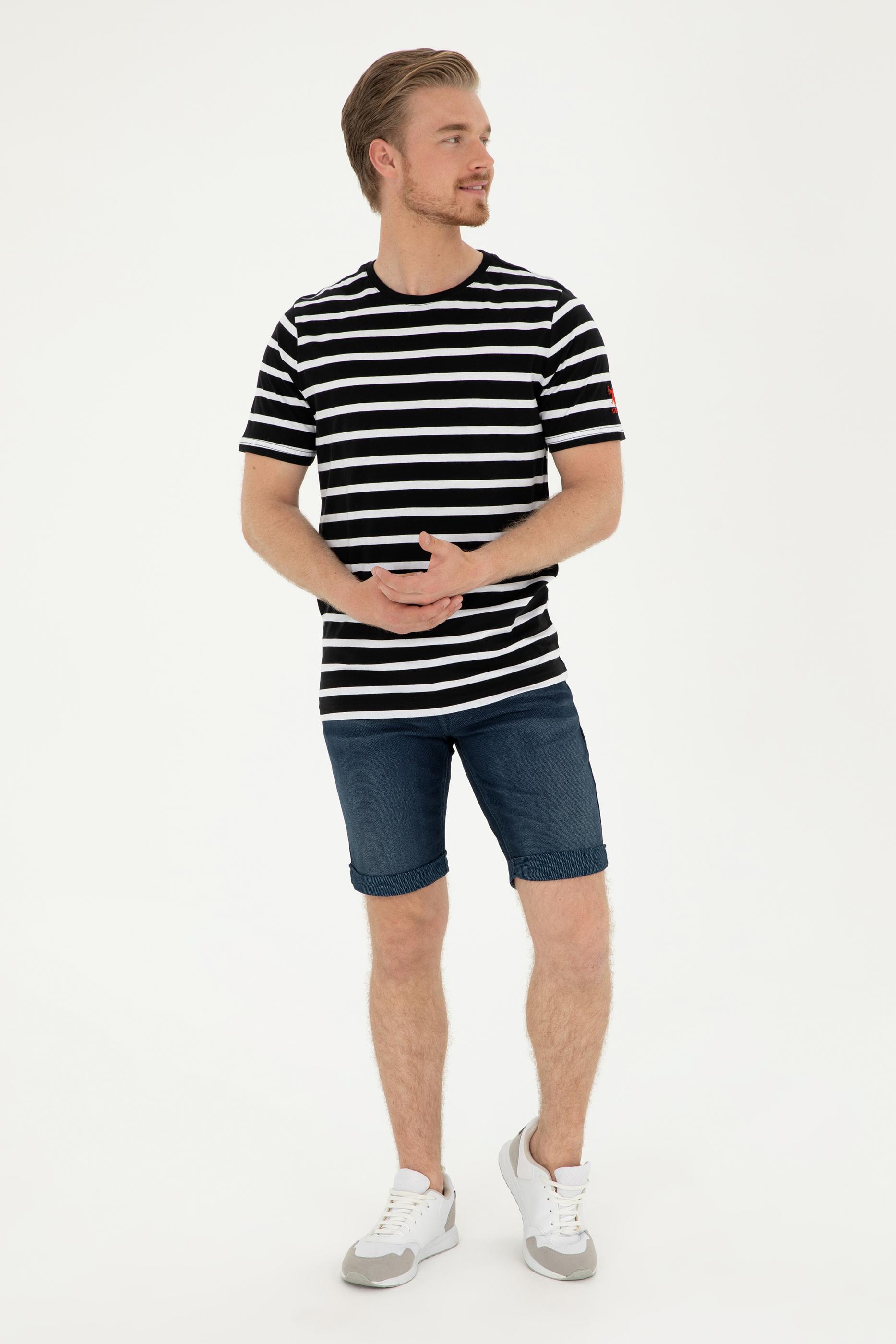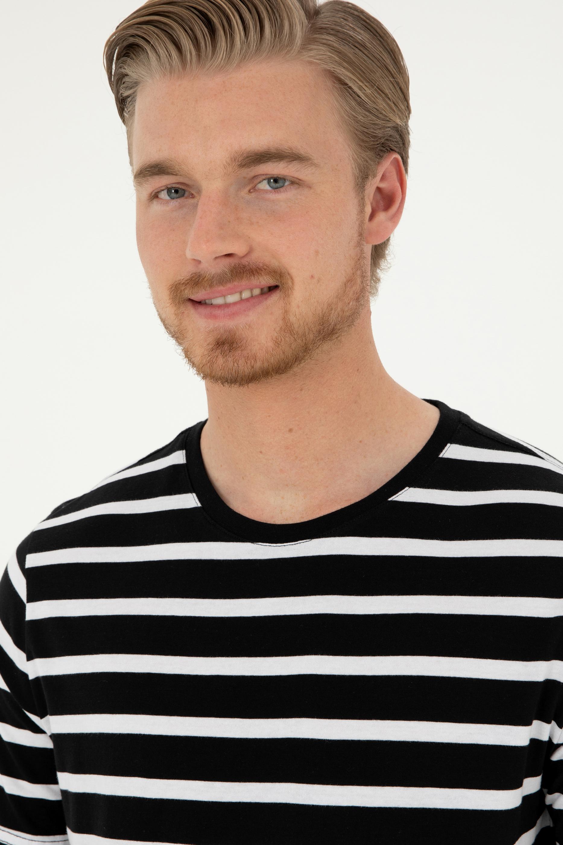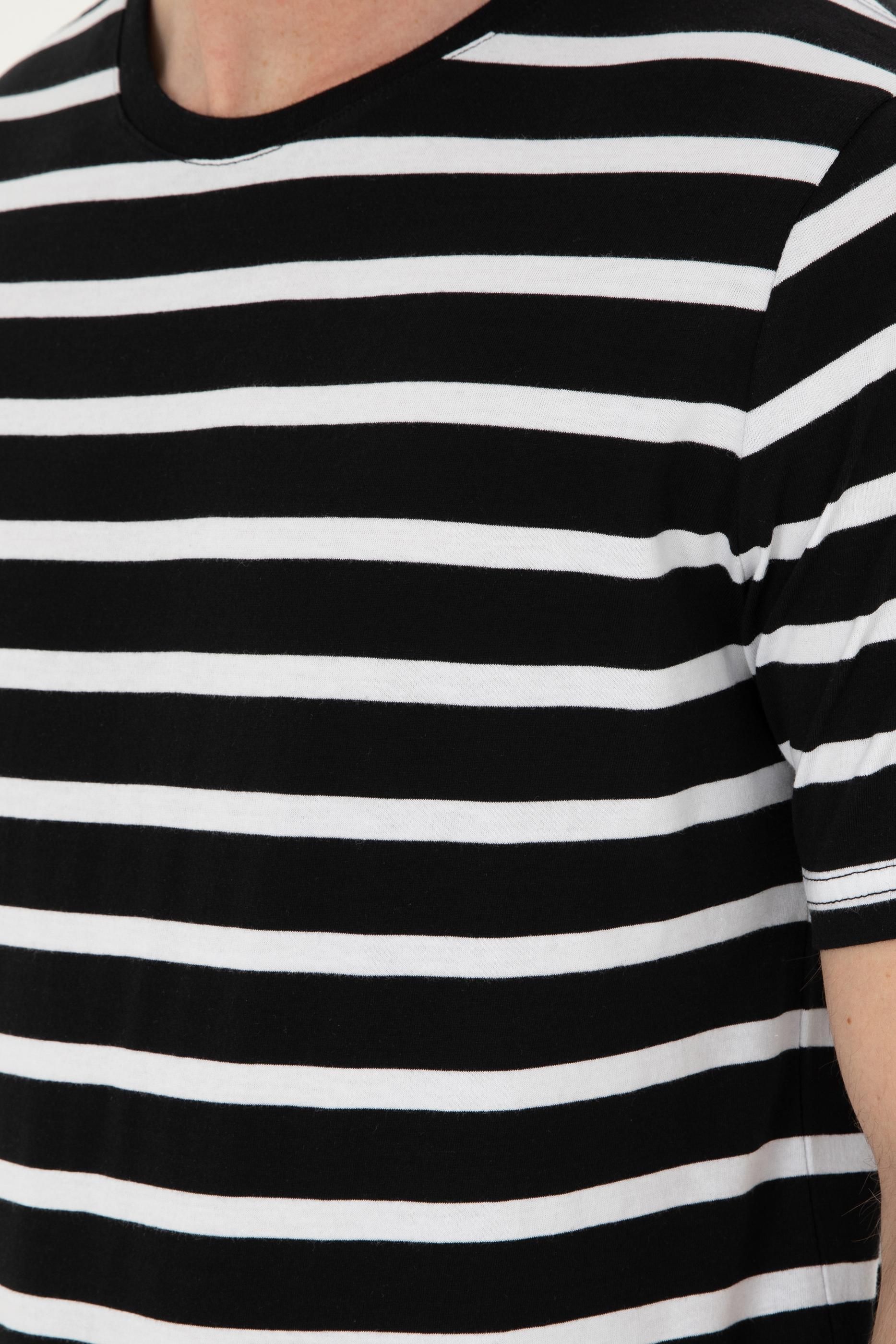 Bisiklet yaka erkek tişörtün en belirgin özelliği siyah ve beyazın muhteşem uyumu ile oluşan çizgili desenidir. Klasik ve modern tarzların kusursuz bir birleşimini yansıtan tişört, siyahın şık duruşu ve beyazın sadeliği bir araya gelerek göz alıcı bir görünüm yaratıyor. %100 pamuk kumaştan üretilmiş yapısı sıcak havalarda terlemeyi minimuma indirir ve serin kalmanızı sağlar.