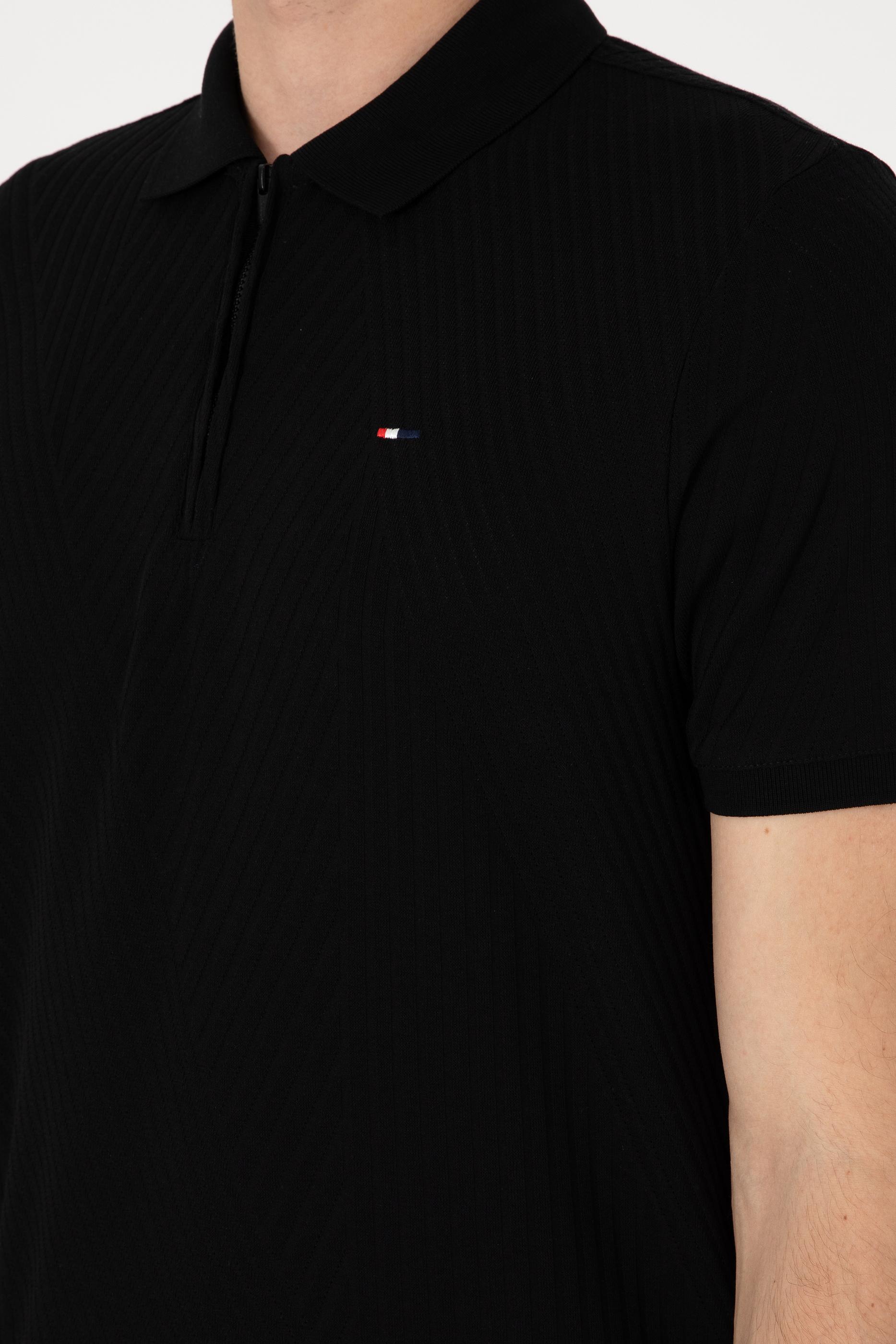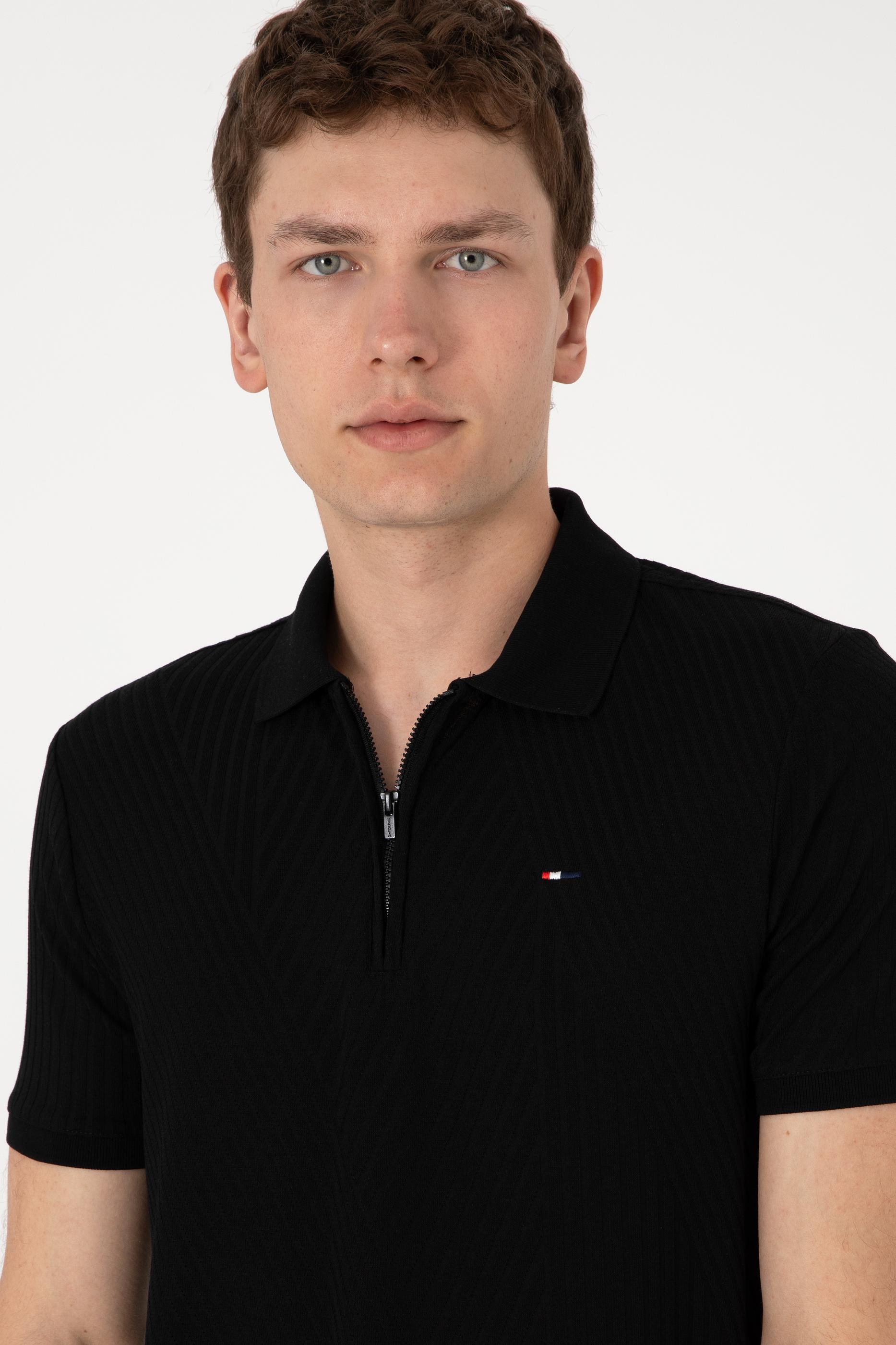 Erkek Regular Fit Fermuarlı Siyah Dokulu Tişört