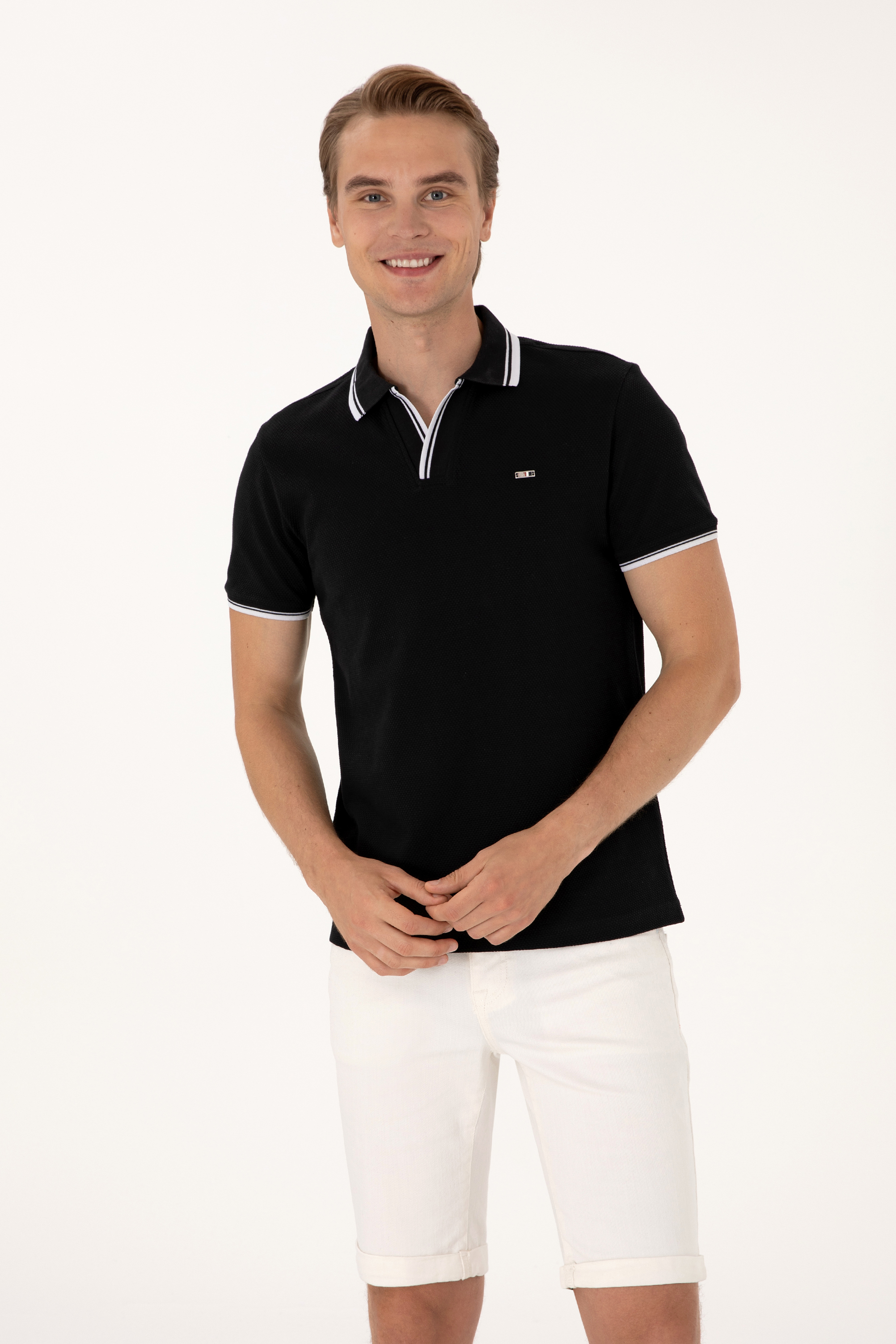 - Erkek Slim Fit Kaçık Yaka Siyah Tişört