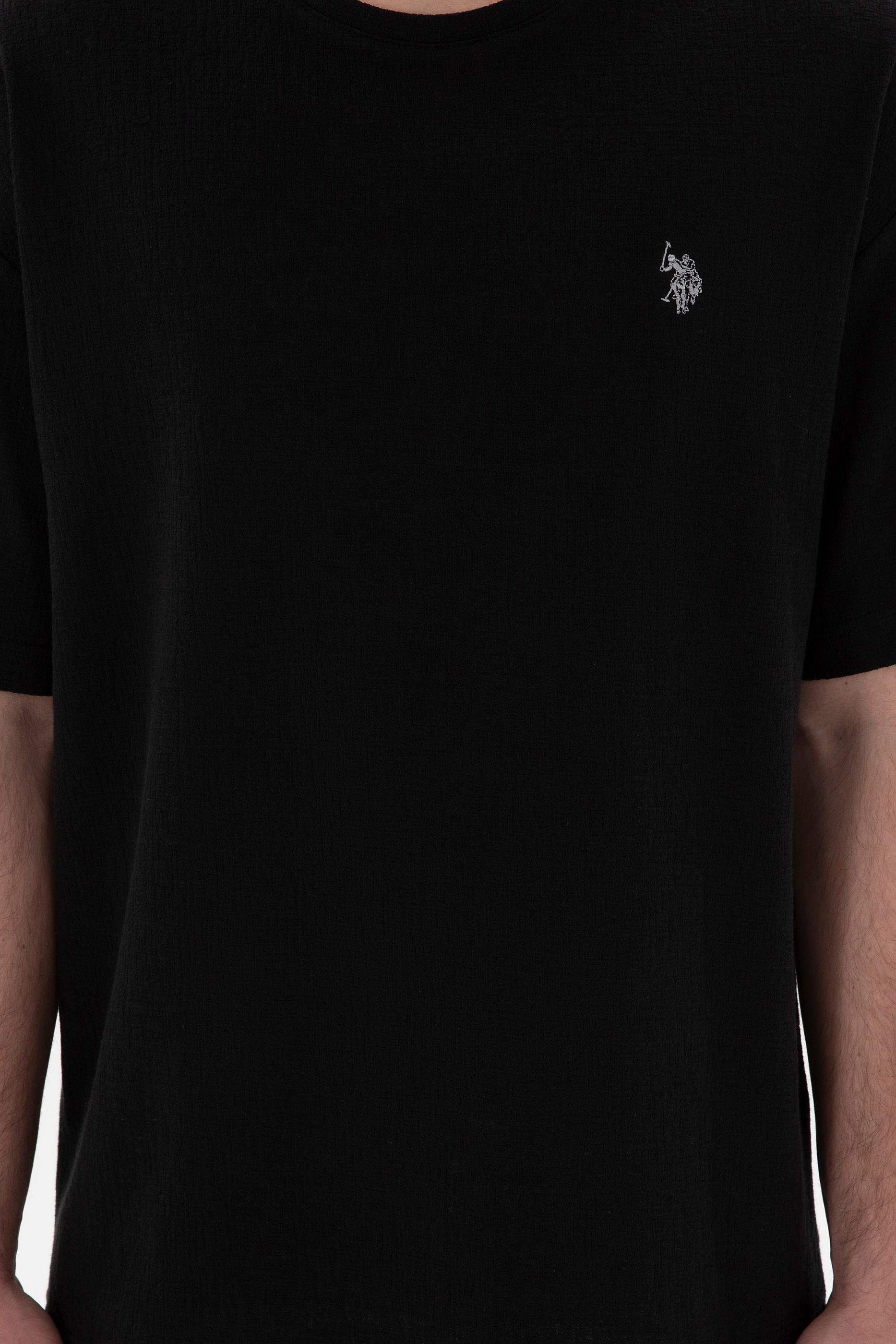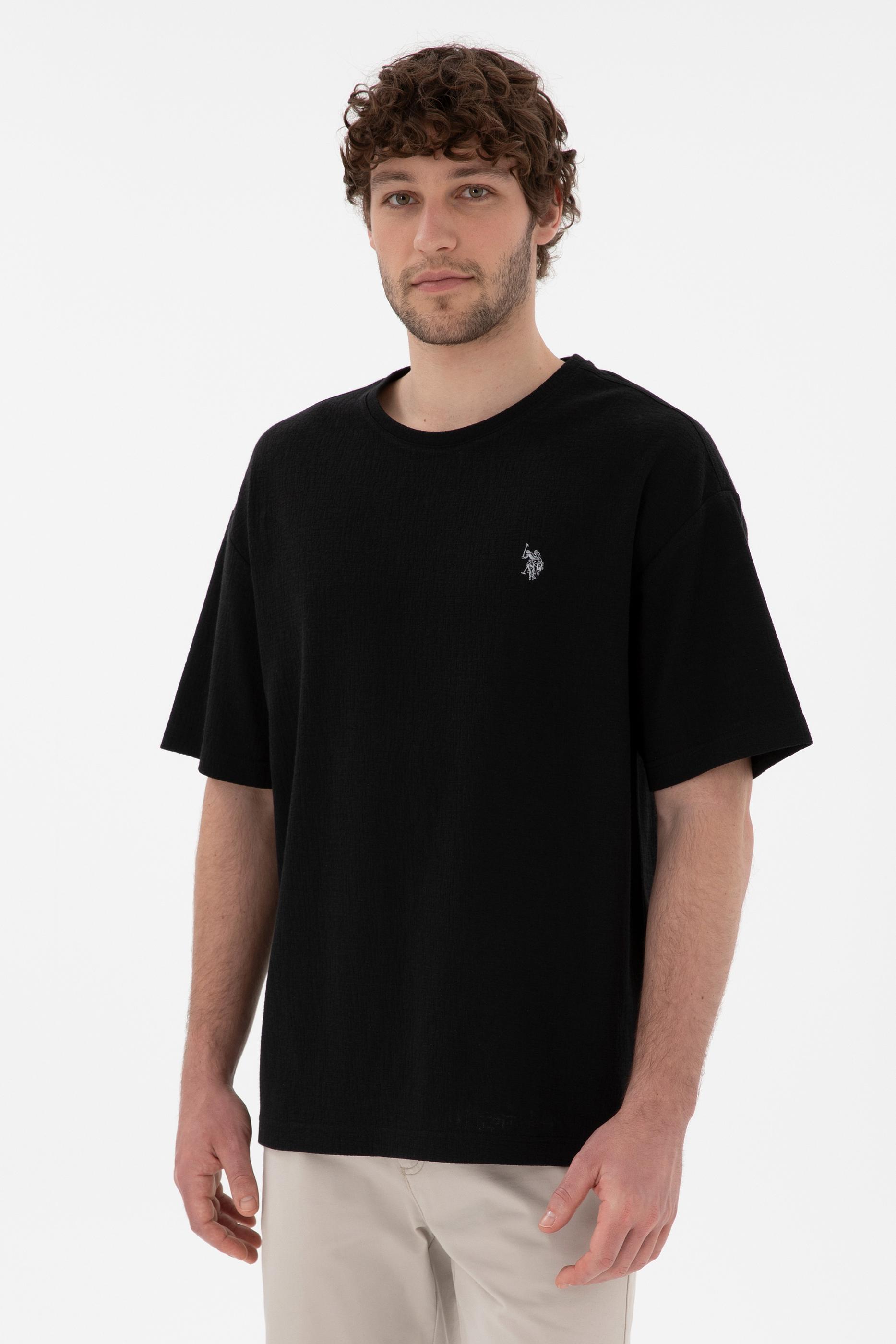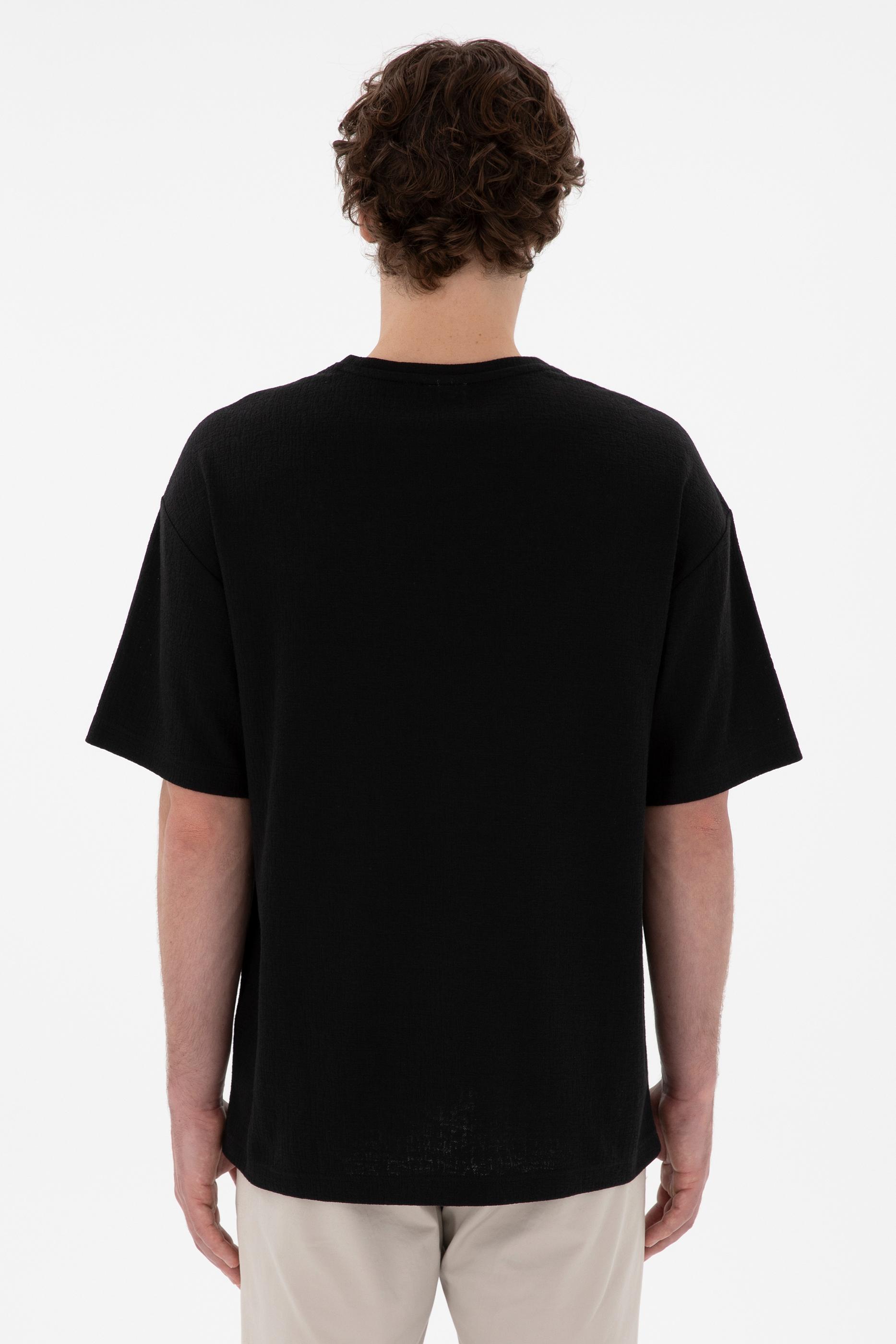 - Erkek Comfort Fit Bisiklet Yaka Siyah Jakarlı İnterlok Tişört