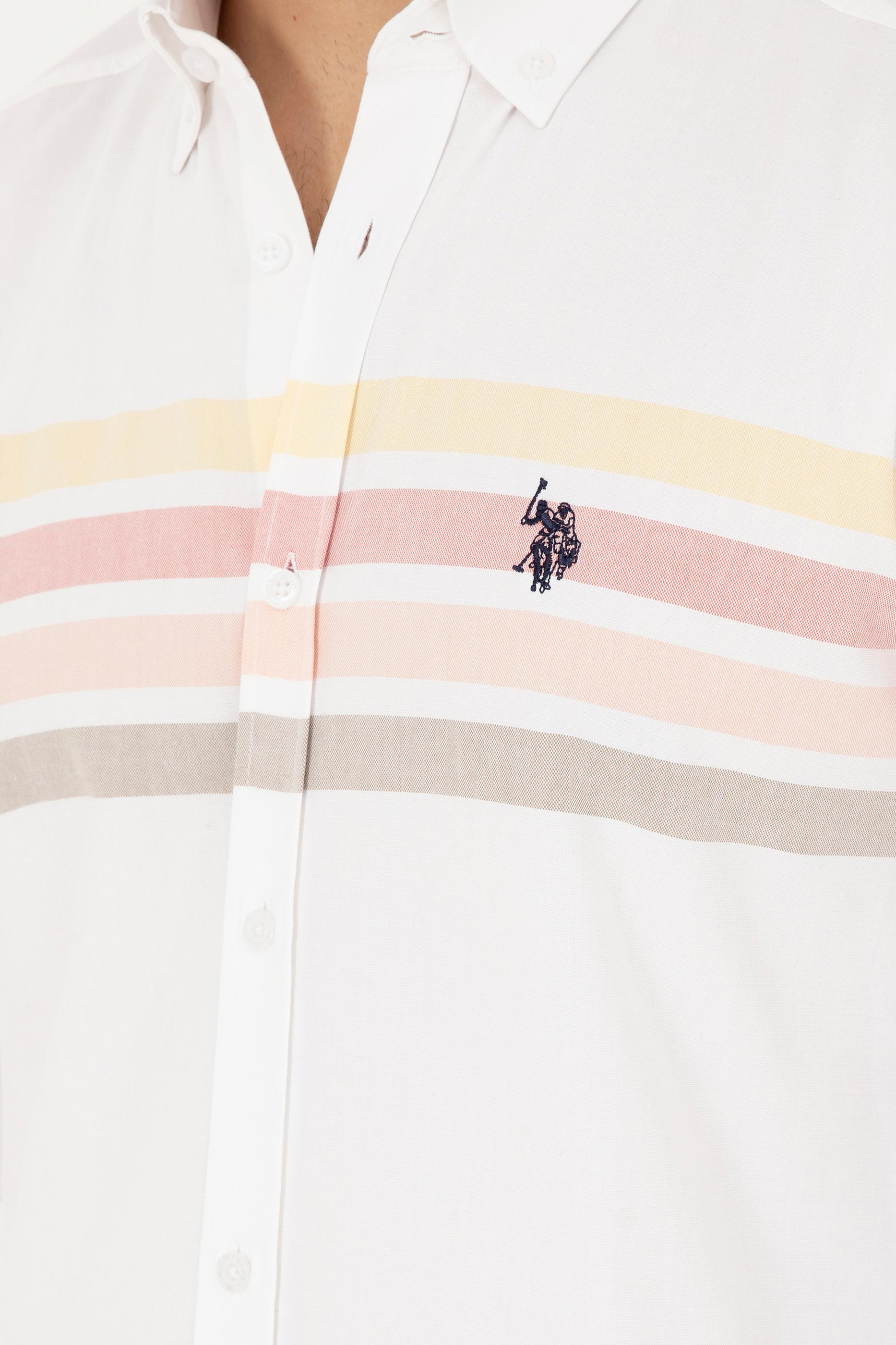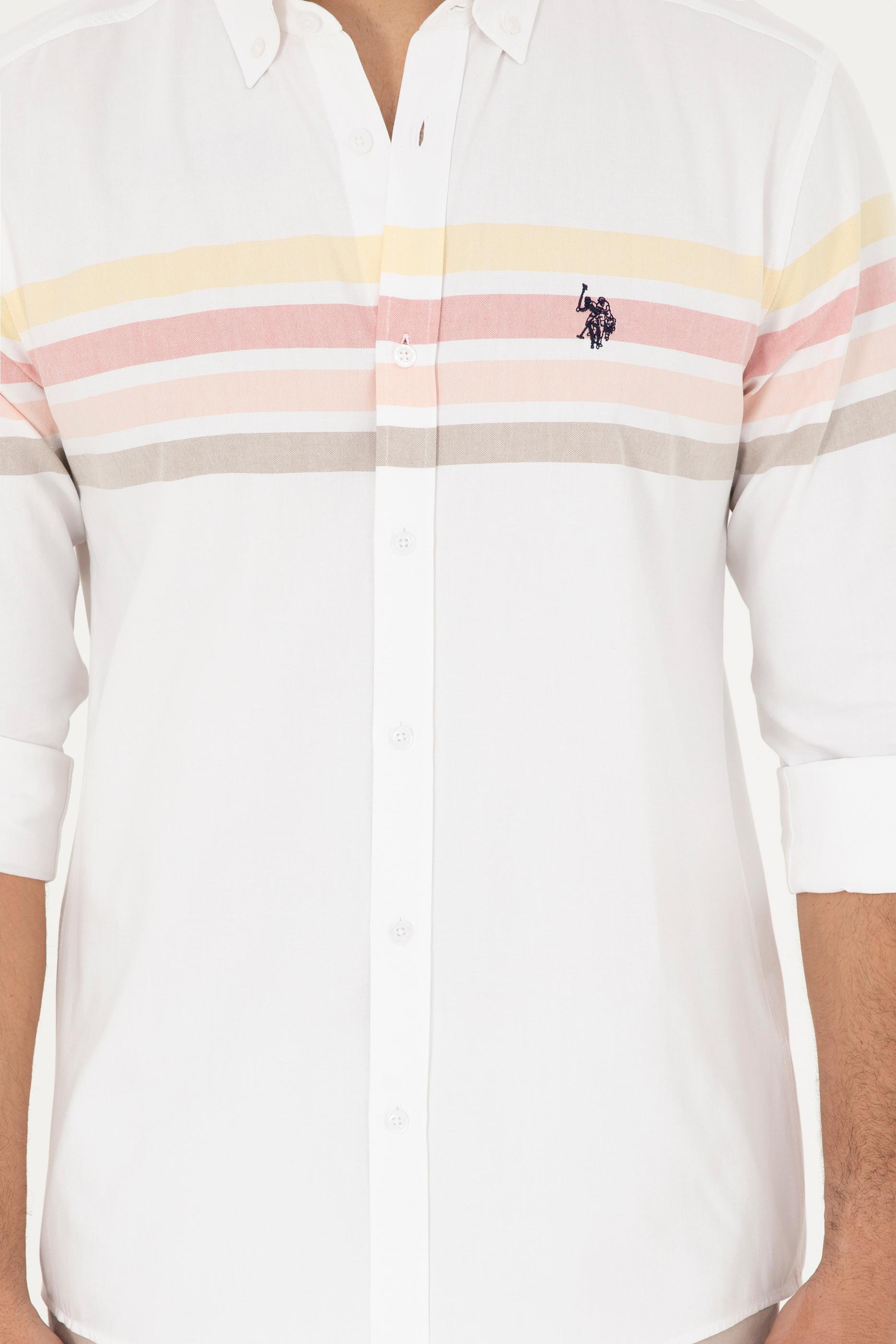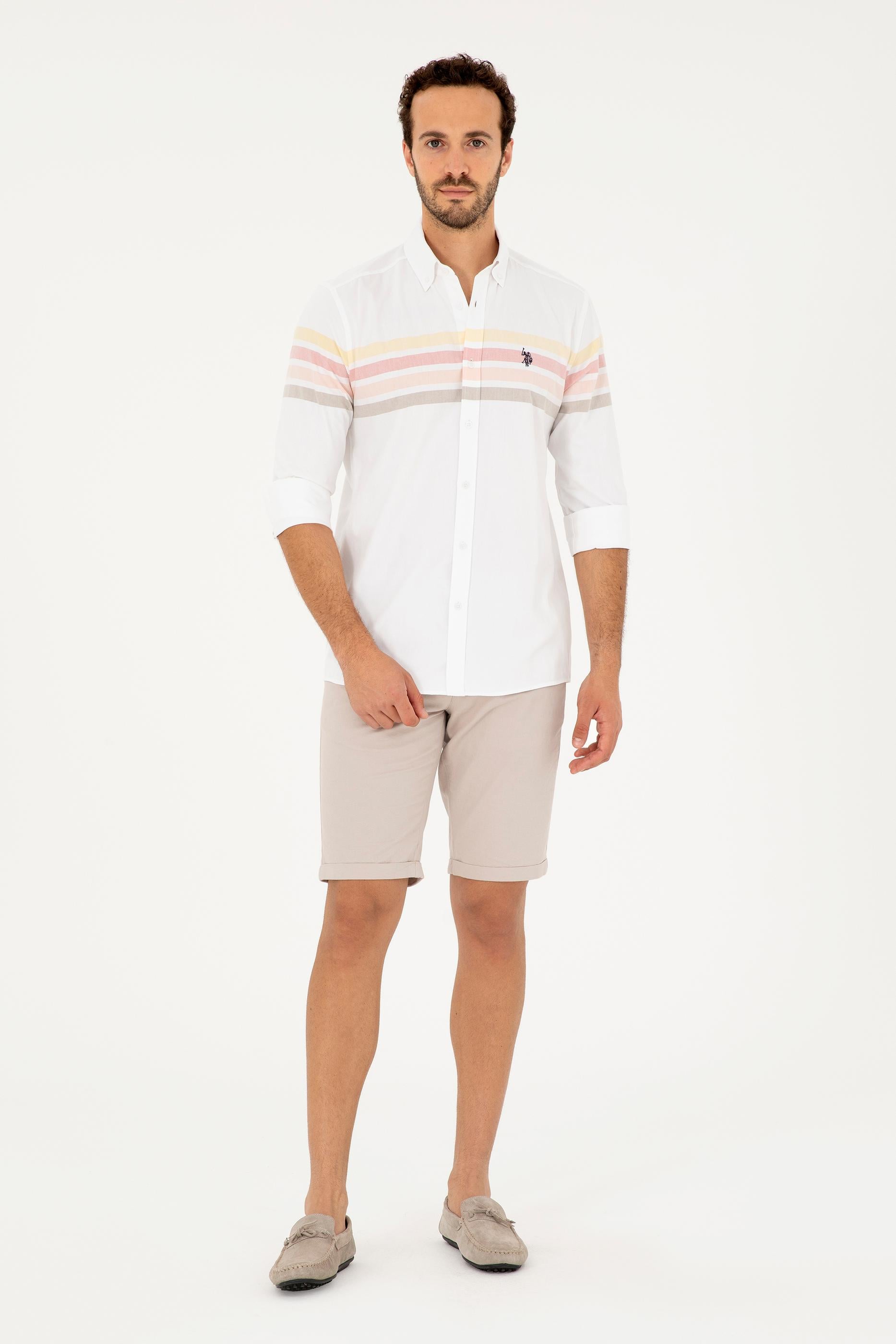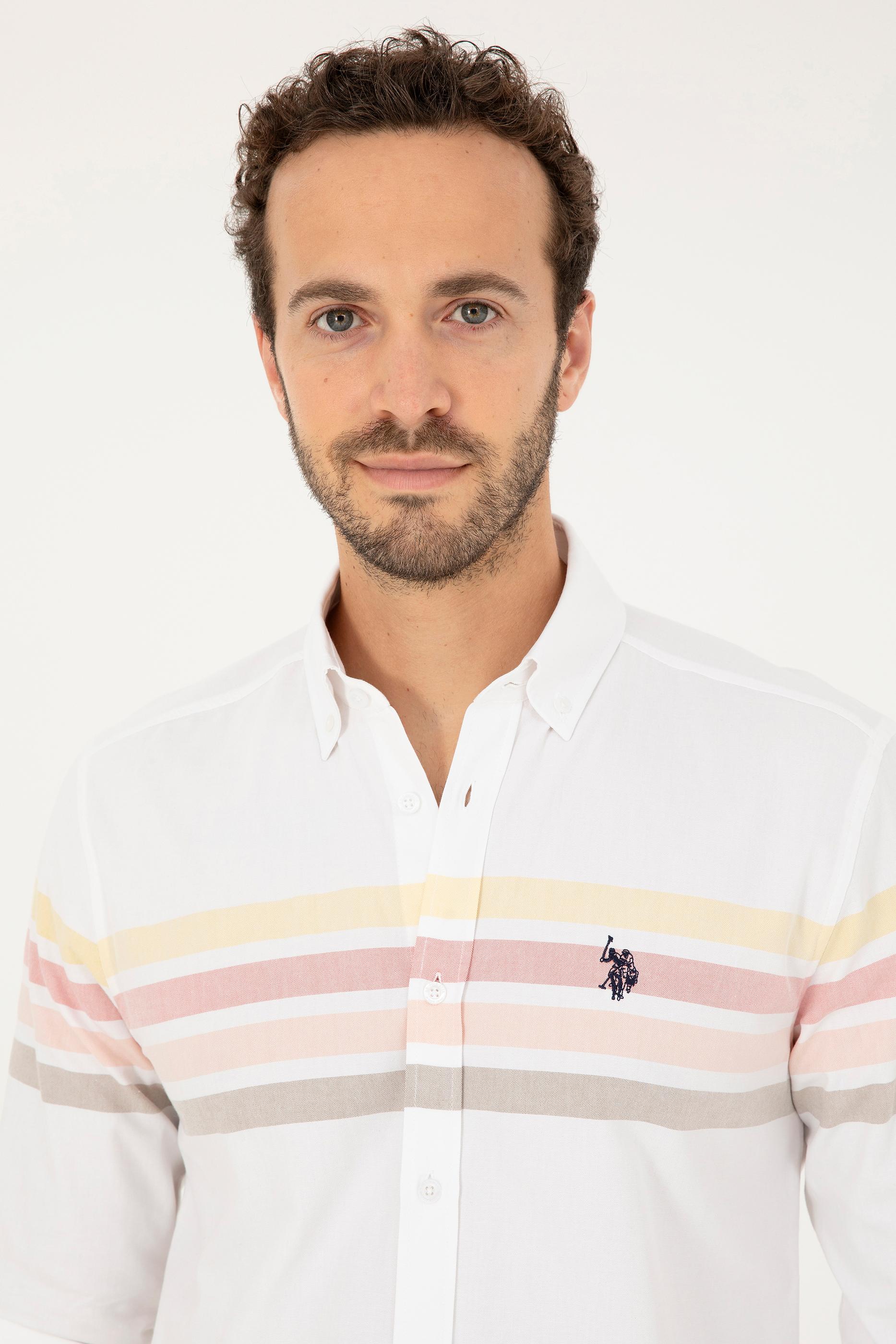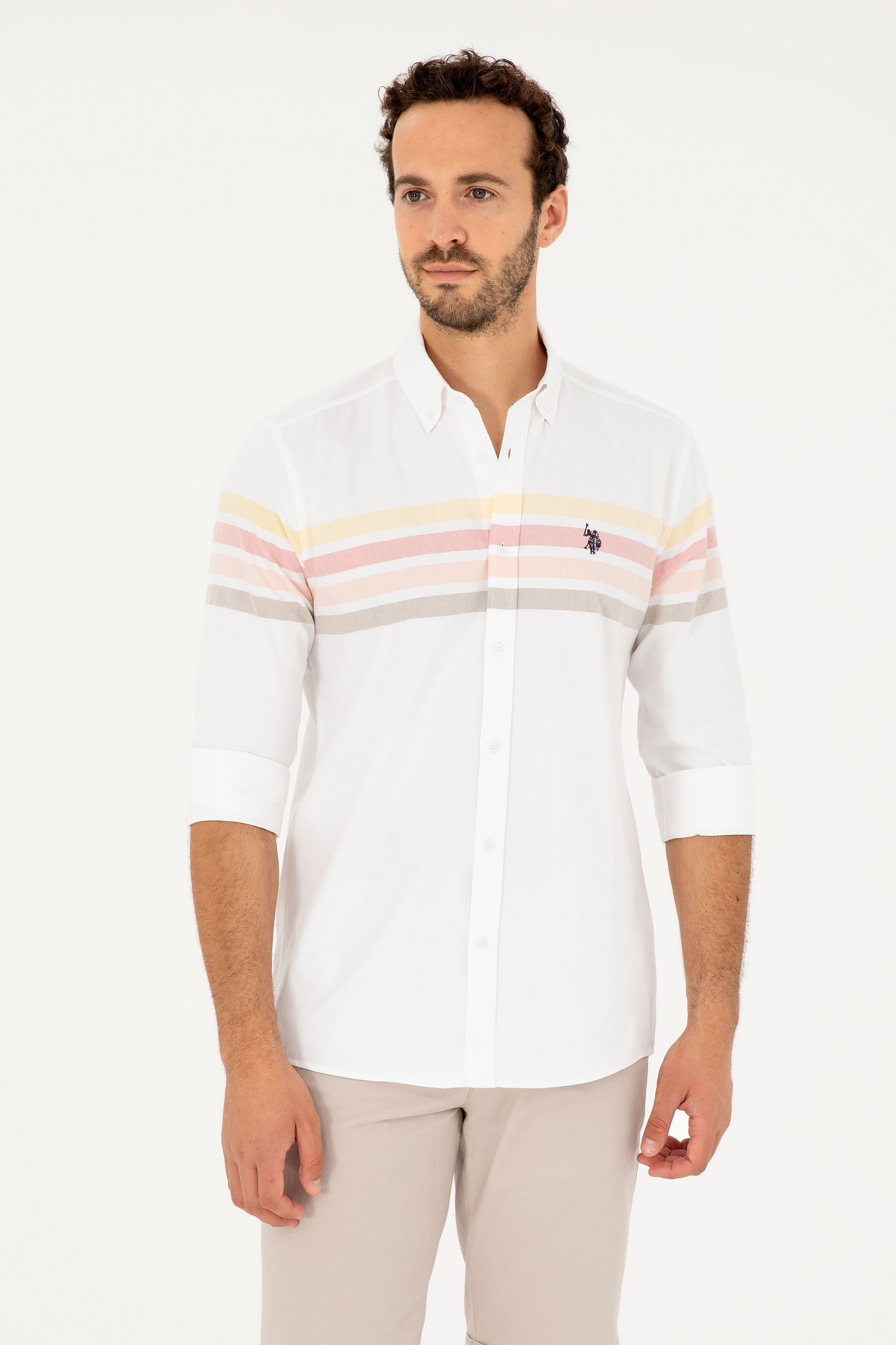%100 pamuk malzemeden üretilen panolu beyaz gömlek hem şıklığı hem de konforu bir arada sunar. U.S. Polo Assn. tarafından yerli üretim olan gömlek, kalitesi ile öne çıkar. Beyaz zemin üzerinde yer alan somon, pembe ve bej renkli panolar gömleğe dinamik ve modern bir hava katmaktadır. Pamuk kumaşının nefes alabilir özelliği sayesinde, gün boyu ferah ve rahat hissedersiniz. Regular fit kesimi, vücuda tam oturarak şık bir görünüm sağlar ve hareket özgürlüğü sunar. Düğmeli yakası ve uzun kollu tasarımı, hem iş hem de günlük hayatta rahatlıkla kullanılabilir.