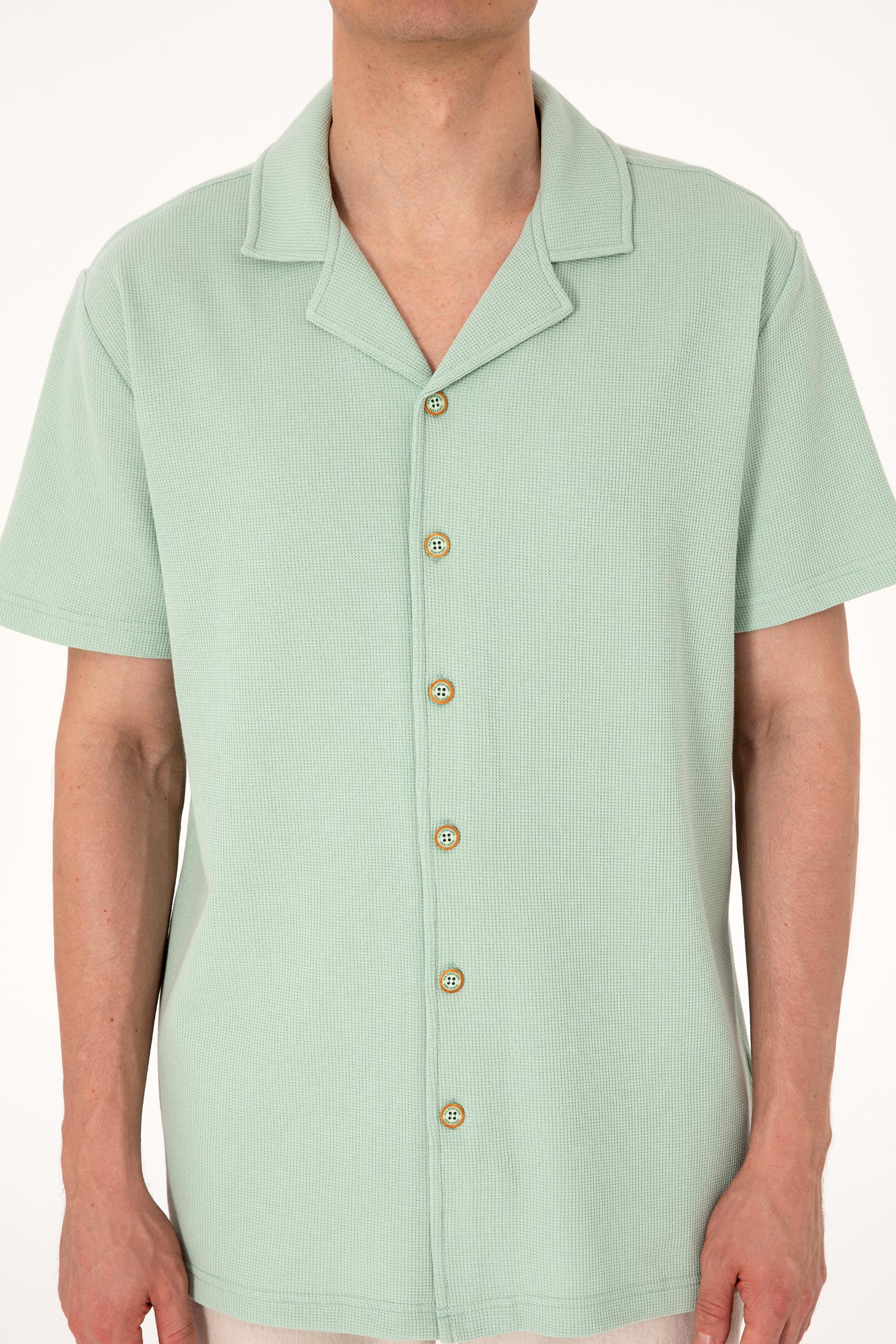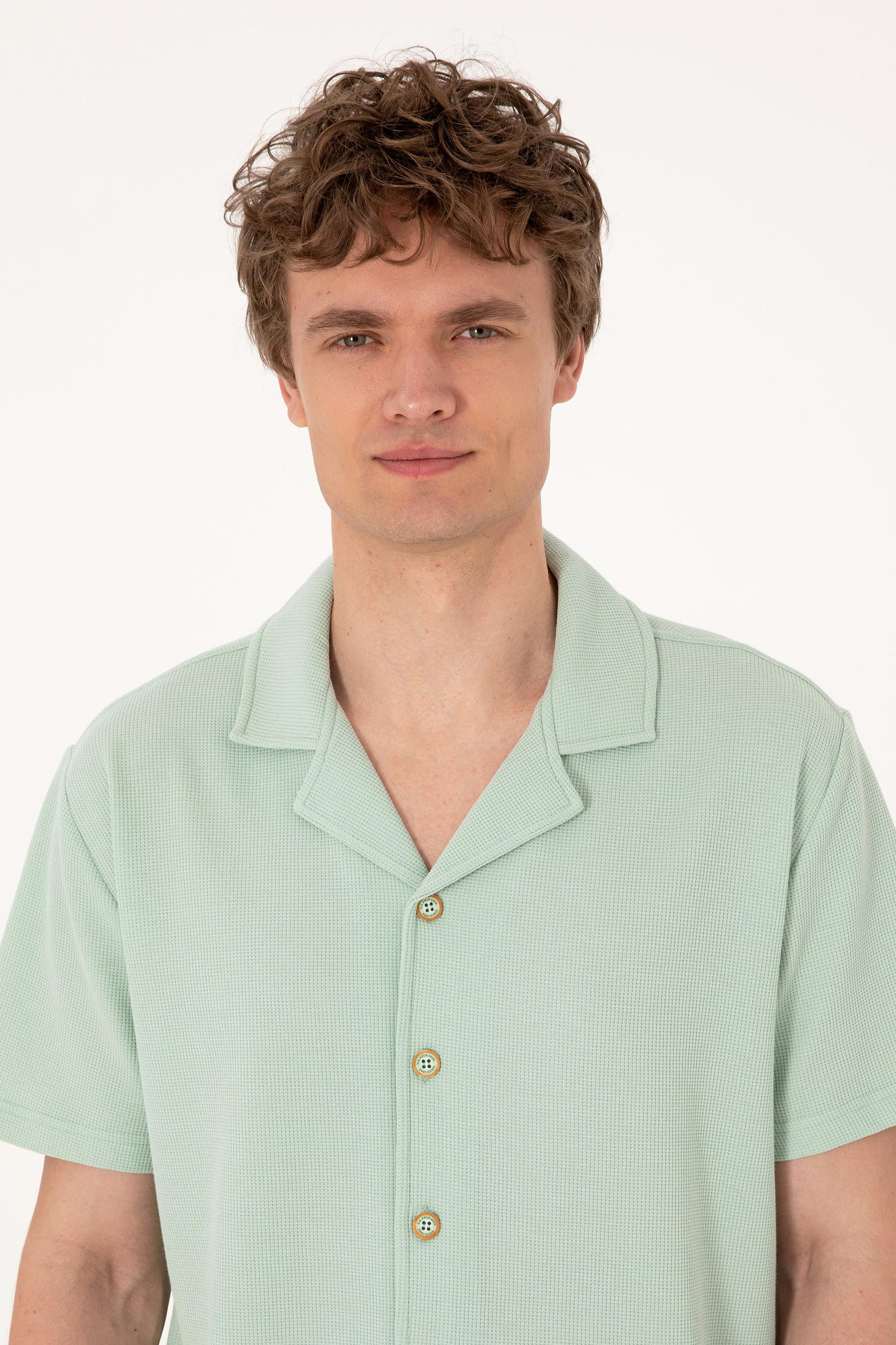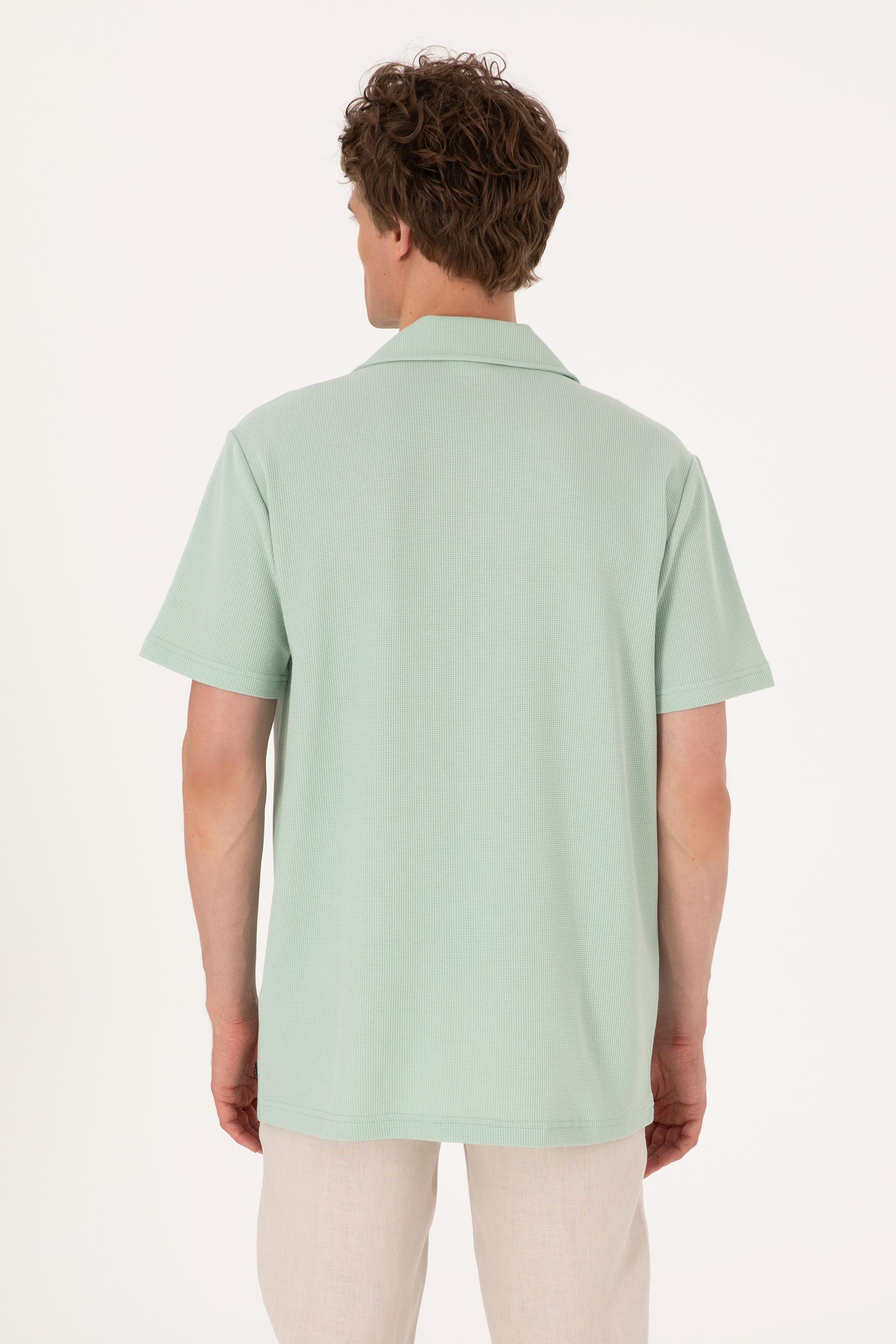 Erkek Su Yeşili Apaş Yaka Kısa Kollu Örme Gömlek