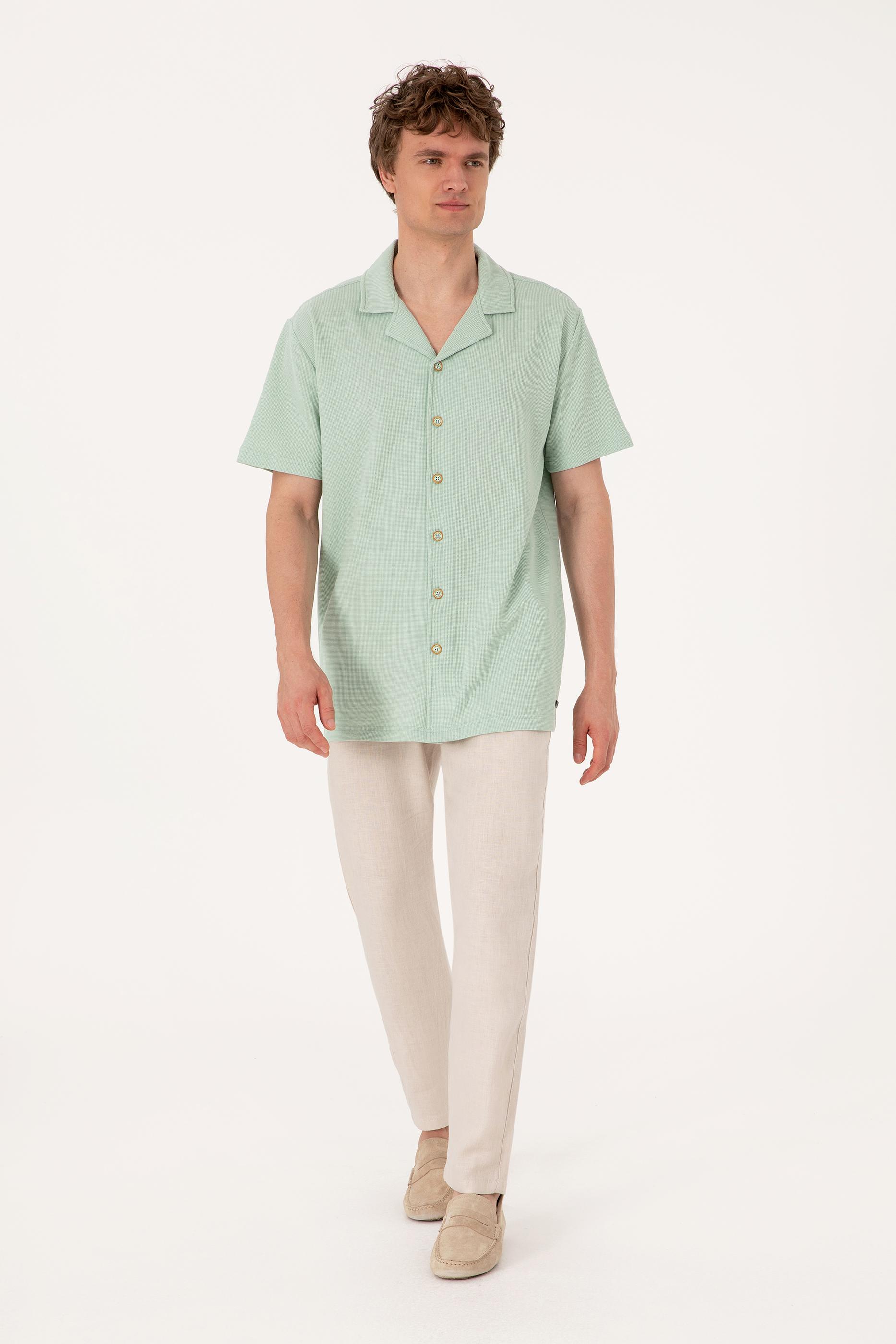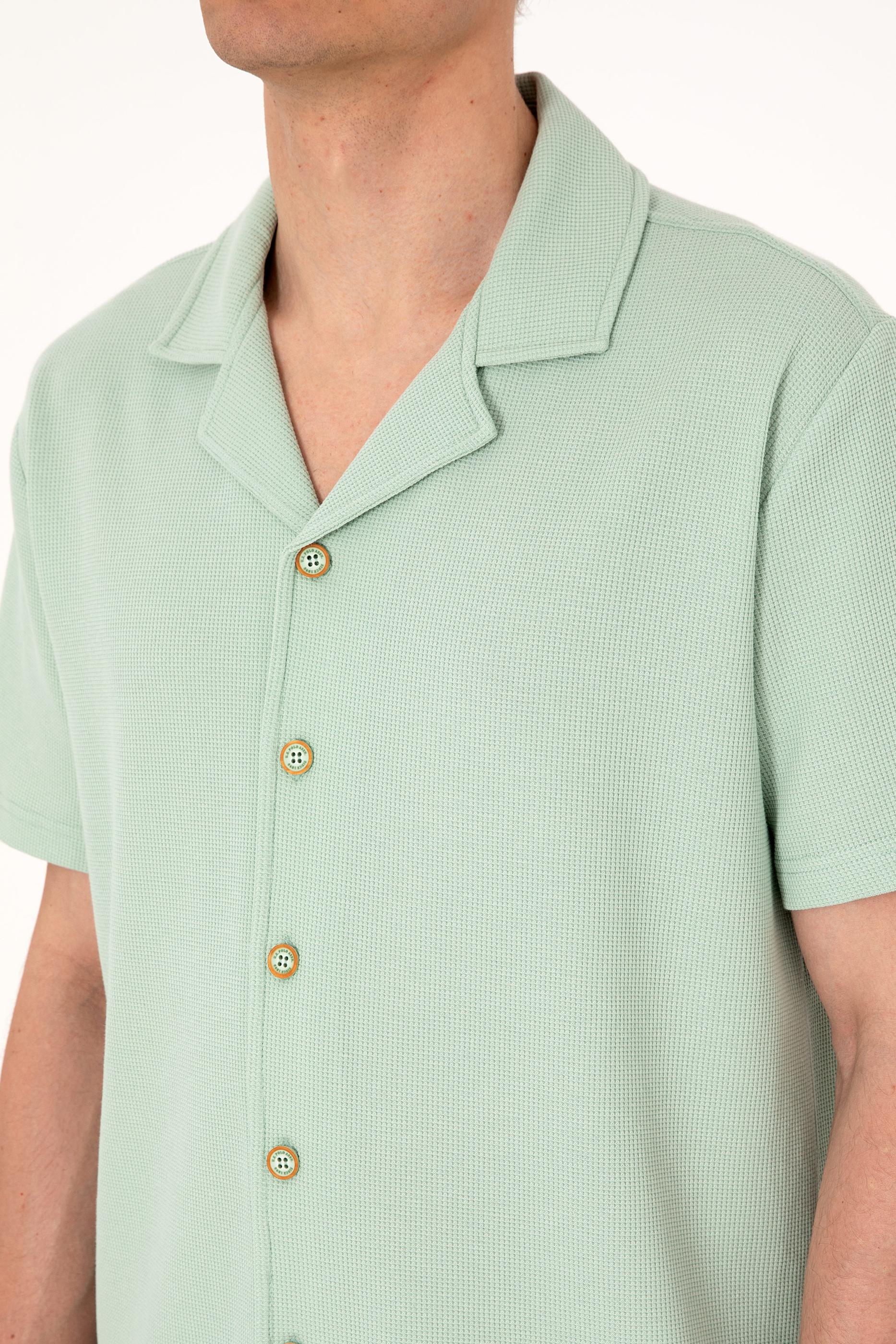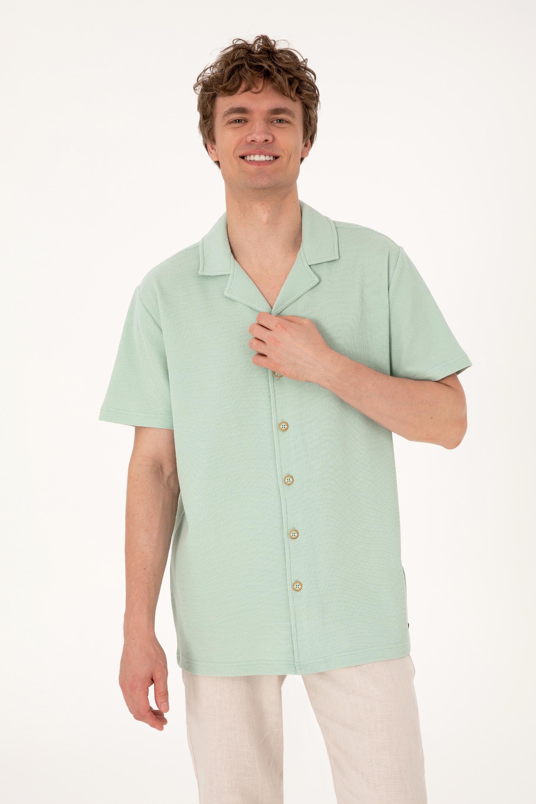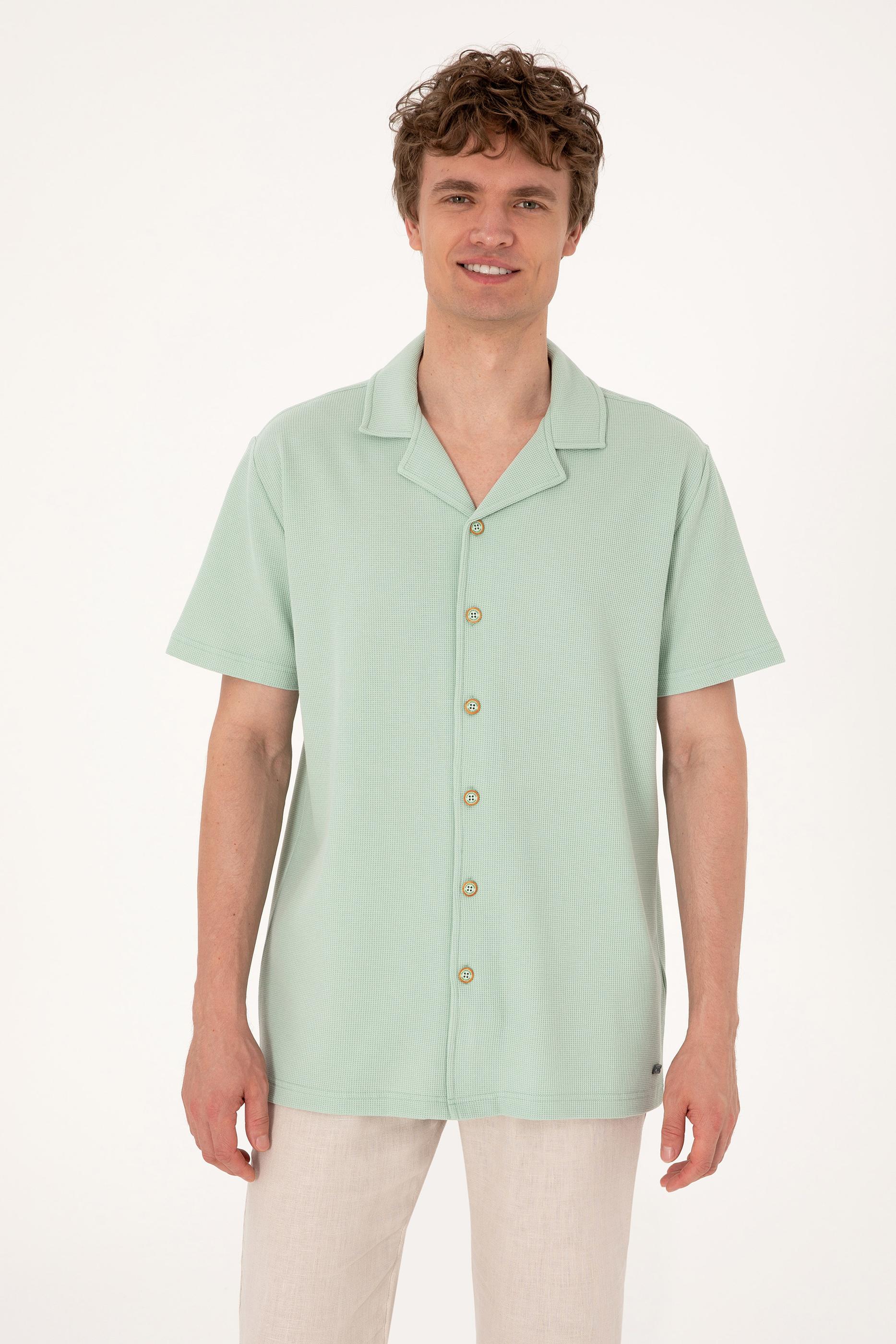 Erkek Su Yeşili Apaş Yaka Kısa Kollu Örme Gömlek