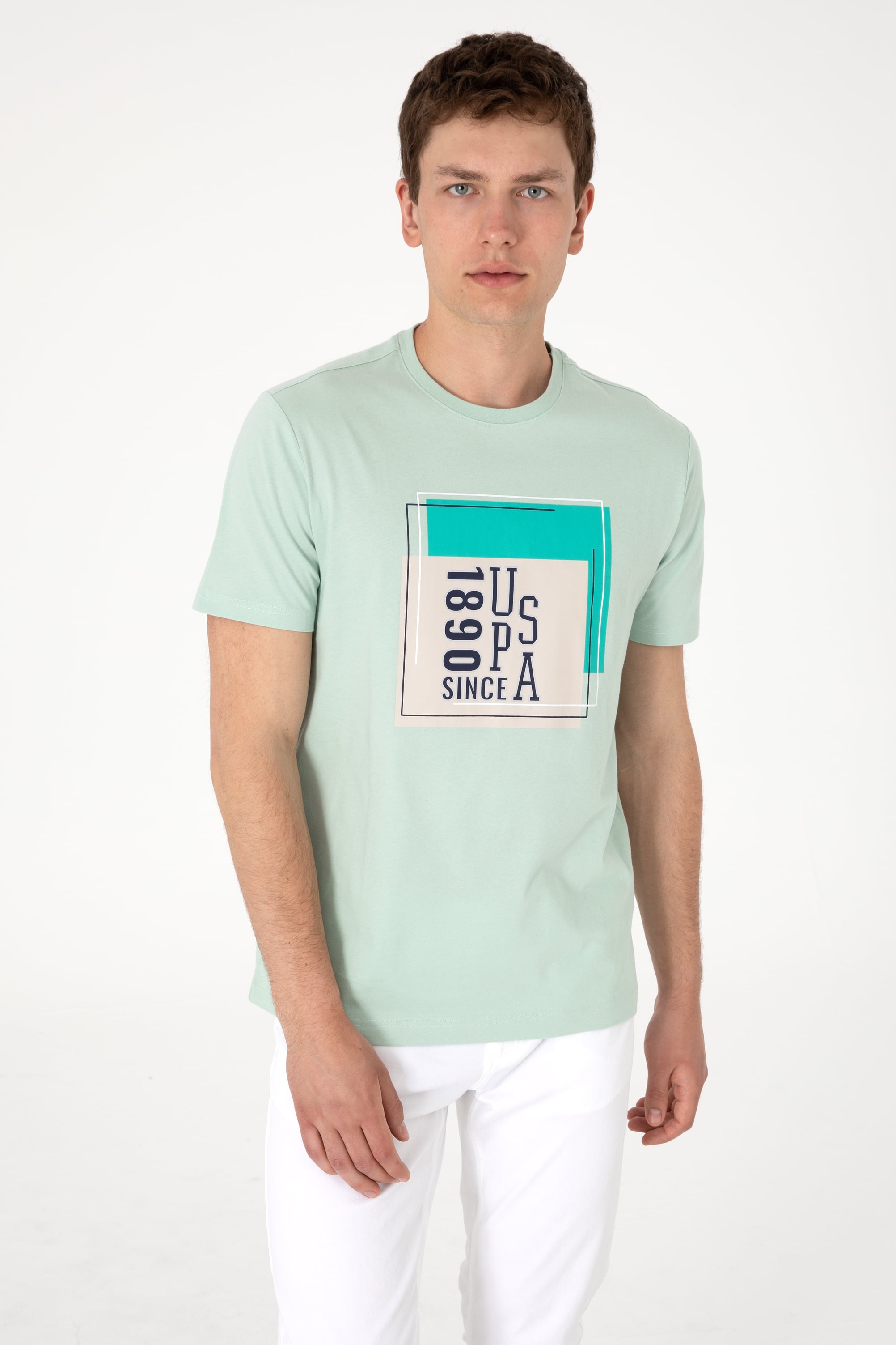 U.S. Polo Assn. imzasını taşıyan bu su yeşili tişört, soft rengi ve ön yüzeydeki grafik tasarımıyla günlük kombinlere modern bir dokunuş katar. Hafif ve yumuşak %100 pamuklu kumaşıyla yaz aylarında ferah bir kullanım sunarken, regular fit kesimi sayesinde konforlu bir duruş sağlar. Göğüs kısmındaki kare formunda konumlandırılmış tipografi, tişörte genç ve enerjik bir karakter kazandırır. Açık renk pantolonlarla kolayca kombinlenebilen bu model, sade ve stil sahibi bir görünüm arayanlar için ideal bir tamamlayıcıdır.
