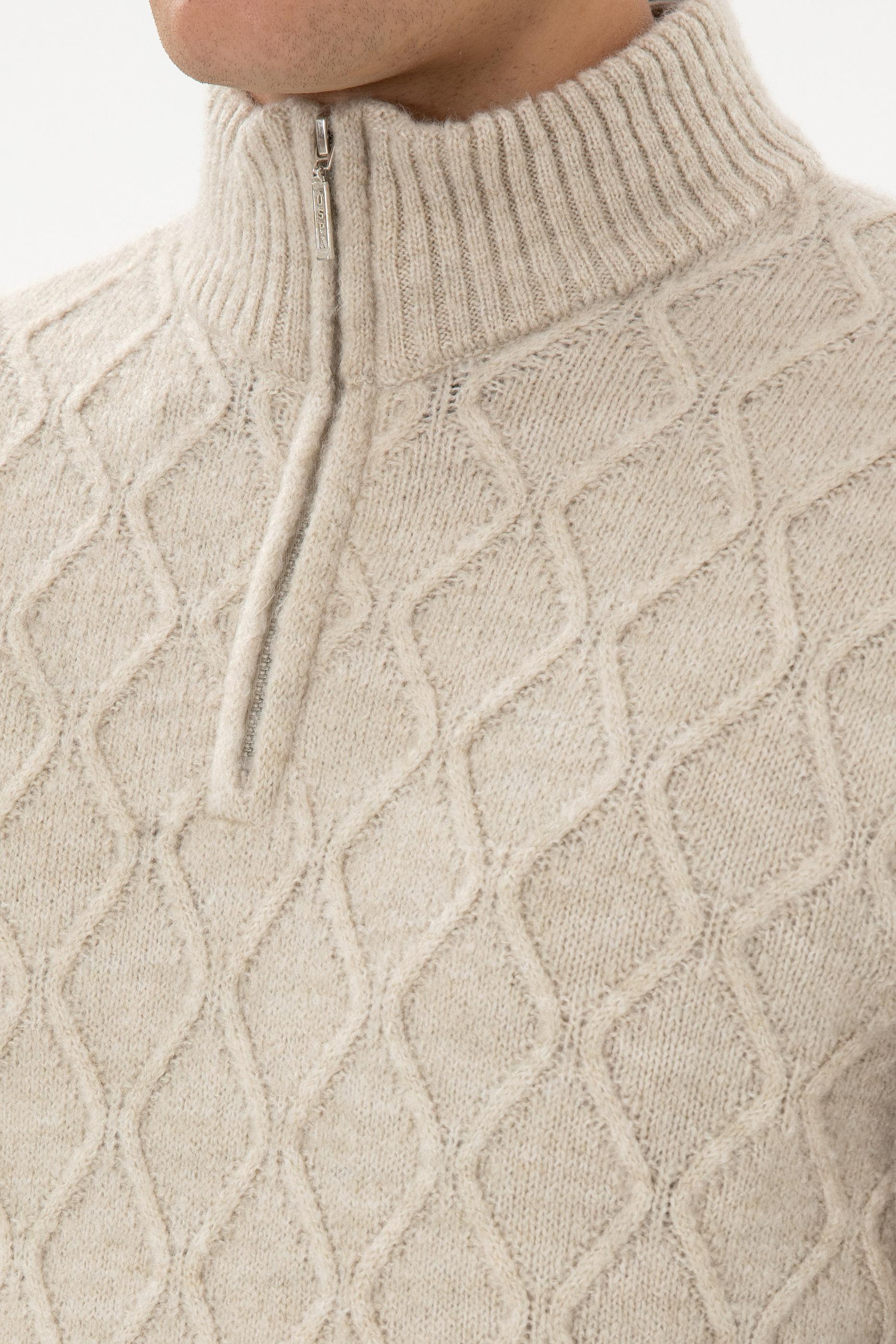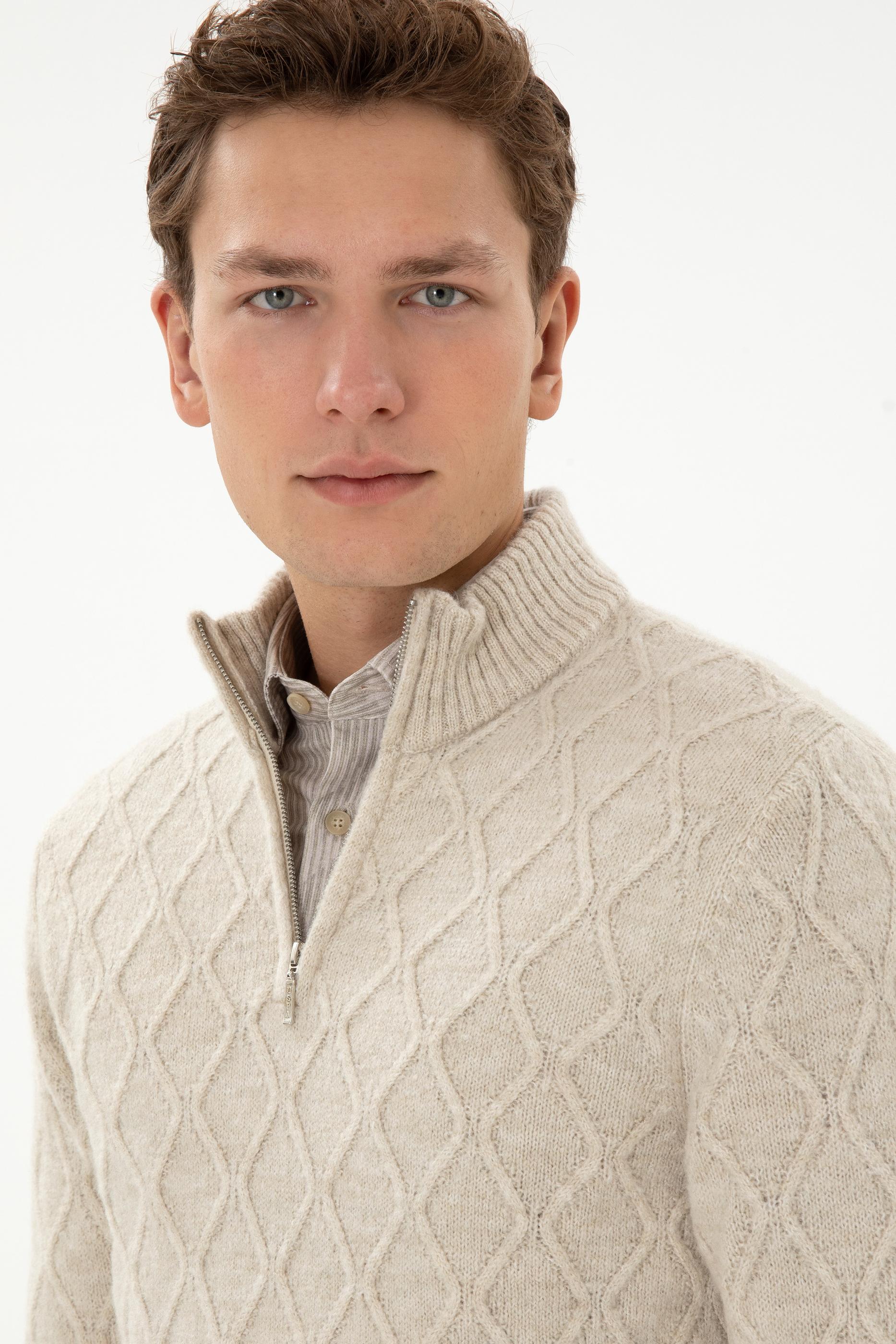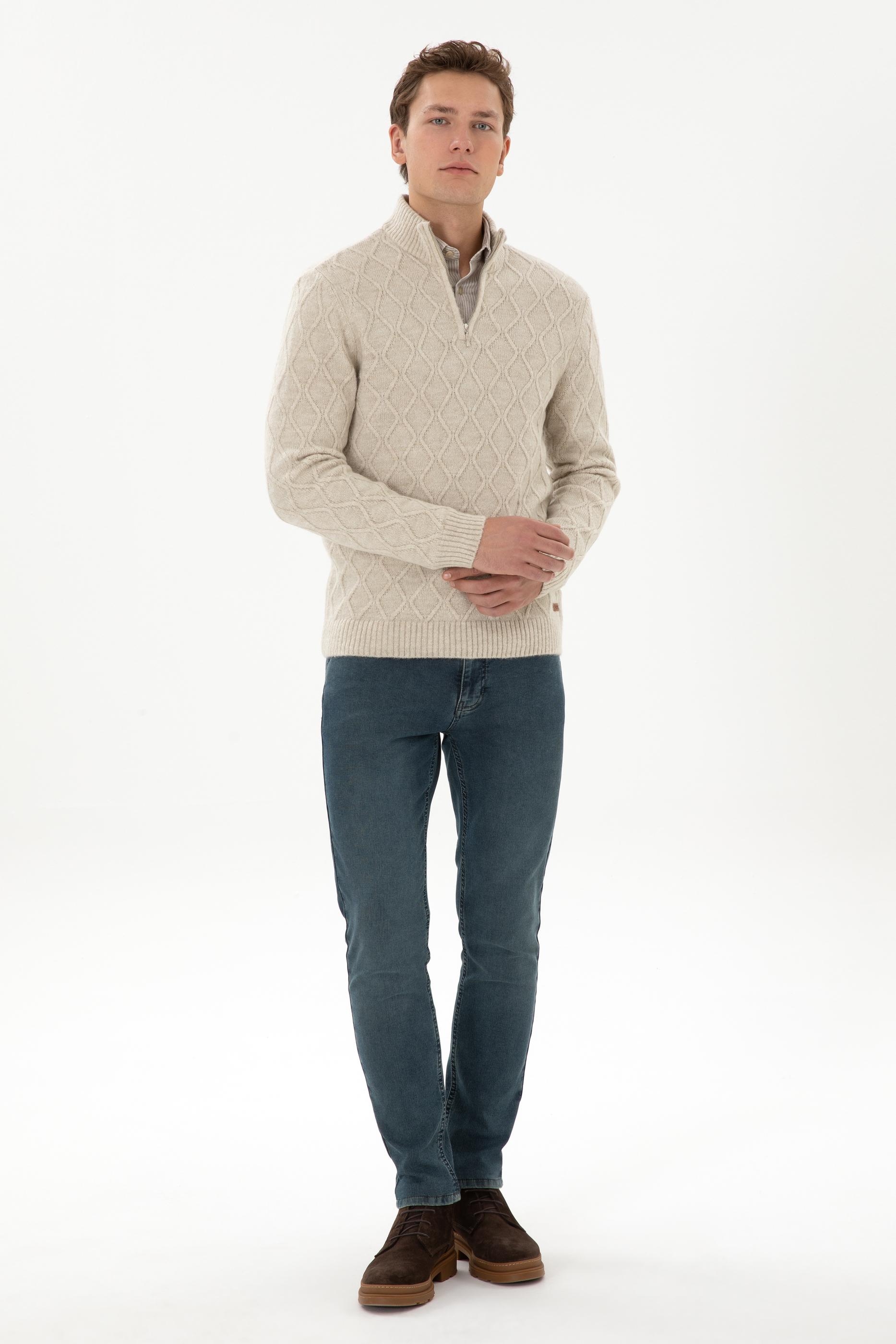 Erkek Regular Fit Yarım Fermuarlı Desenli Taş Kazak