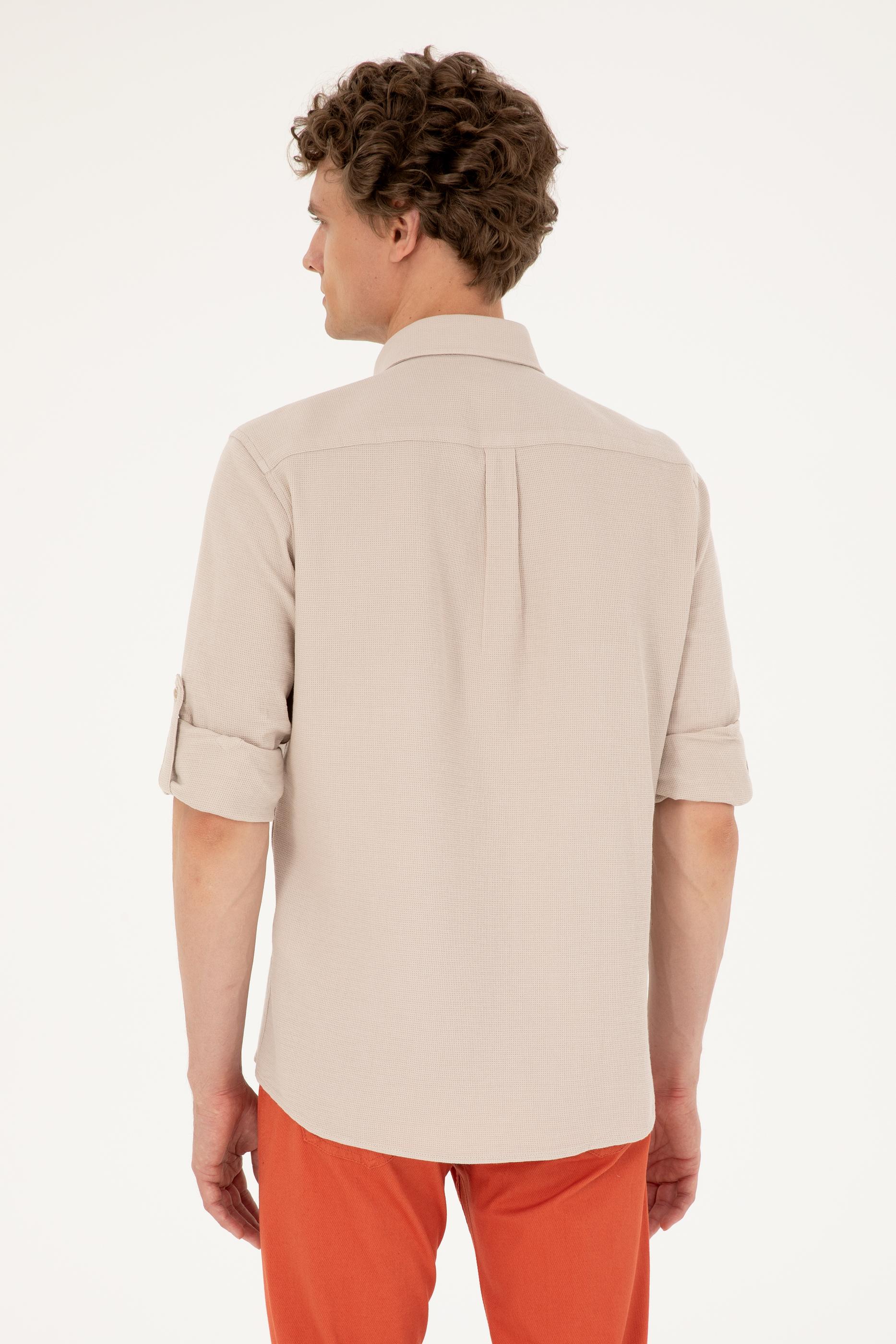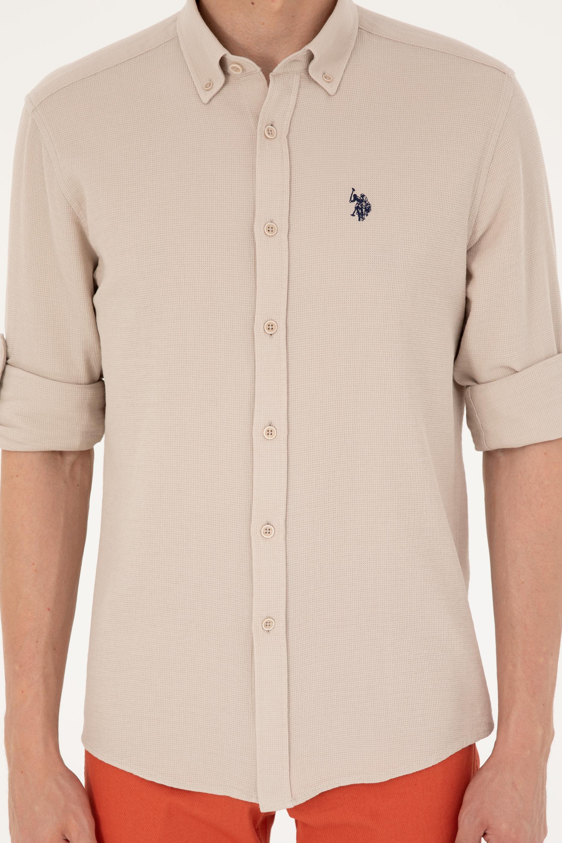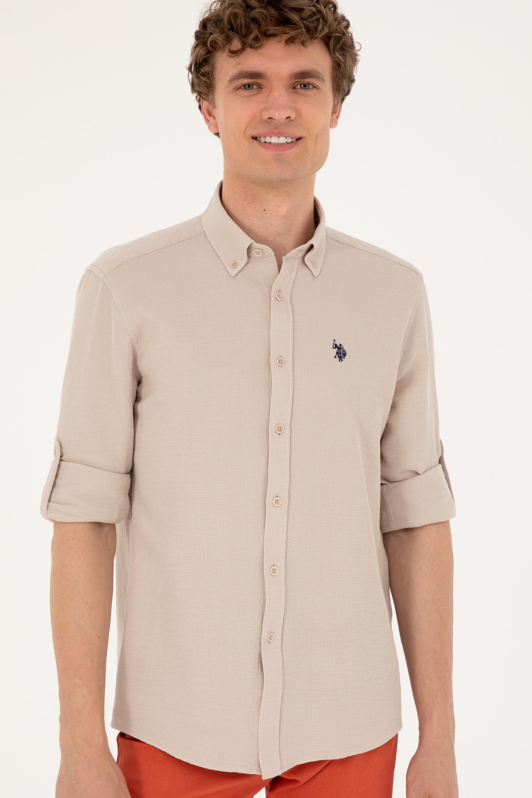 Erkek taş rengi kumaş doku detaylı gömlek %100 pamuk malzemeden üretilmiş olup, rahatlık ve şıklığı bir arada sunar. Hem gündelik hem de iş hayatında kullanılabilecek çok yönlü bir parçadır. Yüksek kaliteli pamuk kumaşı sayesinde, cildinizin nefes almasını sağlayarak gün boyu konfor sunar.