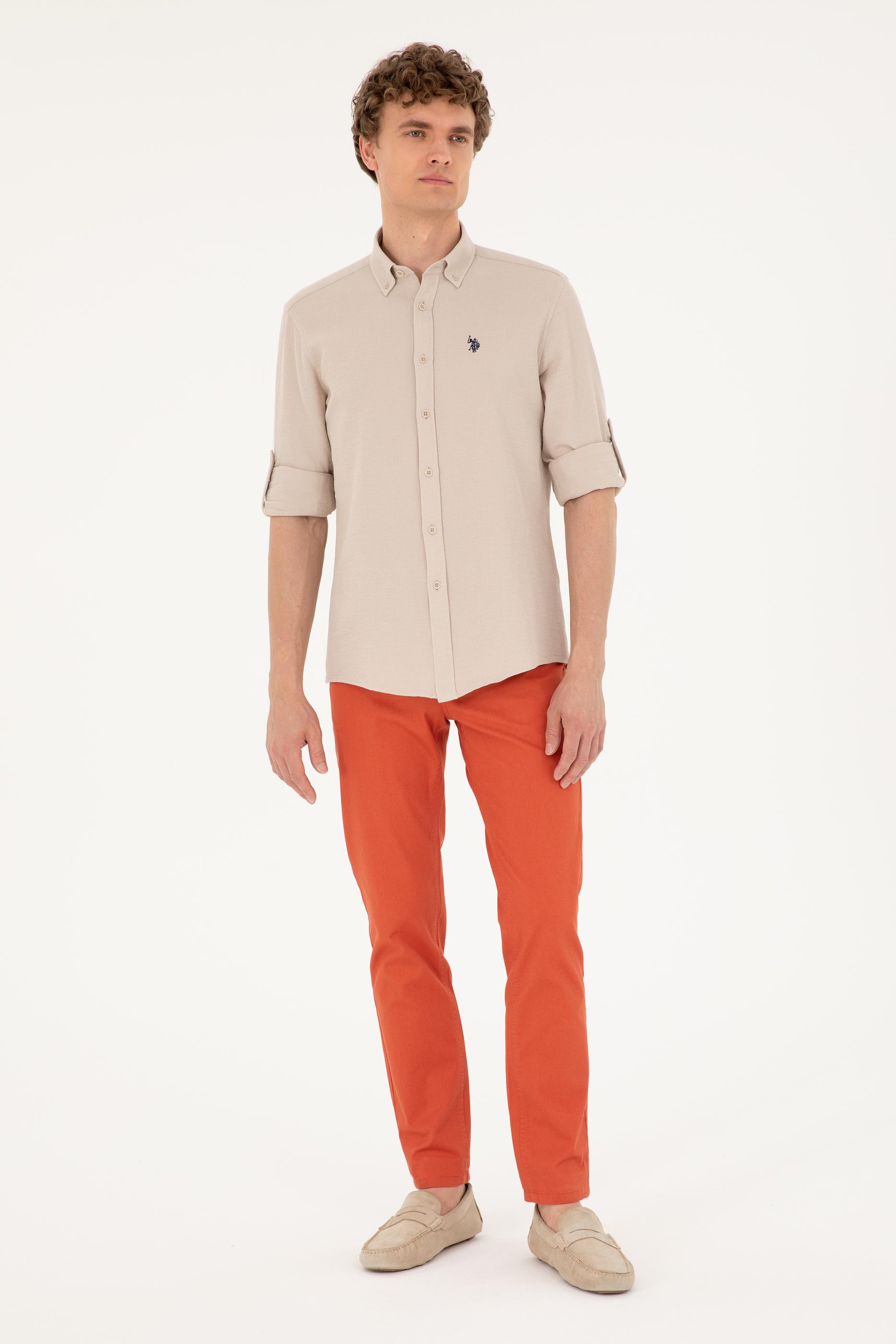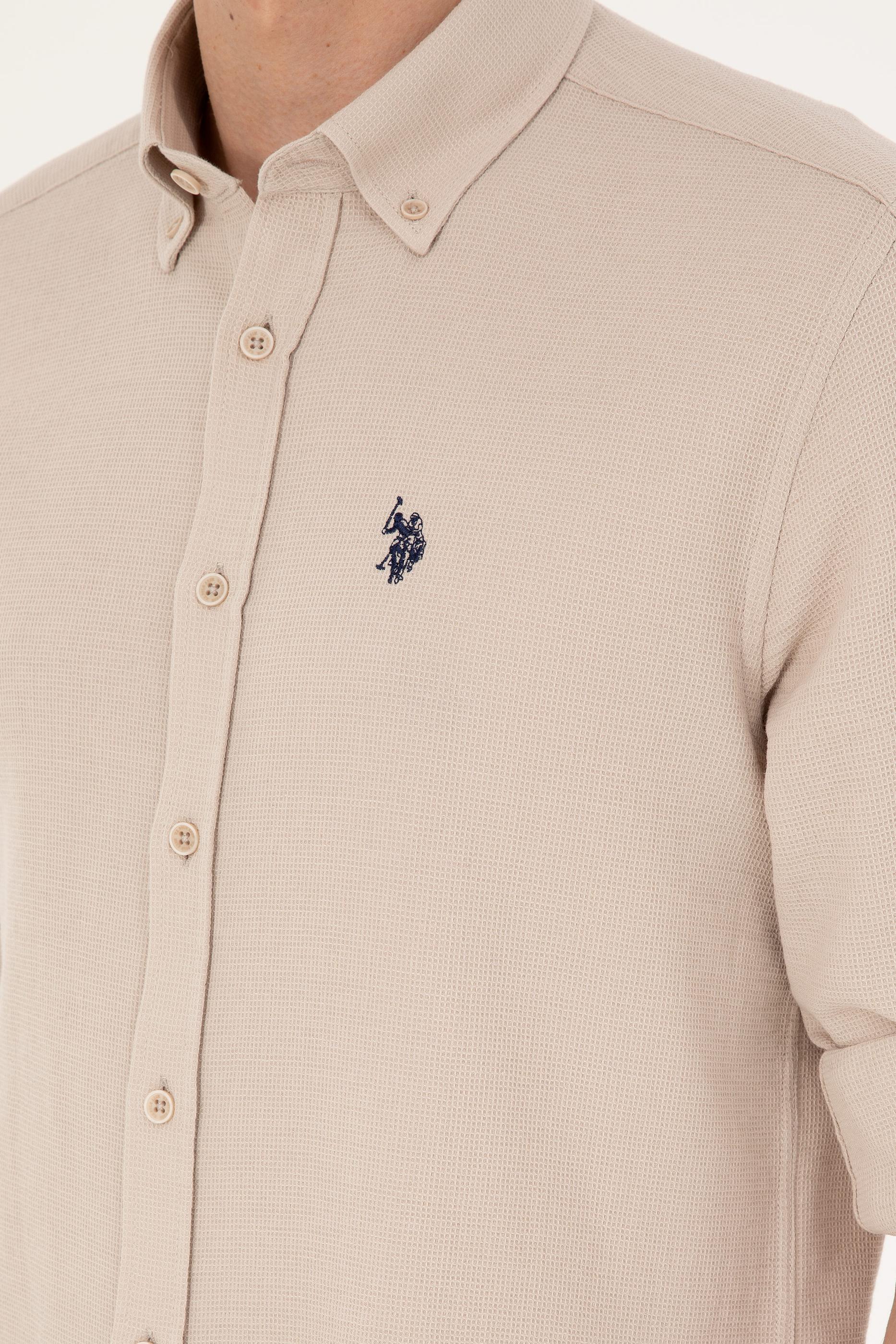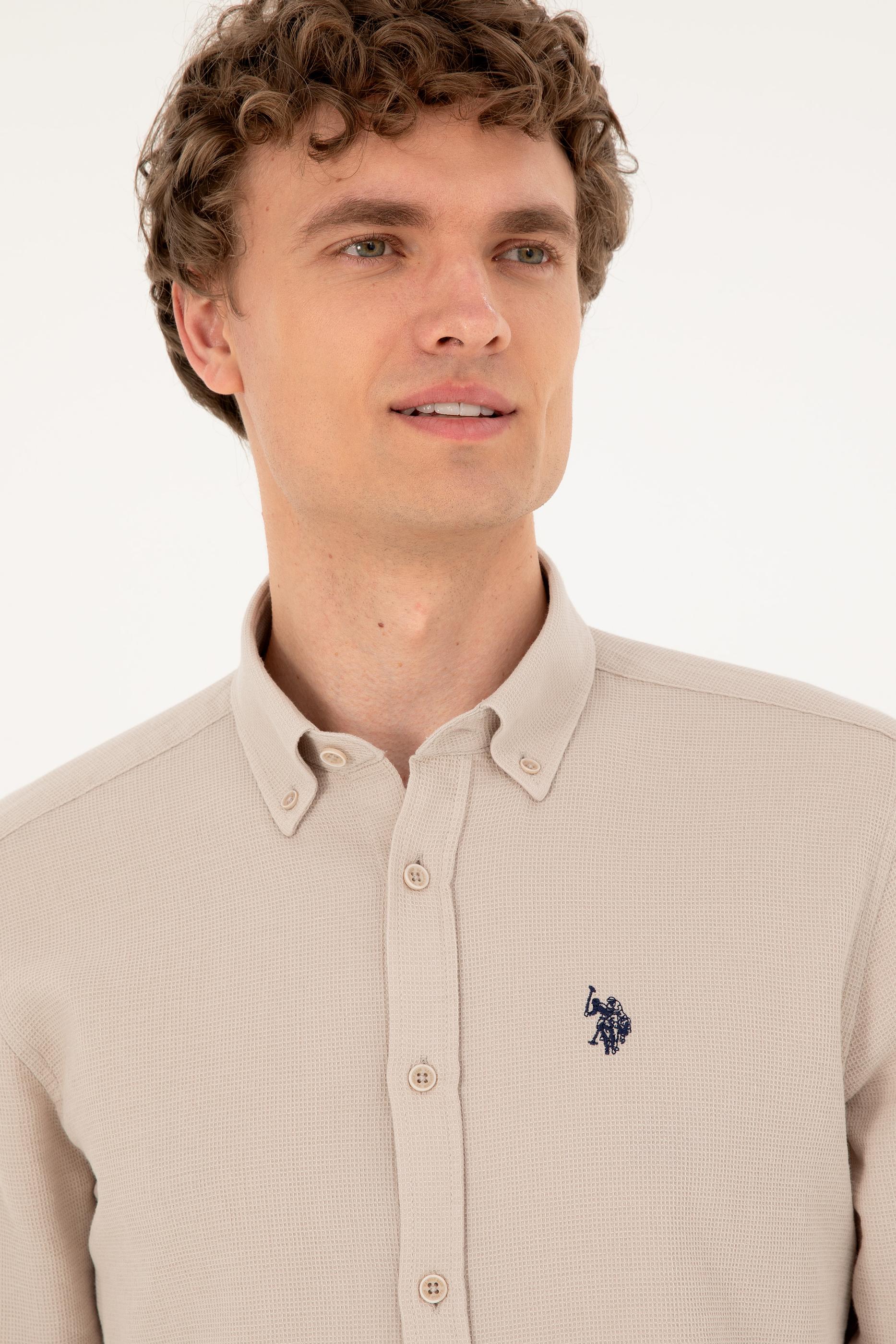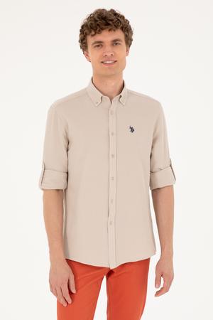 Erkek taş rengi kumaş doku detaylı gömlek %100 pamuk malzemeden üretilmiş olup, rahatlık ve şıklığı bir arada sunar. Hem gündelik hem de iş hayatında kullanılabilecek çok yönlü bir parçadır. Yüksek kaliteli pamuk kumaşı sayesinde, cildinizin nefes almasını sağlayarak gün boyu konfor sunar.