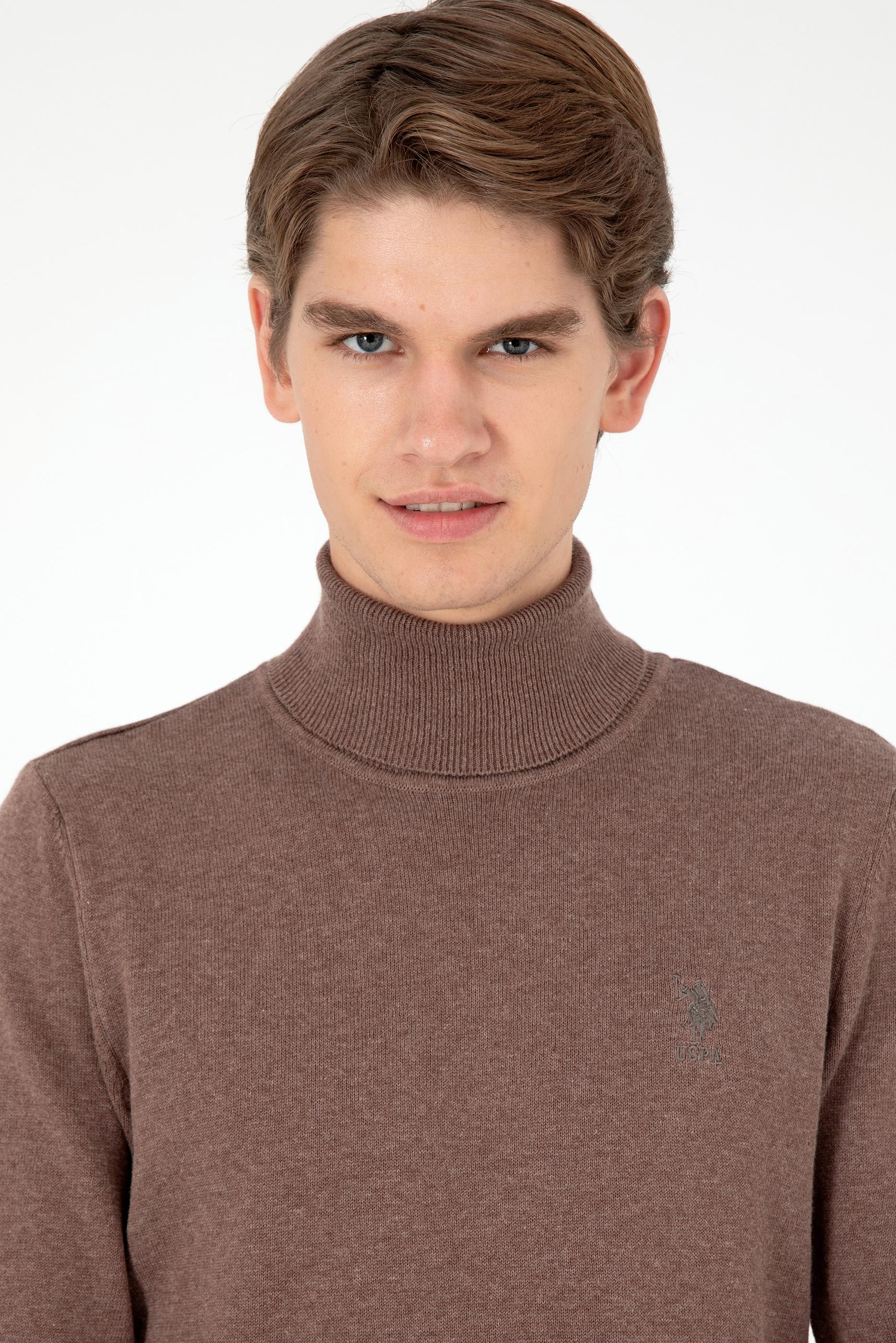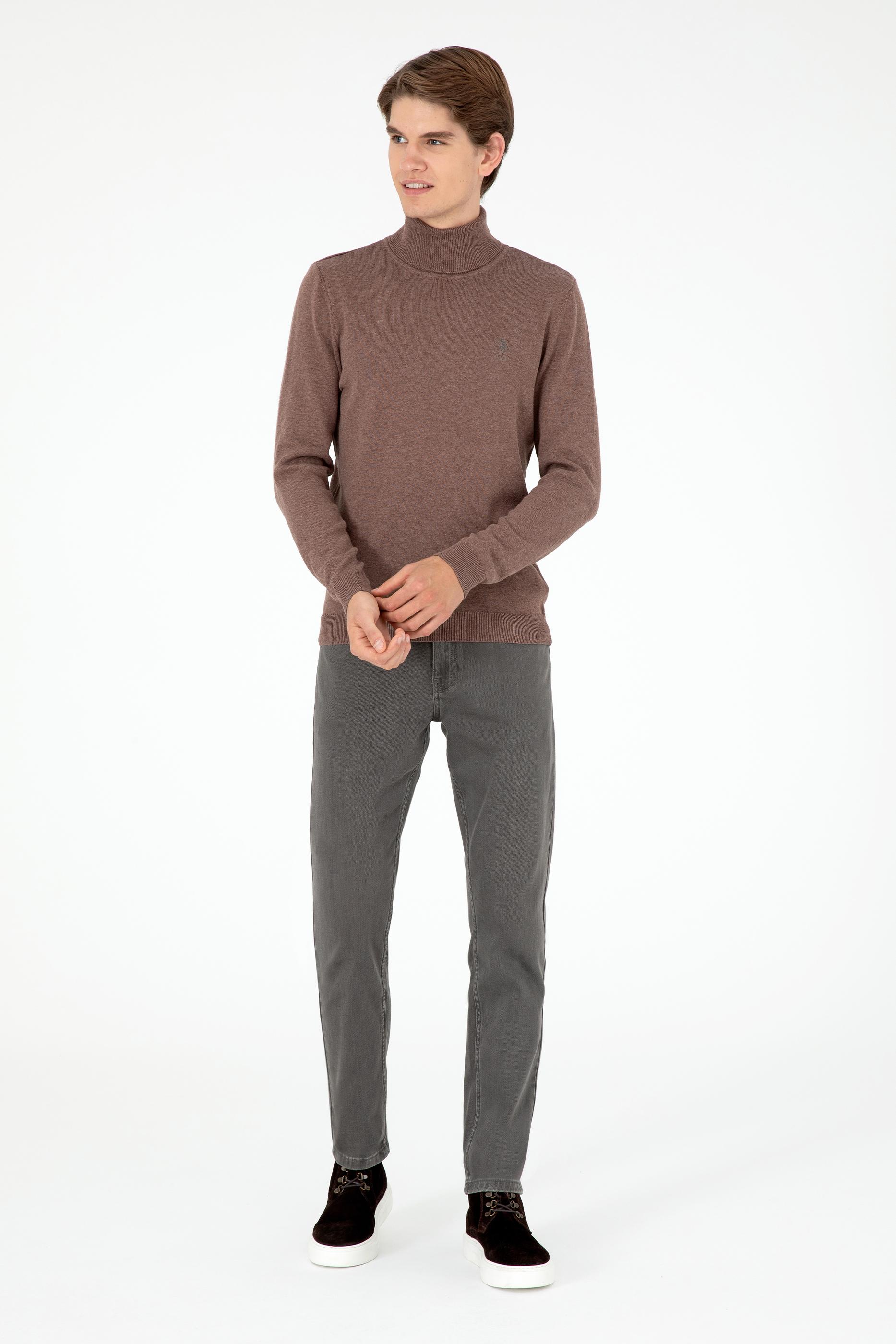 - Erkek Slim Fit Boğazlı Yaka Vizon Melanj Basic Kazak