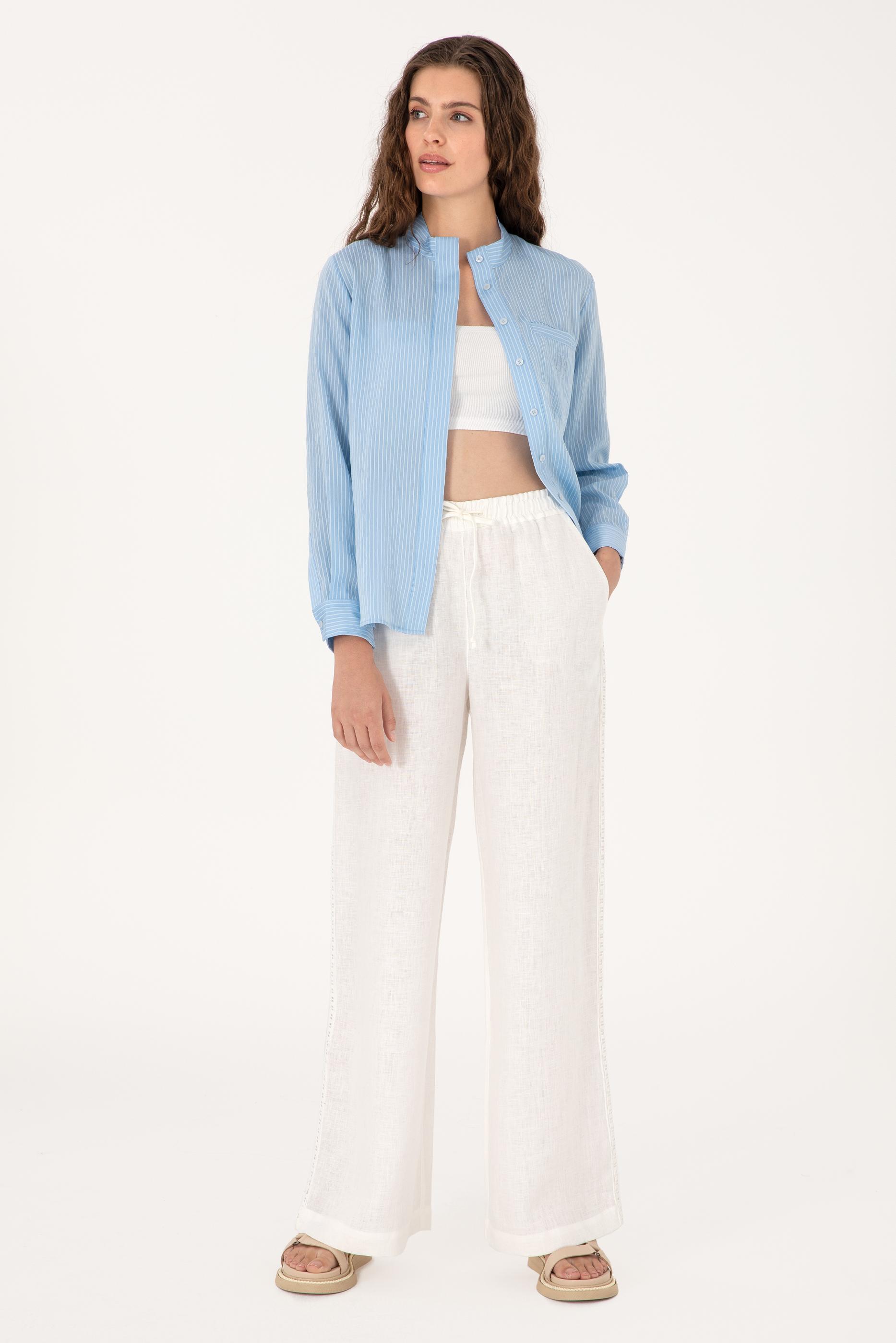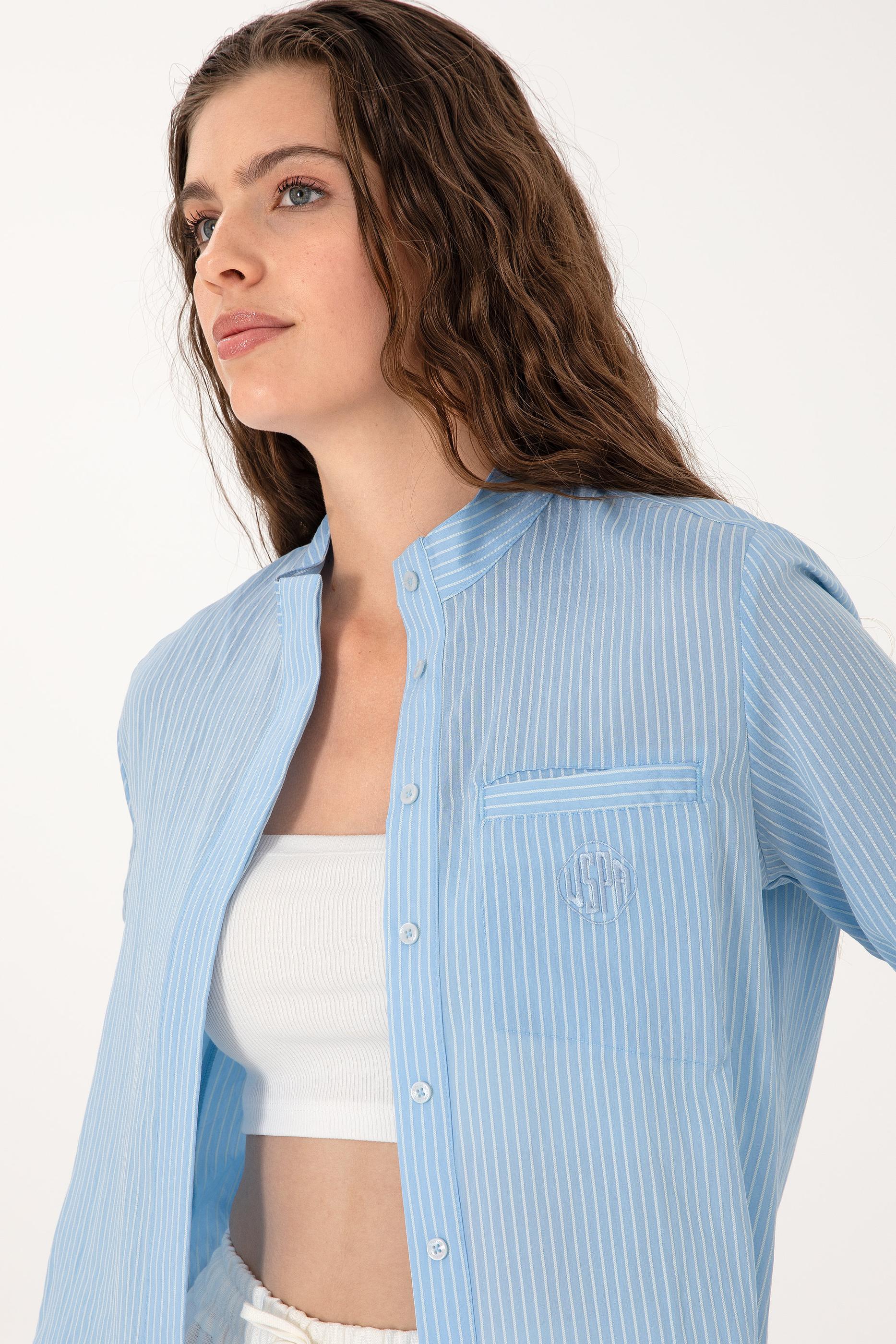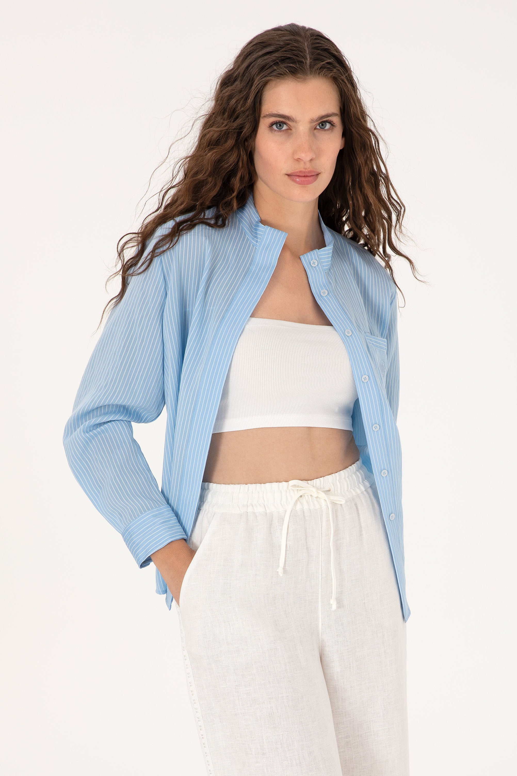 Kadın Açık Mavi Çizgili Uzun Kollu Gömlek