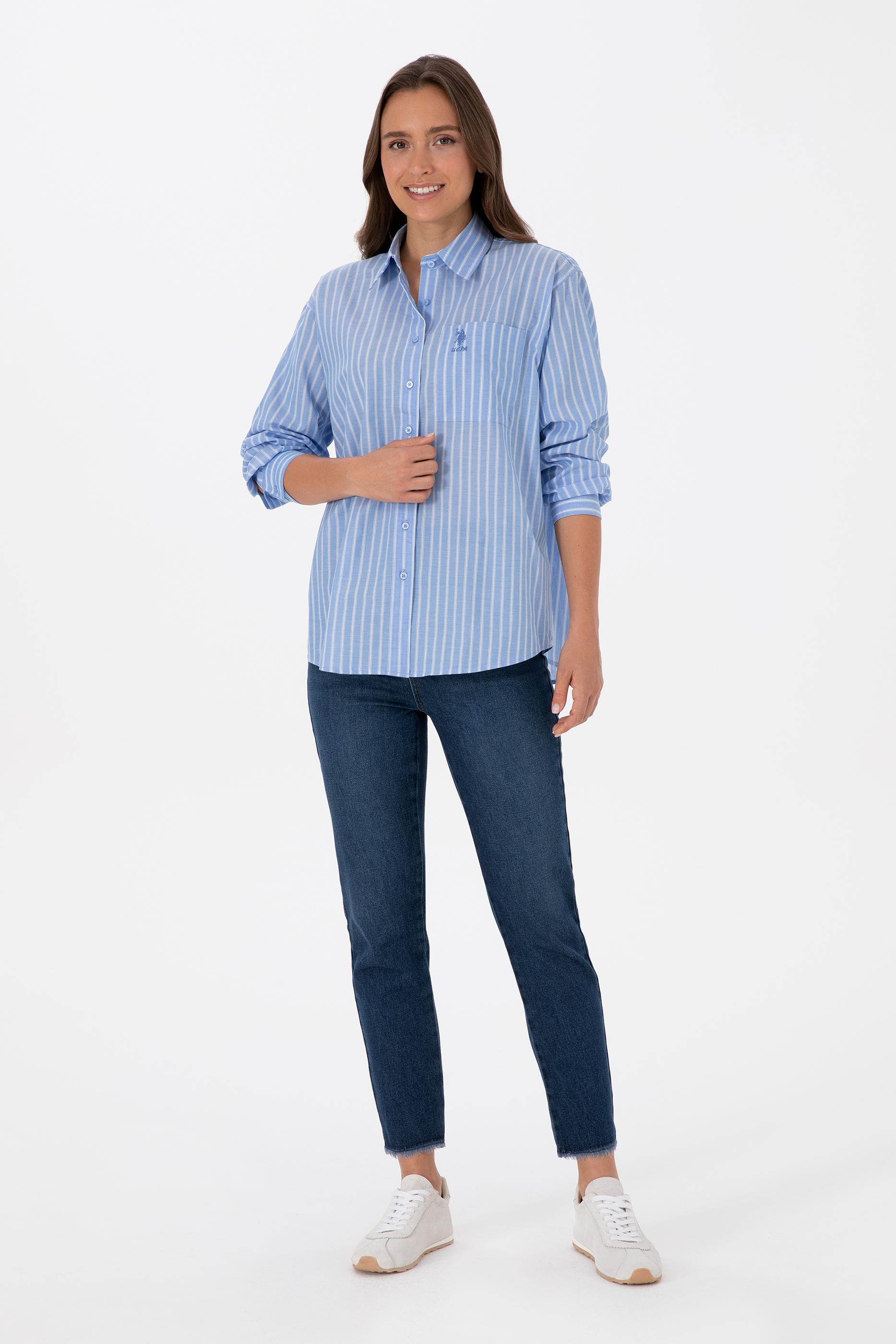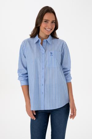 - Kadın Açık Mavi Çizgilli Uzun Kollu Gömlek