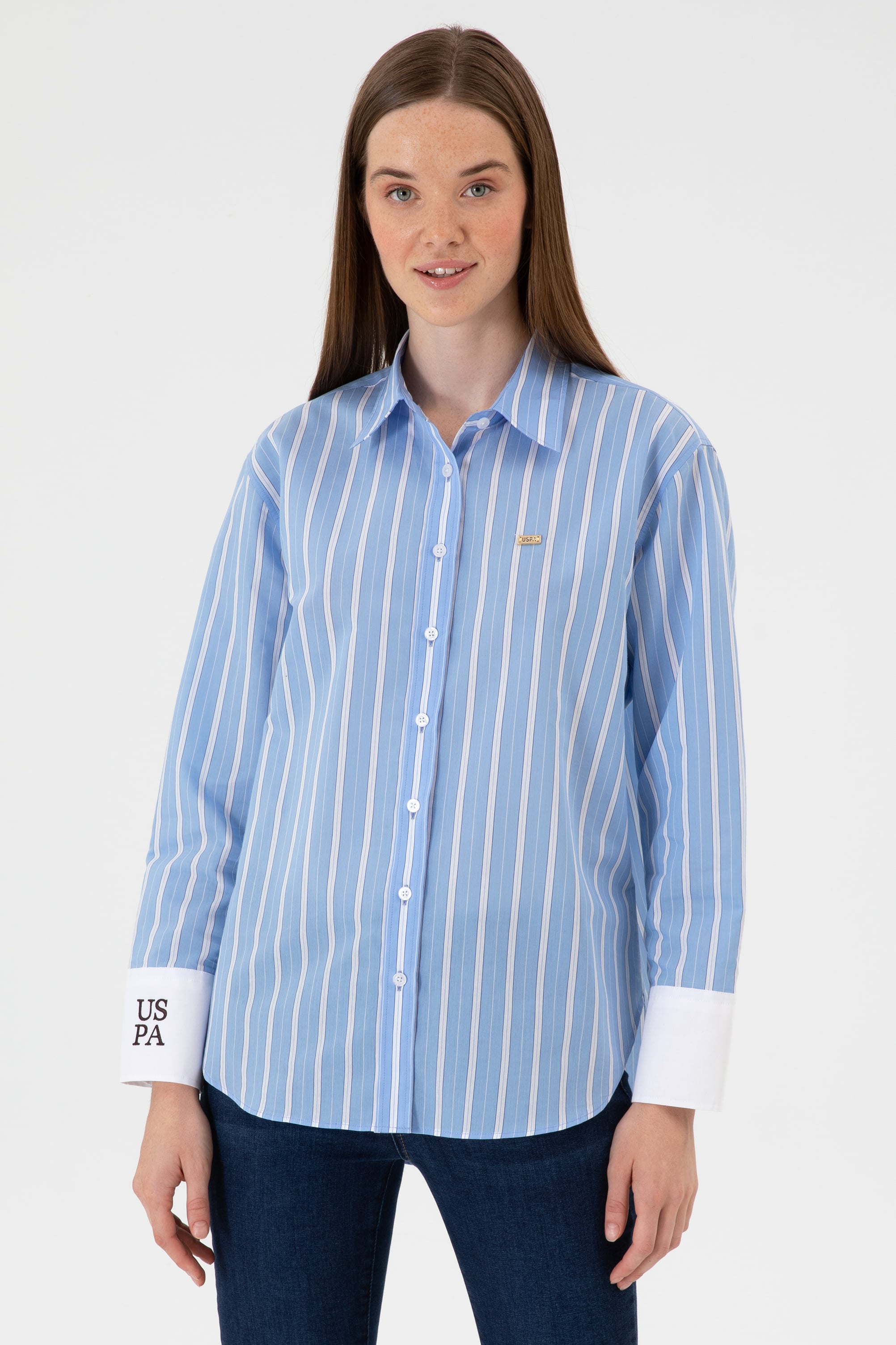 - Kadın Açık Mavi Çizgili Uzun Kollu Gömlek