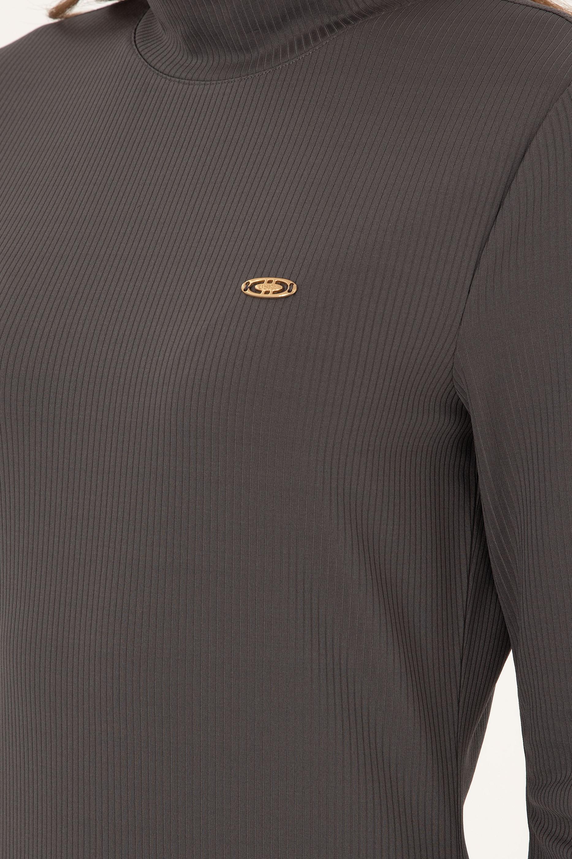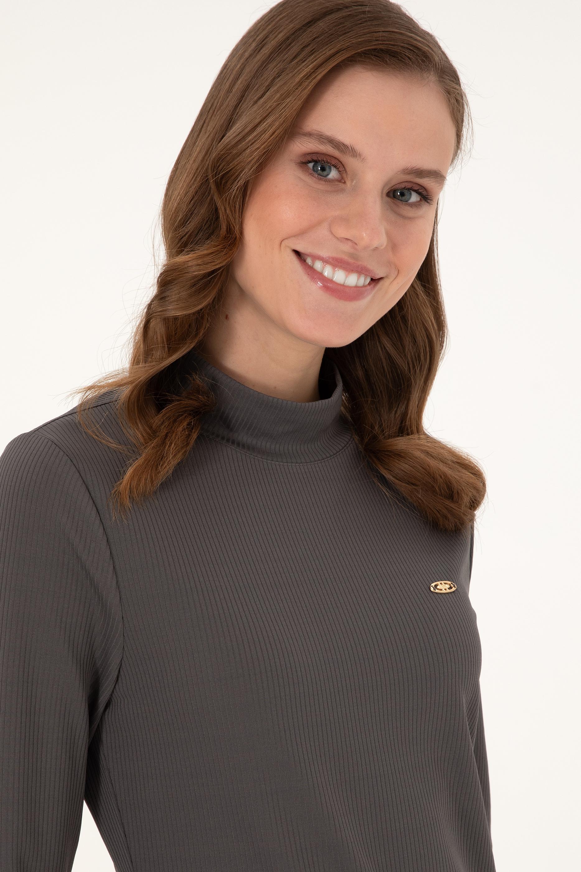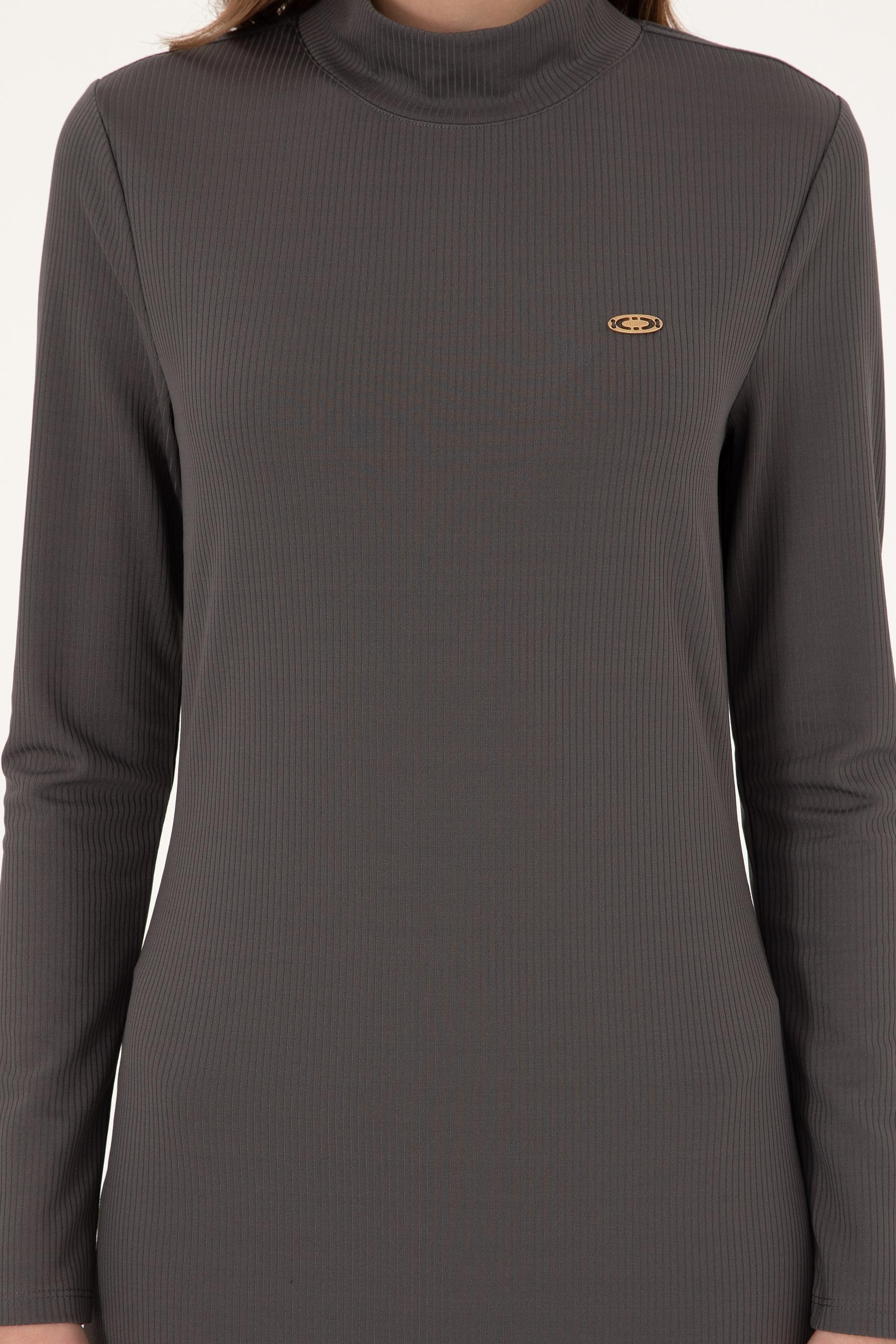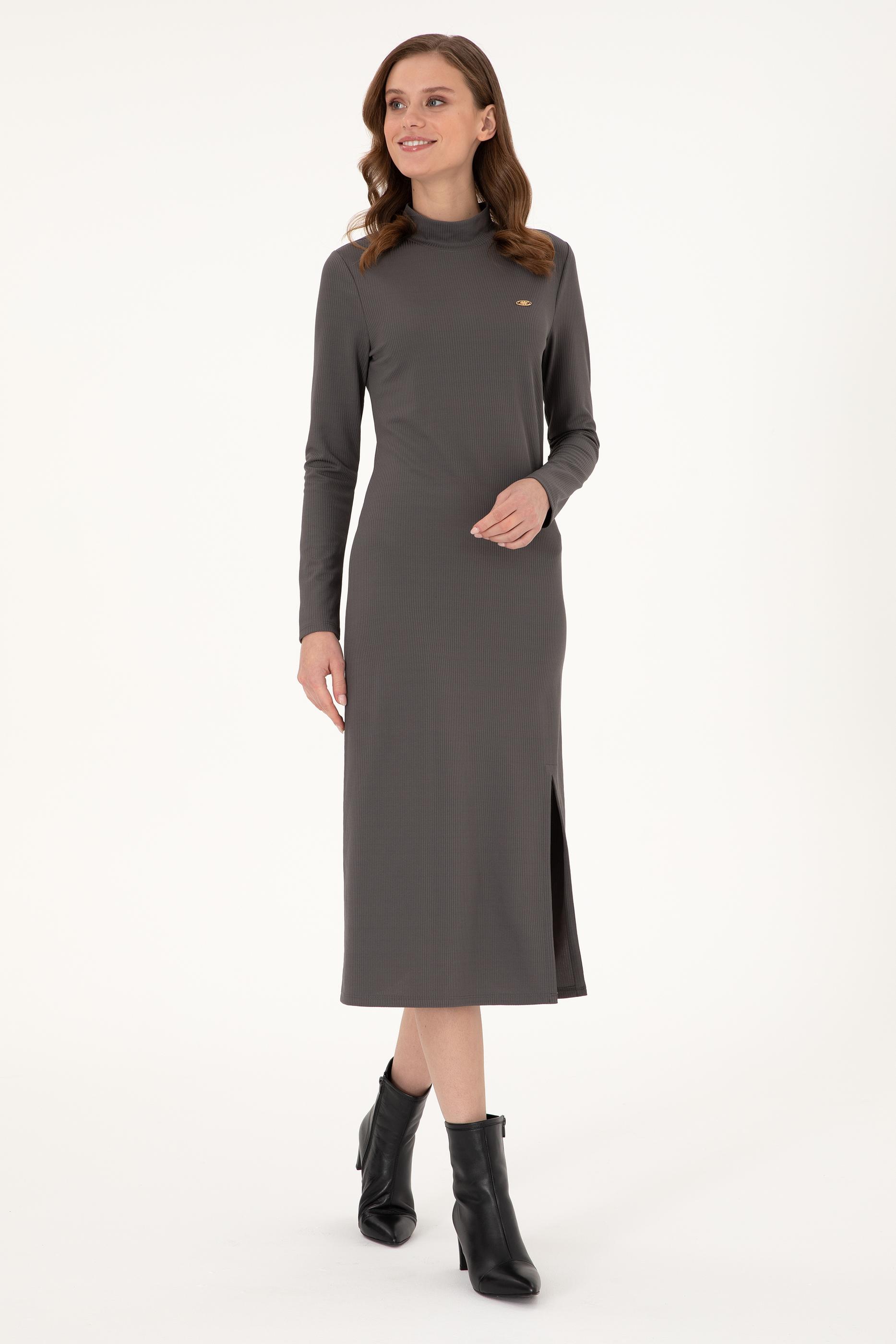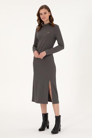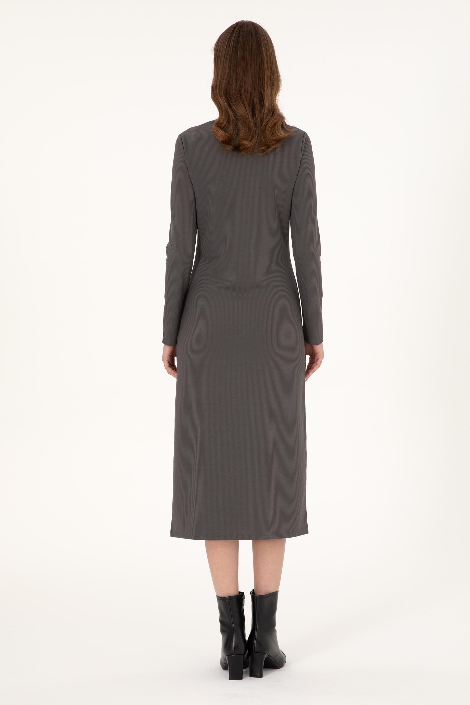 Kadın Antrasit Yırtmaçlı Dik Yaka Midi Boy Örme Elbise