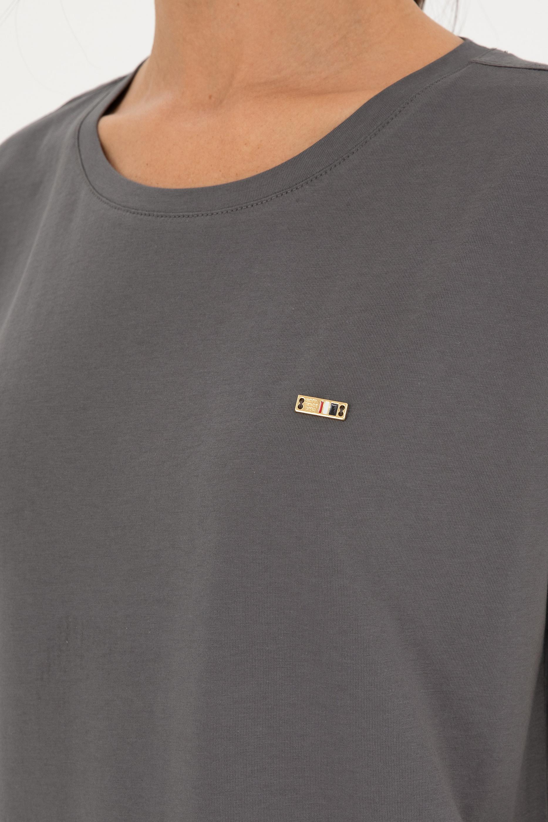 %100 pamuk kumaşı ile yumuşak ve nefes alabilir özellikler taşıyan tişört, modern bir tarz arayanlar için ideal bir tercihtir. Antrasit renginin sade duruşu, gardırobunuza yeni bir soluk getirir. Düz deseni ile minimalist bir tarz sunarken, bisiklet yaka ve kısa kol detayları günlük giyim için konfor sağlar. Crop top kesimi, yüksek bel pantolon veya şortlarla etkileyici bir görünüm yaratacak.