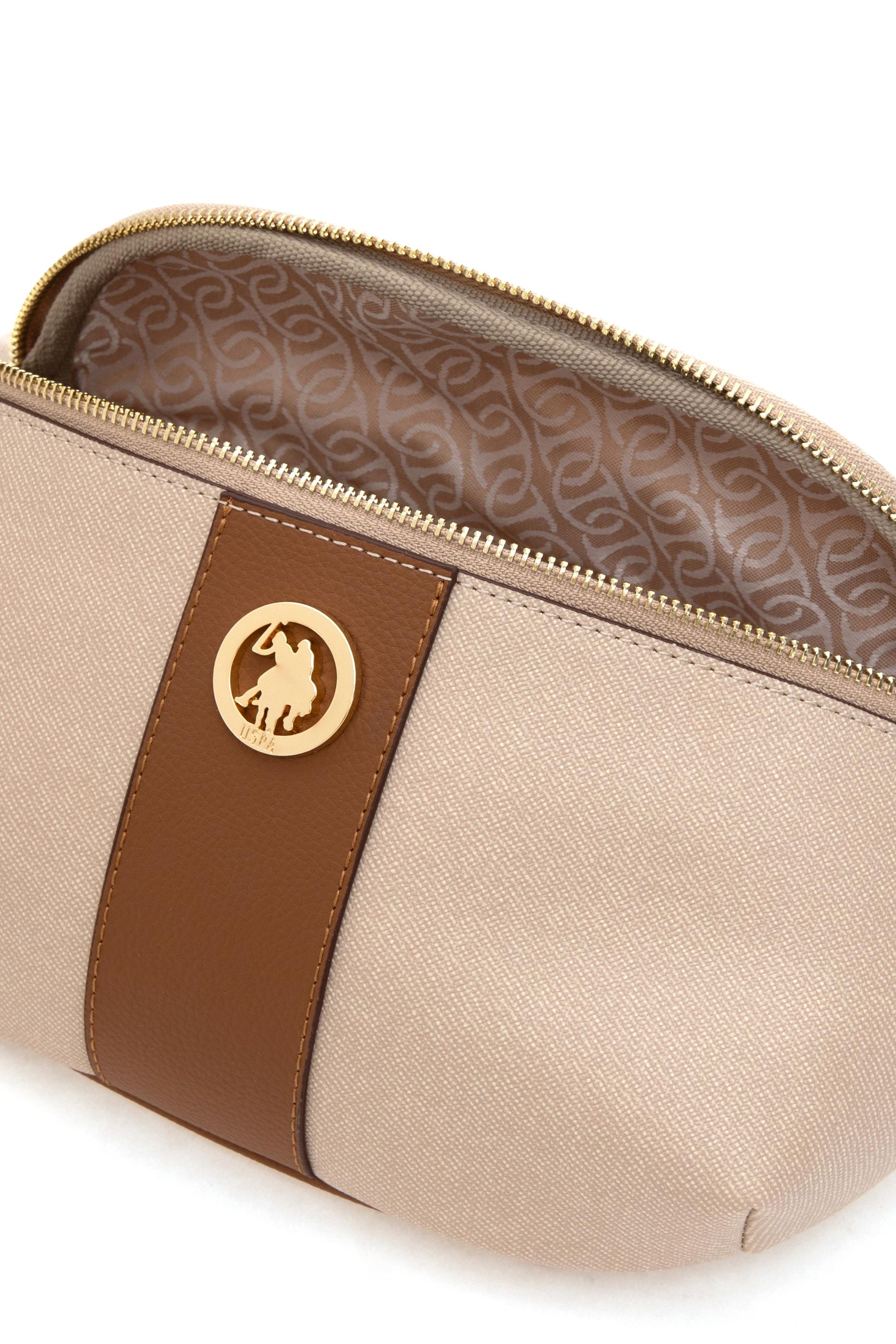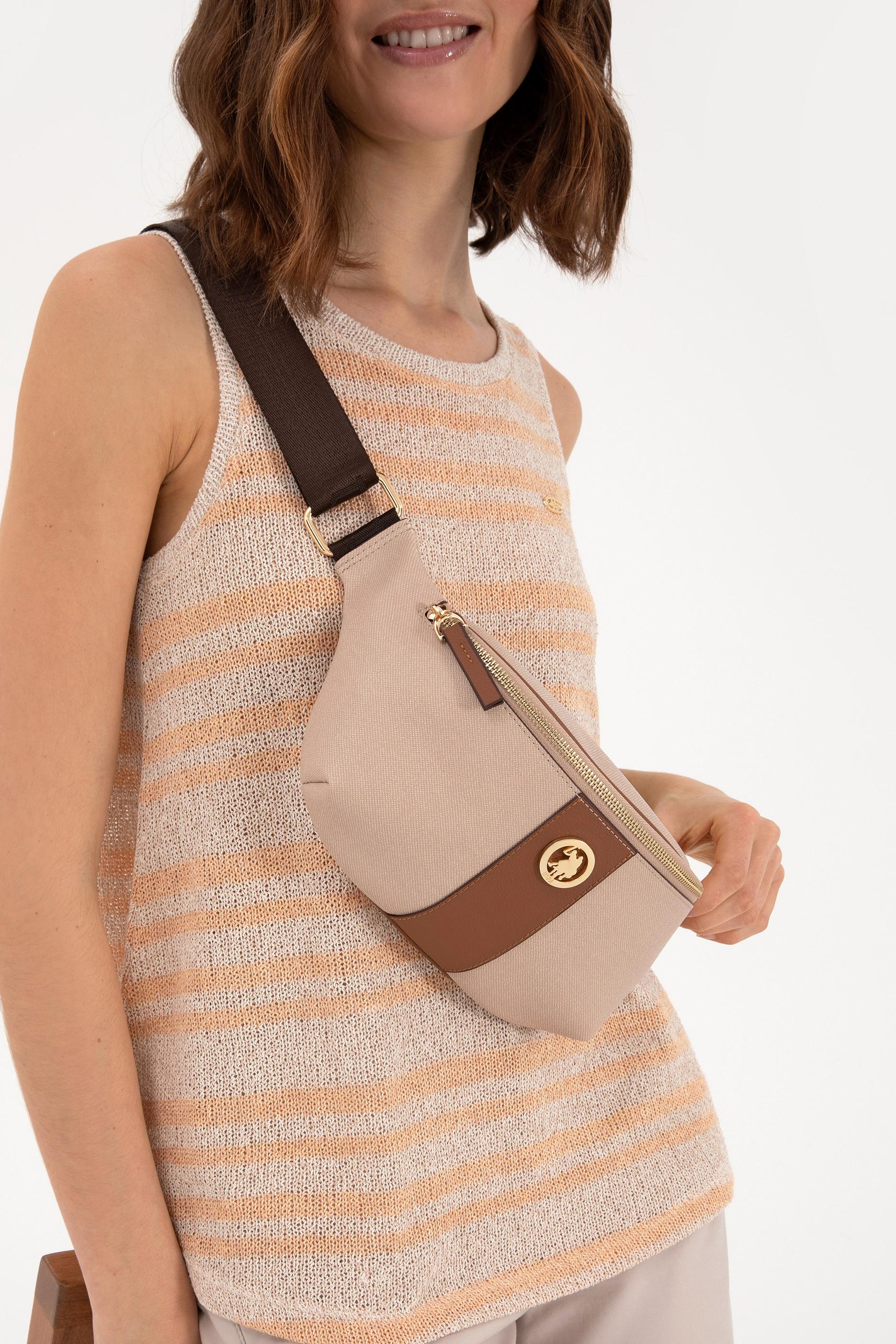 Oval formlu bu bej bel çantası, ön yüzeyindeki koyu renk şerit detayı ve altın renkli yuvarlak logosuyla sade şıklığı cesur bir kontrastla tamamlıyor. Tok duruşlu yapısı ve kaygan dokulu yüzeyi sayesinde formunu korur. Ayarlanabilir askısı belde ya da çapraz şekilde taşımaya uygundur. Fermuarlı ana bölme temel eşyalar için yeterli alan sağlarken, kombinlere sportif ama derli toplu bir hava katar. Modern şehir hayatında işlevselliği ve estetiği bir arada arayanlar için ideal bir parça.