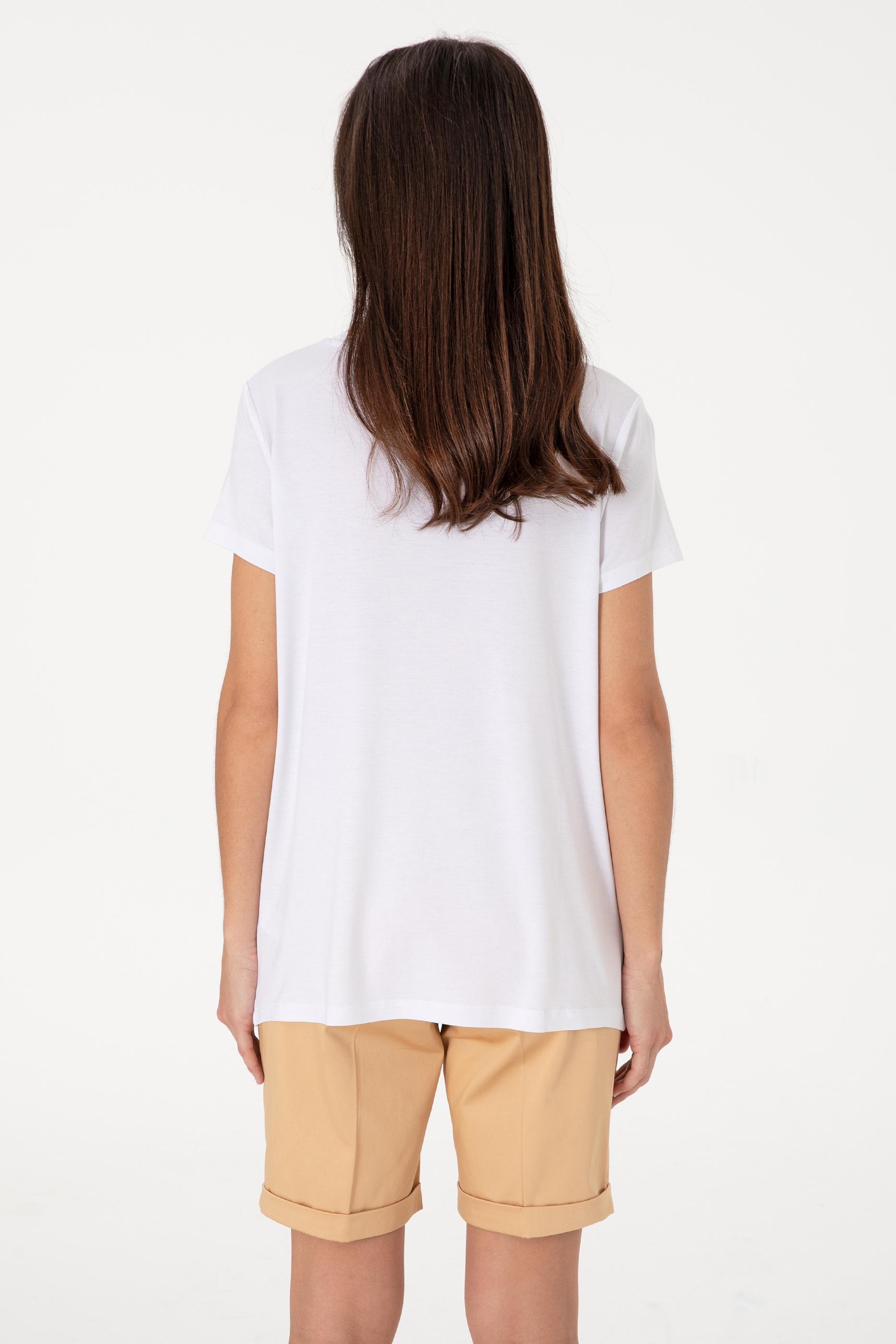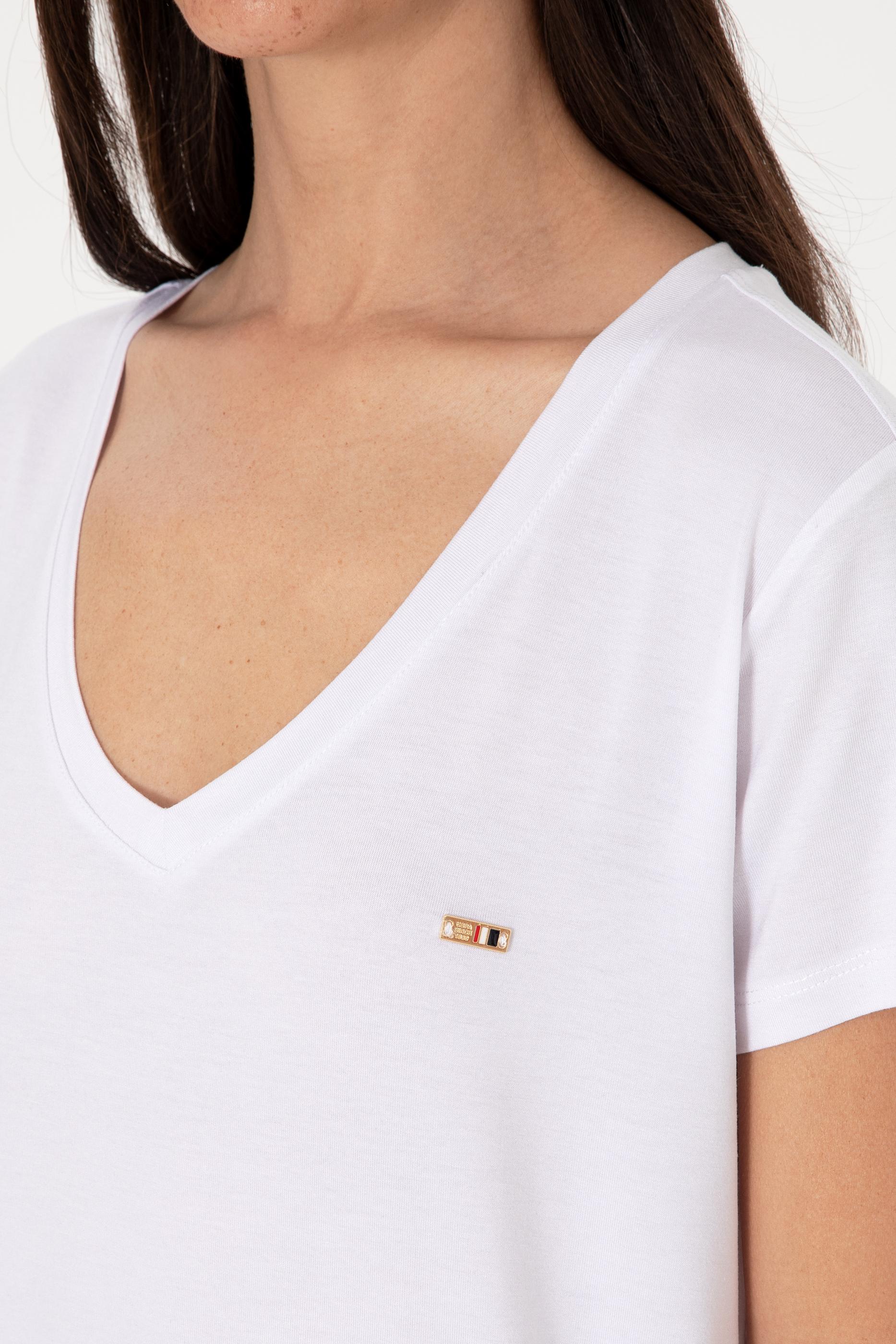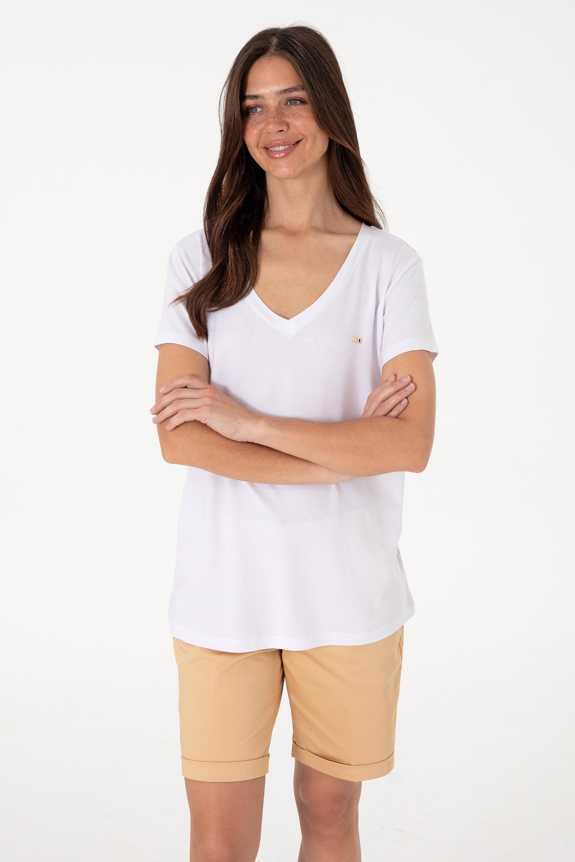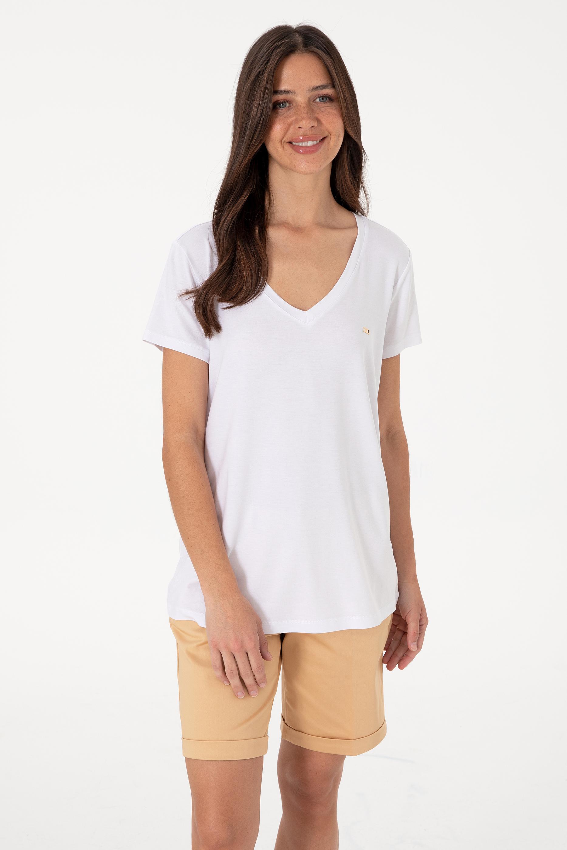 - Kadın Beyaz Modal Karışımlı V Yaka Basic Tişört