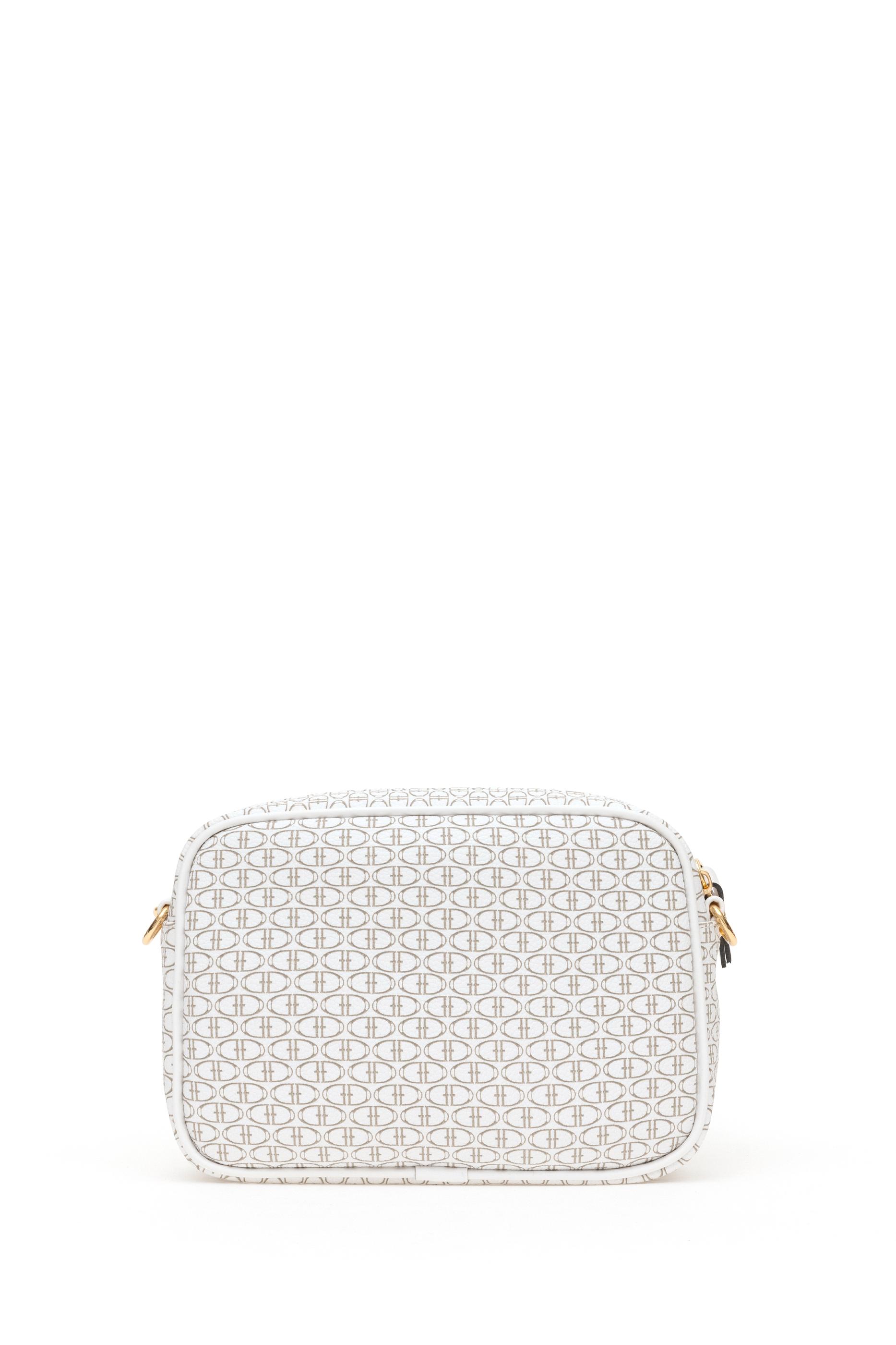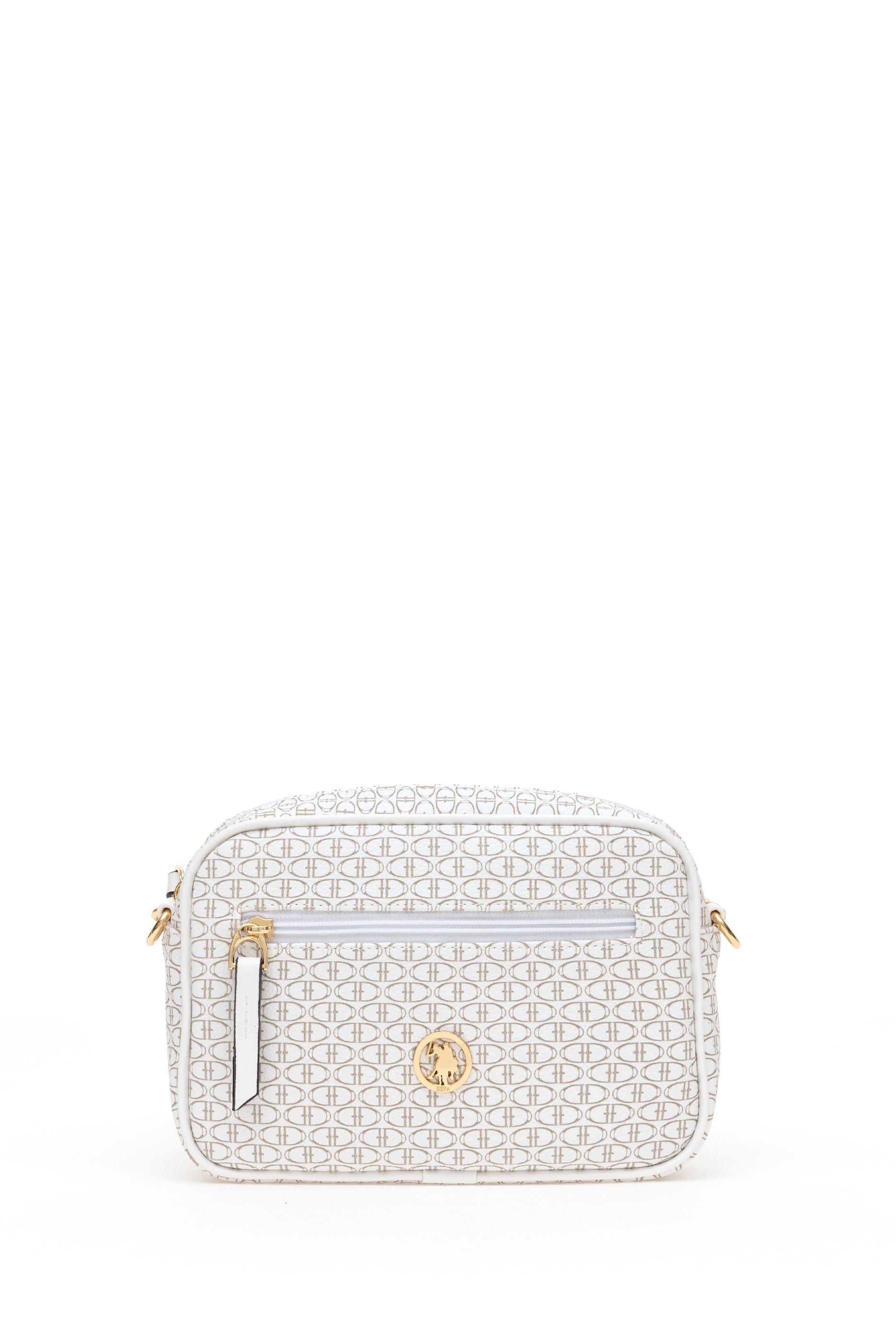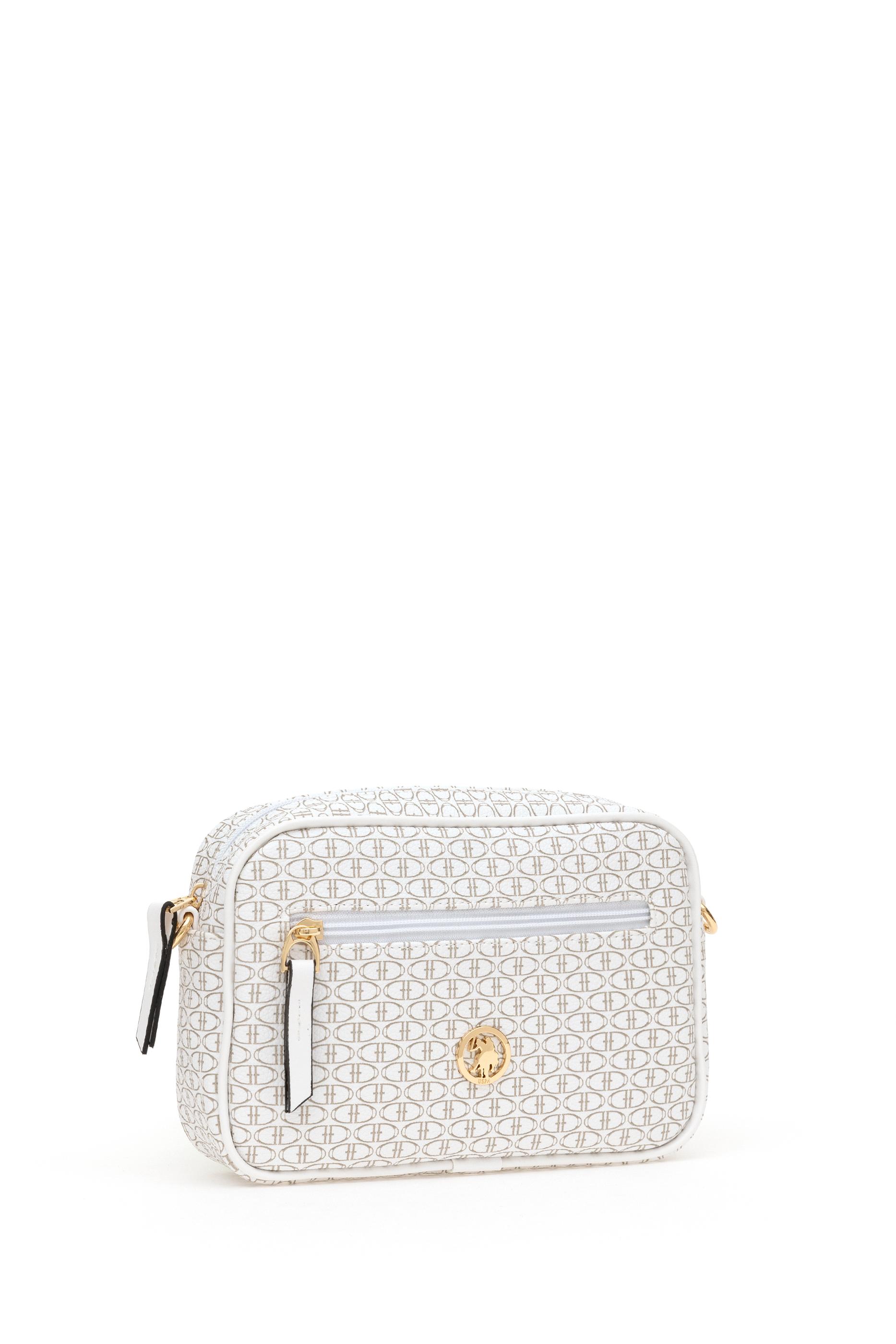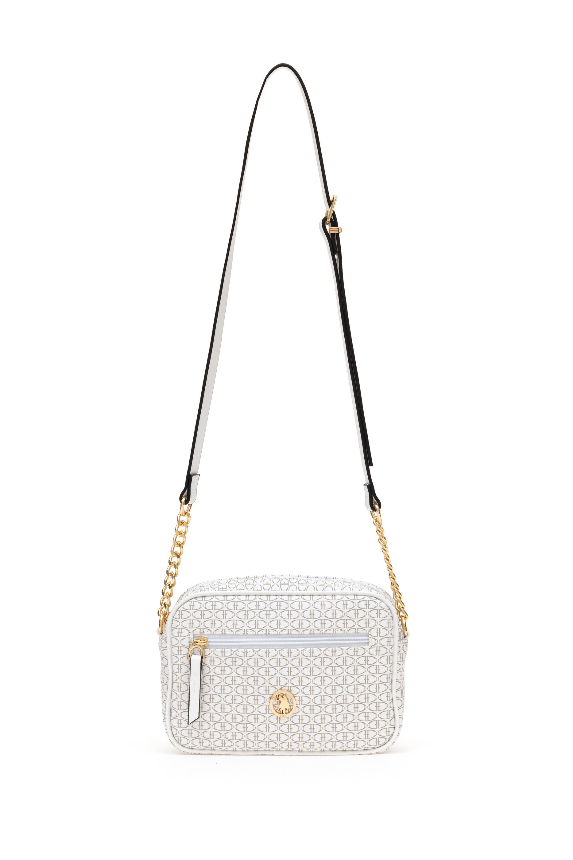 Dikdörtgen formu ve kompakt ölçüleriyle öne çıkan bu beyaz çapraz çanta, üzerindeki monogram desen yüzeyiyle sofistike bir duruş sergiler. Altın tonlu zincir detaylı ayarlanabilir askısı hem zarafet hem konfor sunar. Ön kısmındaki fermuarlı mini cep ekstra kullanım kolaylığı sağlarken, ana bölme günlük temel eşyaları taşımaya yeterlidir. Koyu bej ve açık tonların kontrastıyla hareketlenen tasarımı, şehir stiline modern ve kullanışlı bir dokunuş katar.
