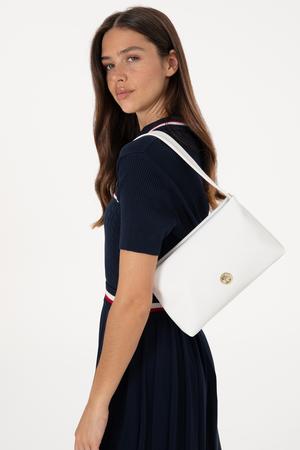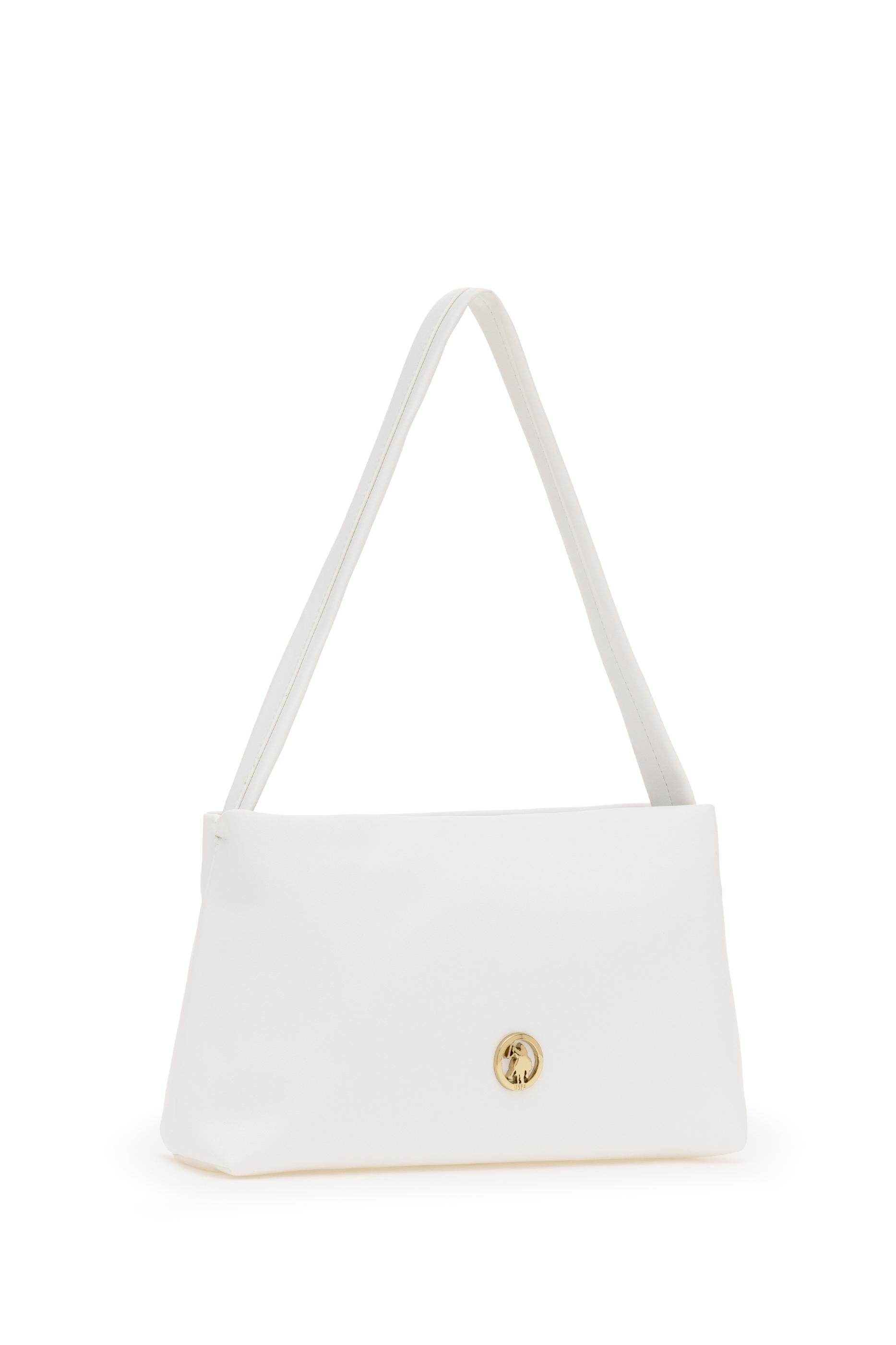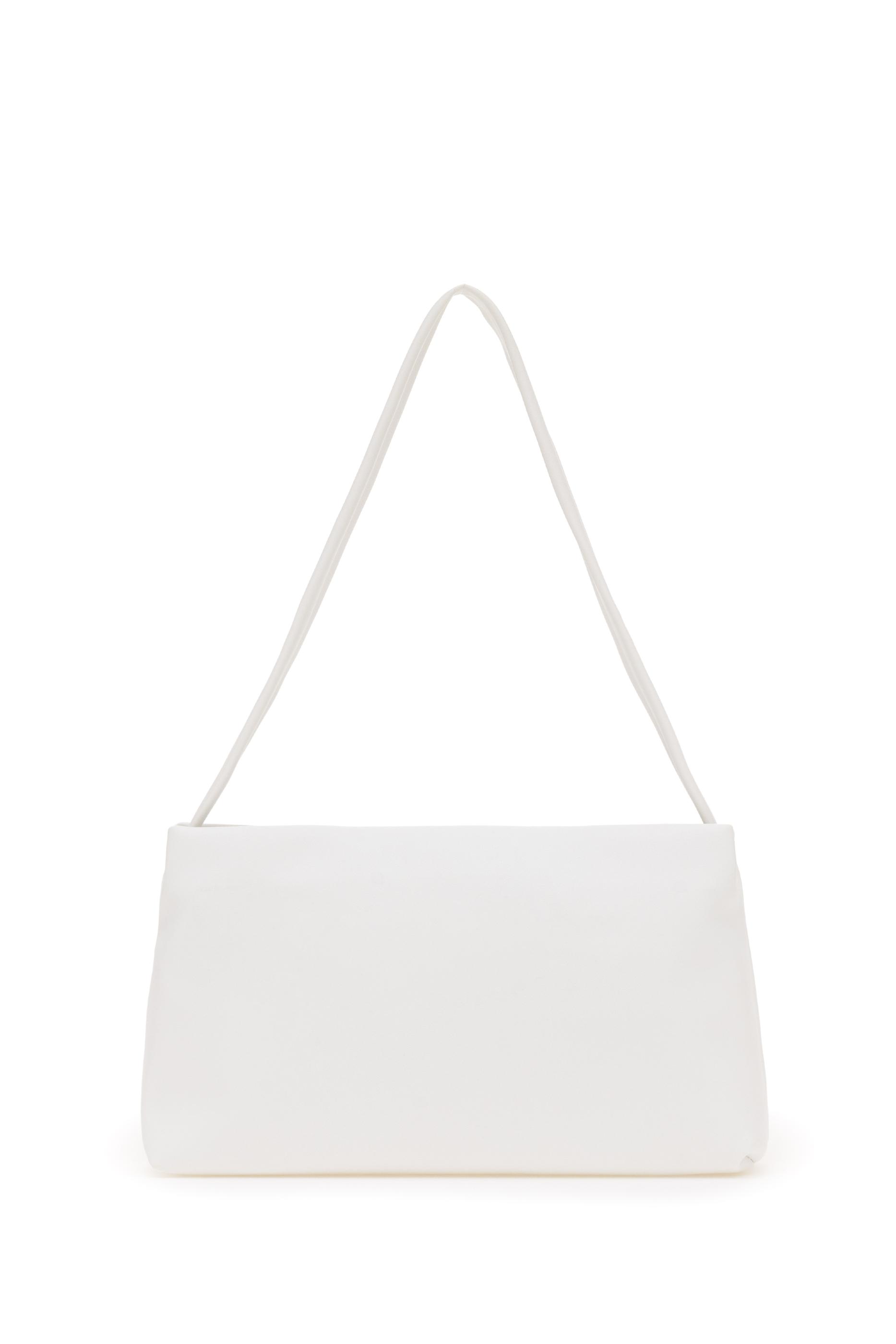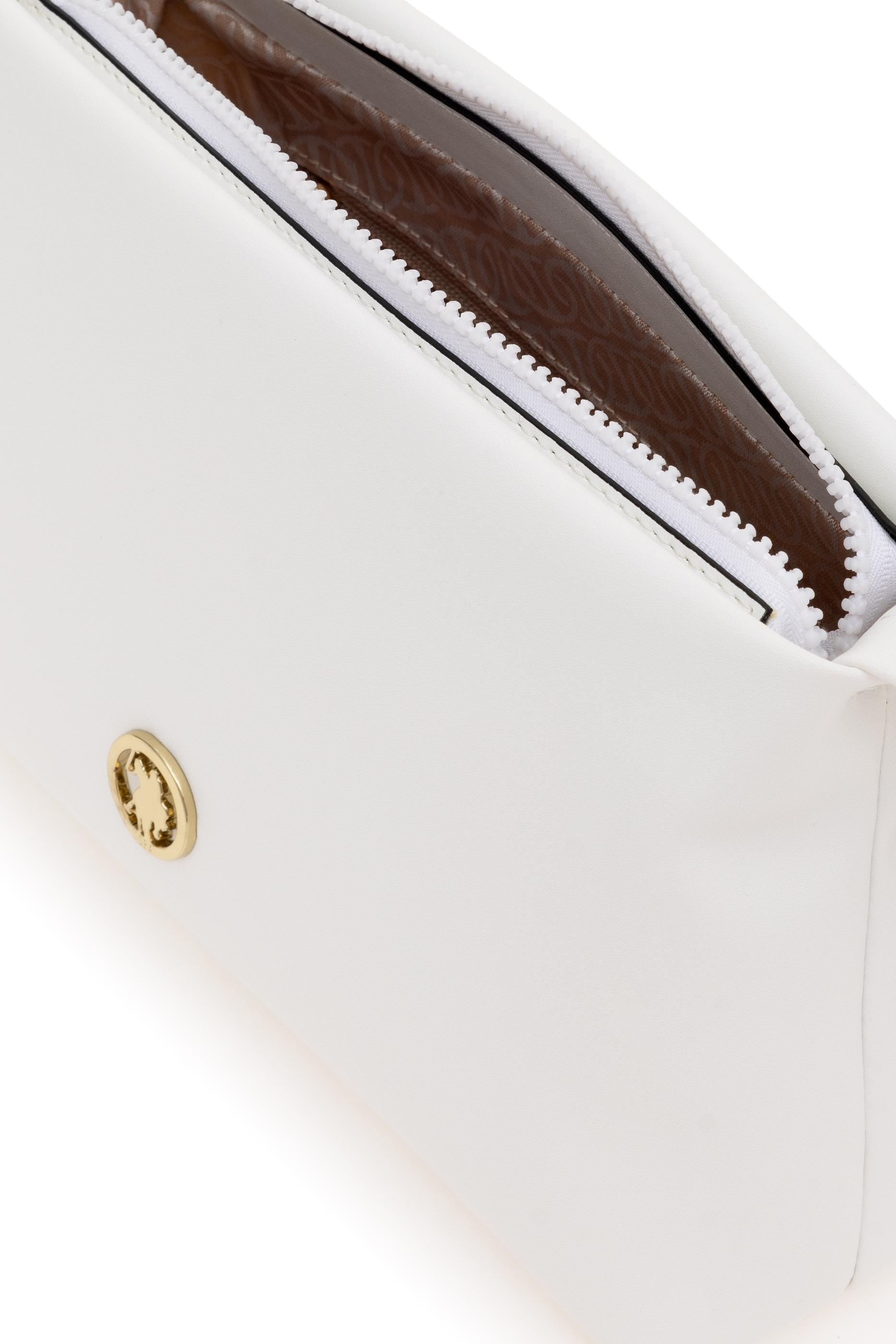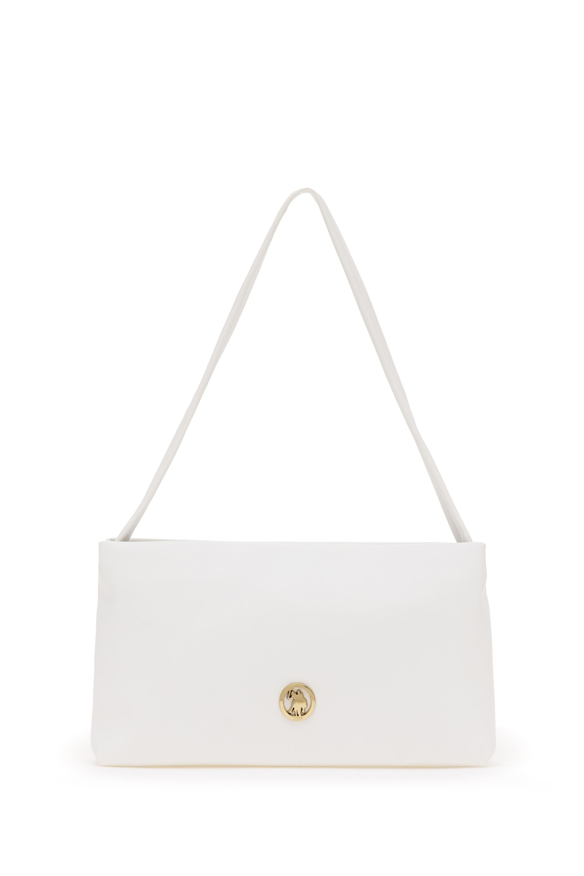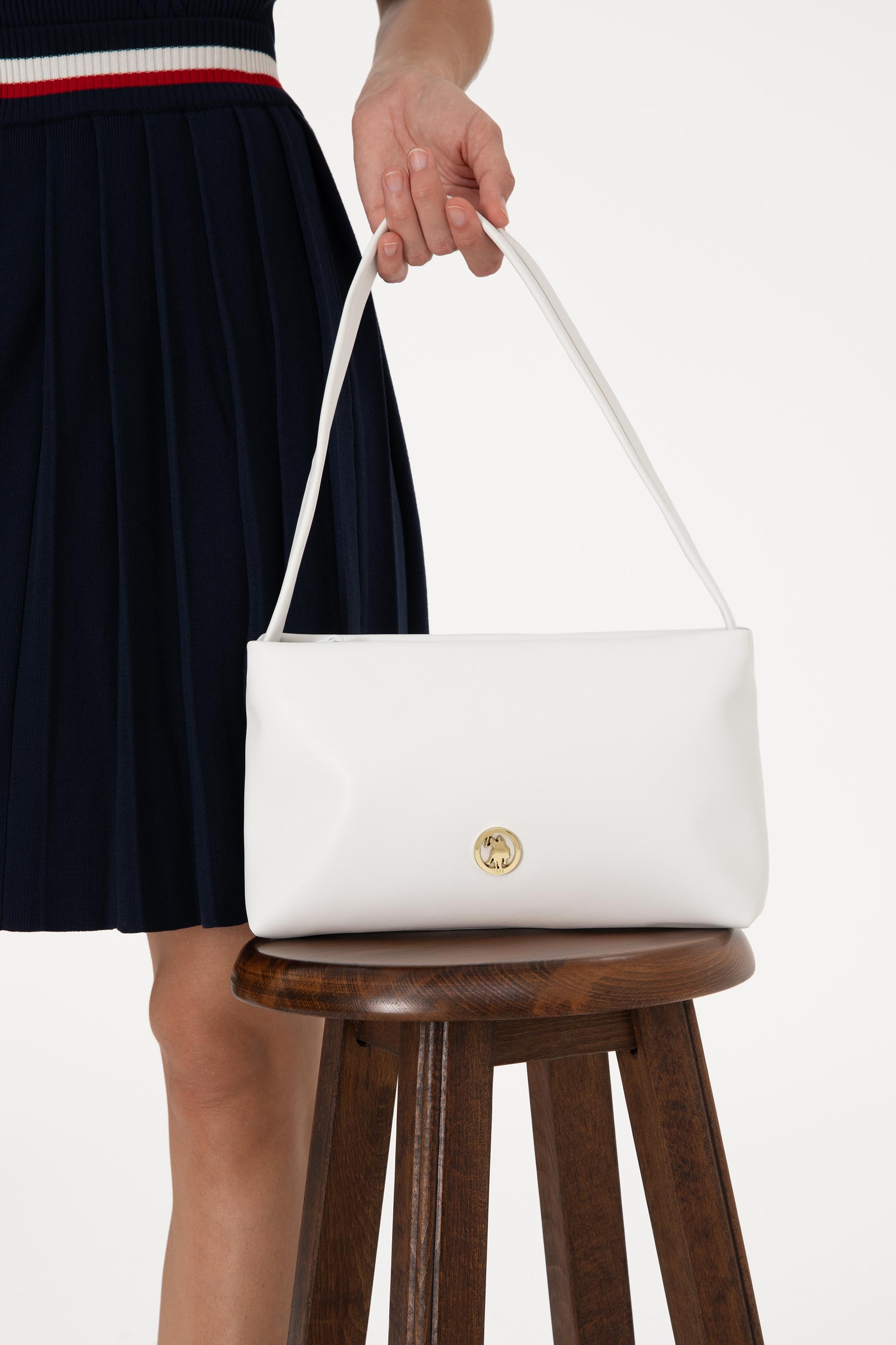 Yumuşak ve pürüzsüz yüzeyiyle sade şıklık sunan bu beyaz kol çantası, dikdörtgen formu sayesinde elde ya da omuzda taşımaya uygundur. Tek bölmeli yapısı günlük kullanımda pratiklik sağlarken, ortadaki altın renkli yuvarlak logo detayı modern bir dokunuş katar. Zamansız rengi ve zarif tasarımıyla her kapsül dolapta mutlaka yer alması gereken güçlü bir tamamlayıcıdır.