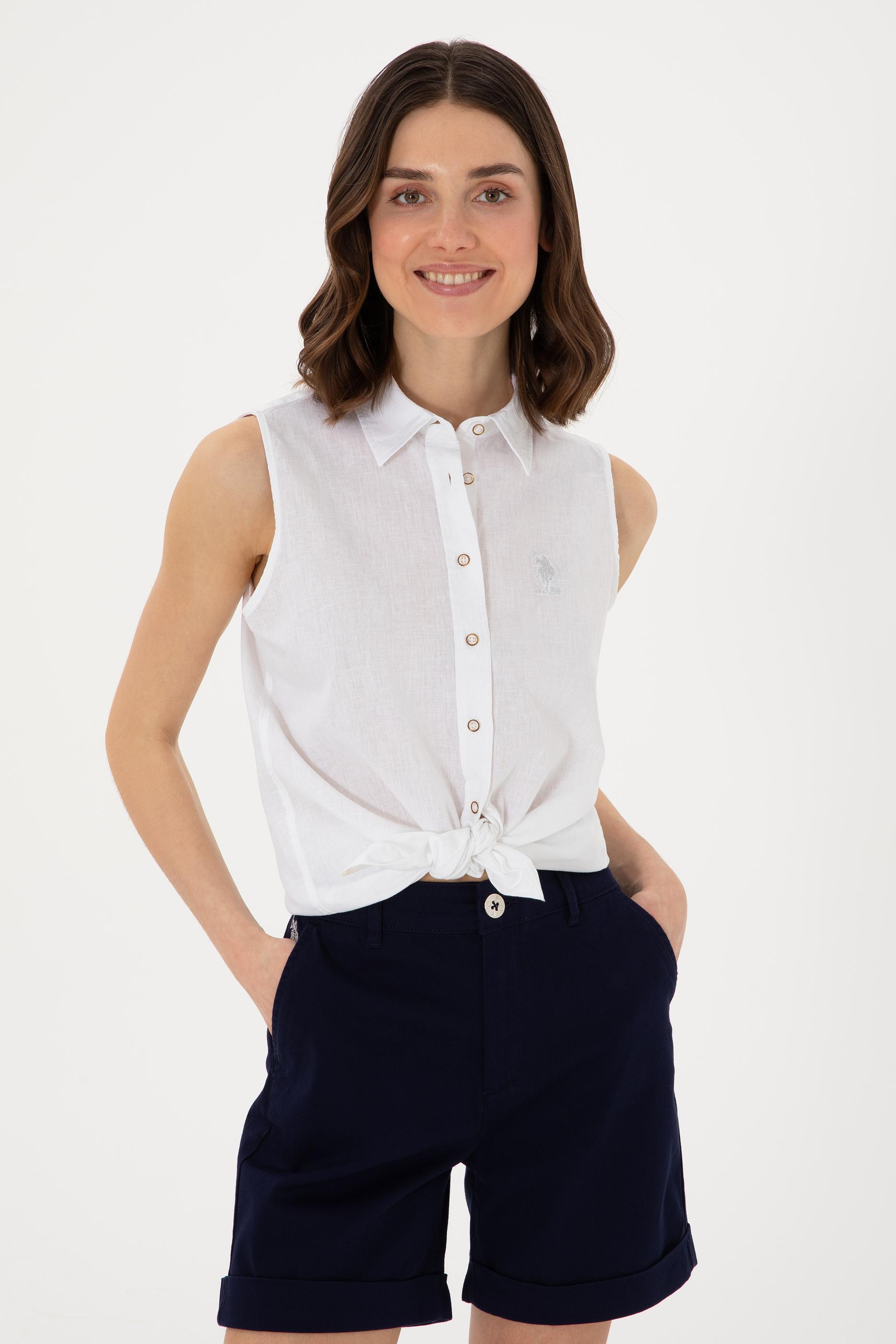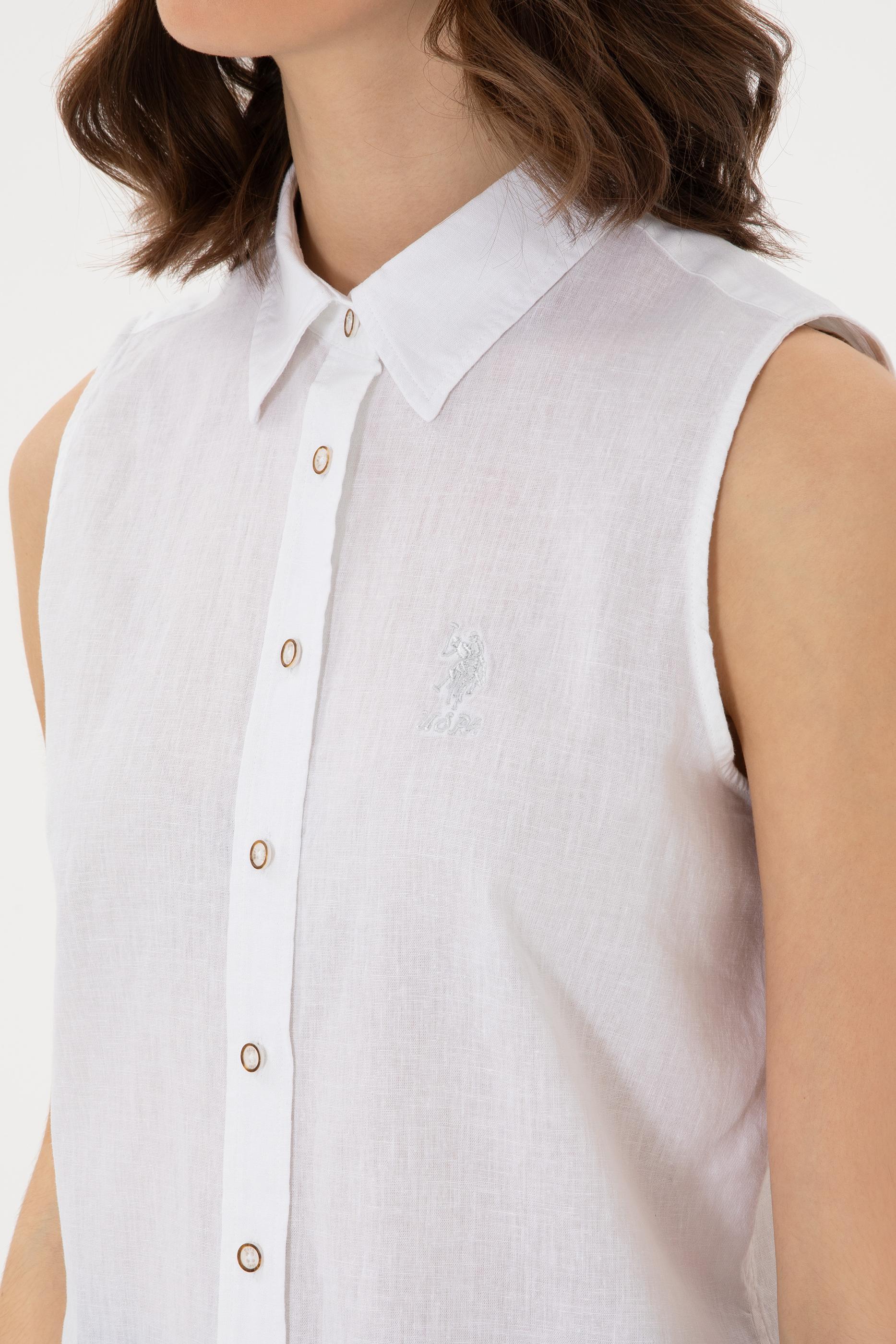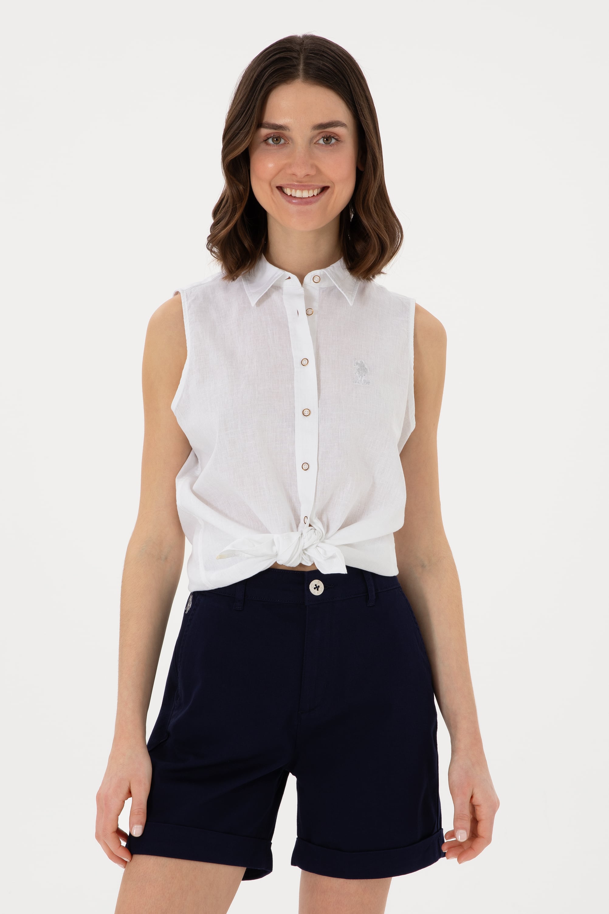 - Kadın Beyaz Keten Karışımlı Kısa Kollu Gömlek
