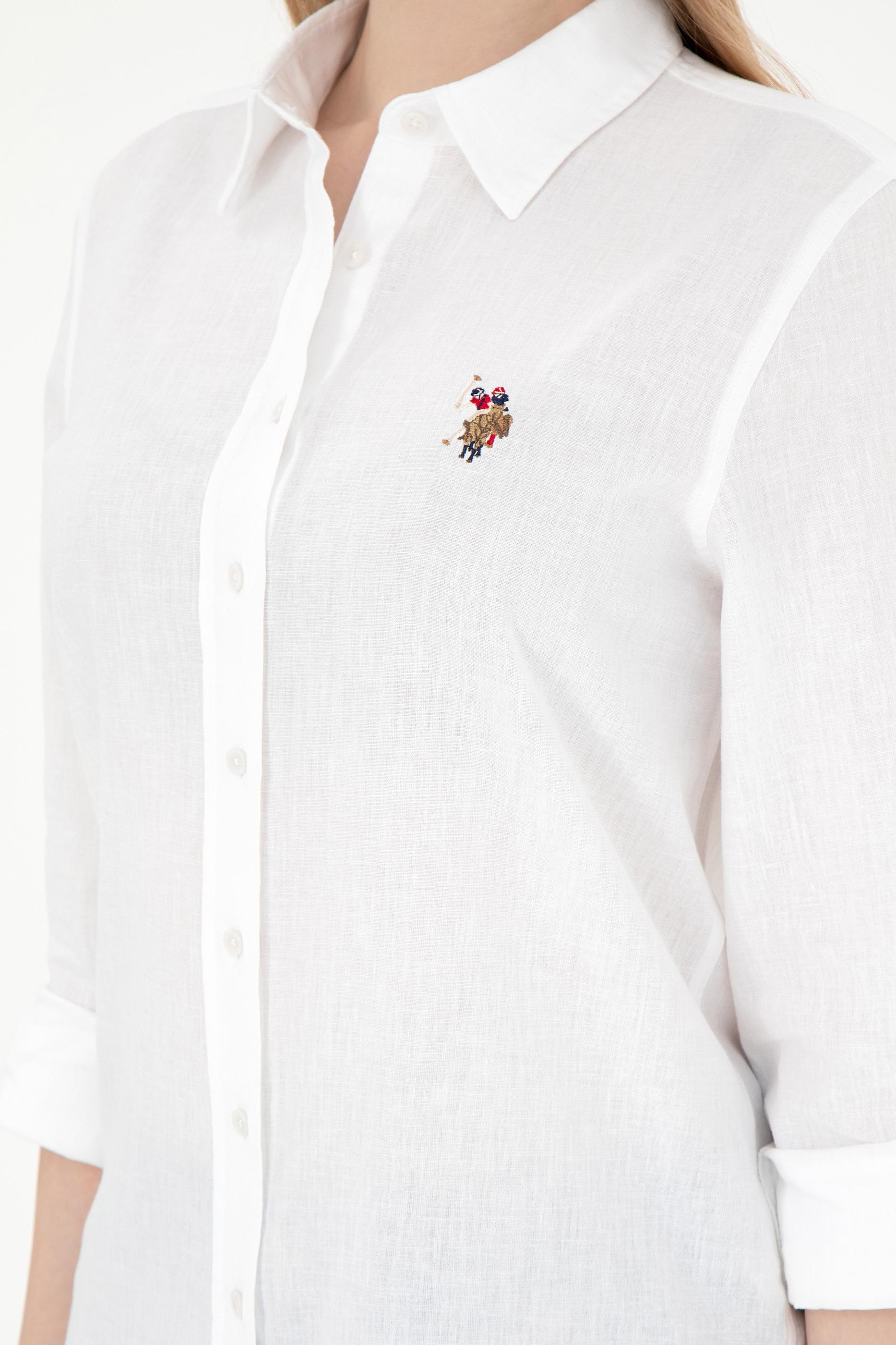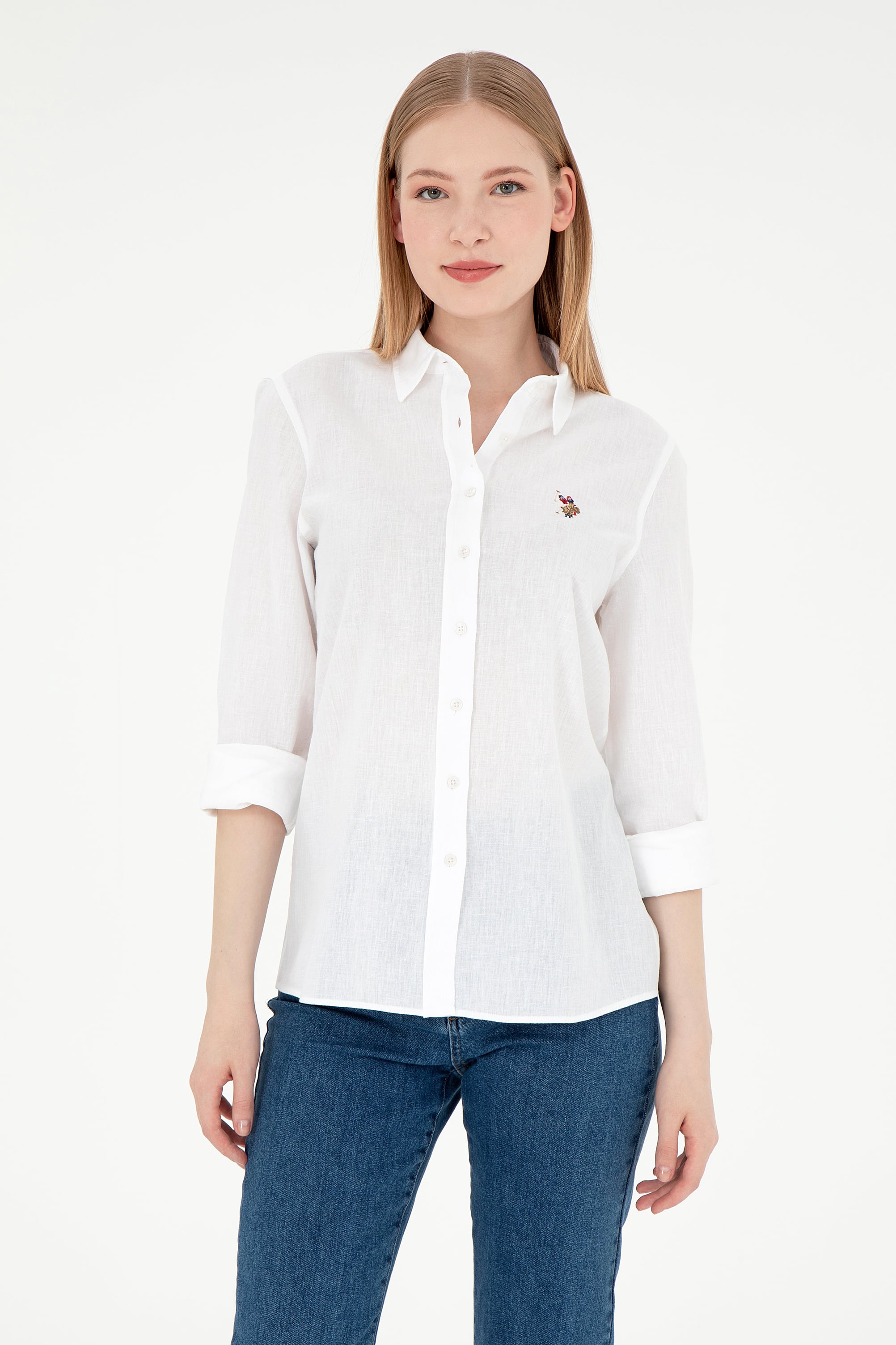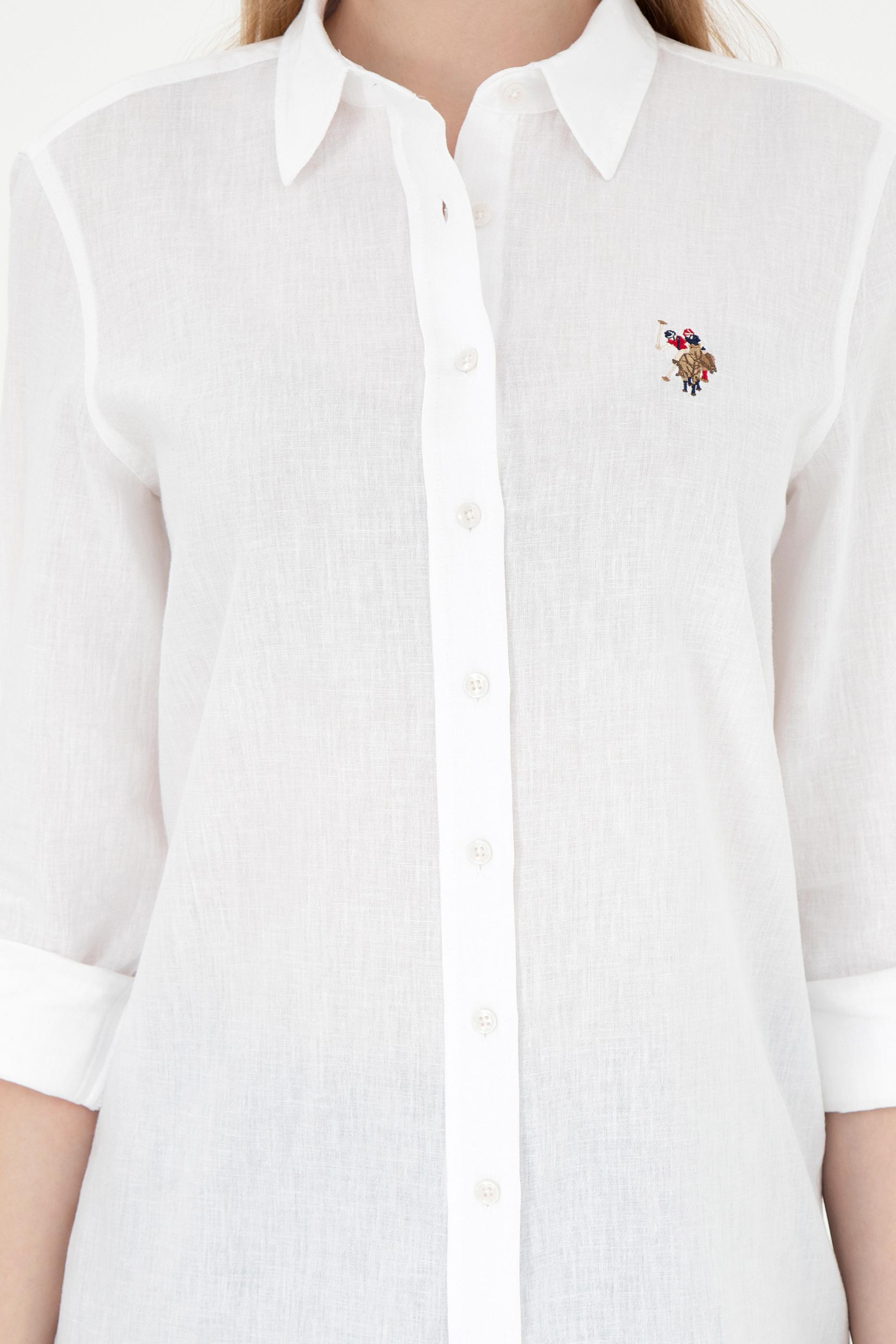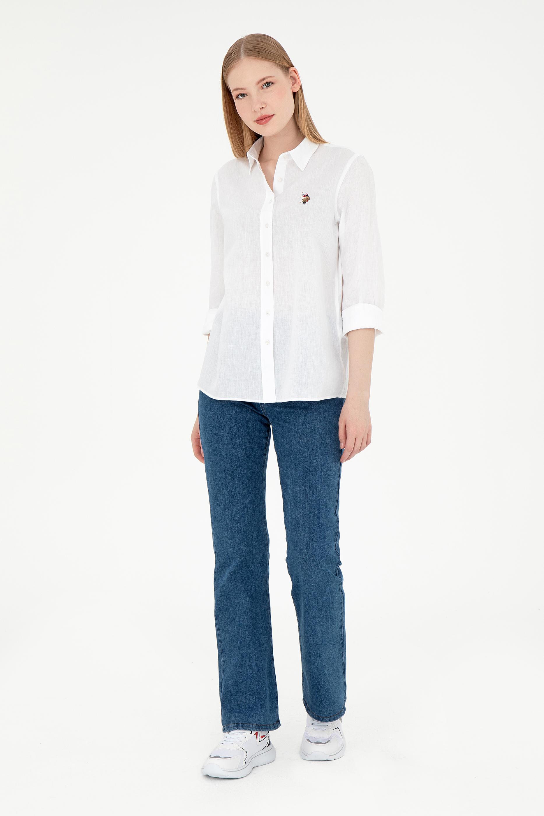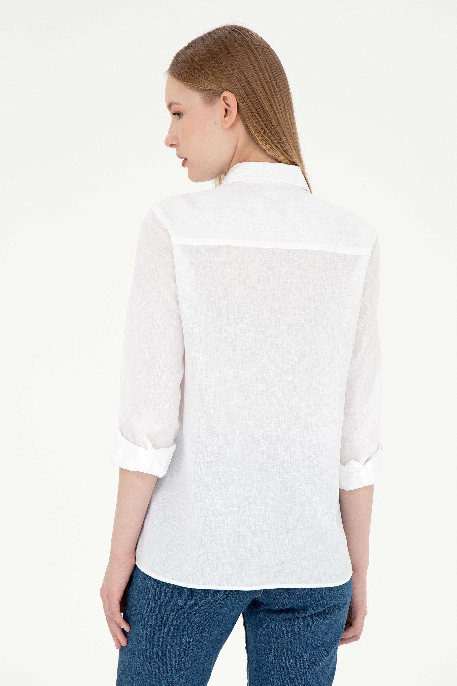 Kadın Beyaz Keten Karışımlı Uzun Kollu Basic Gömlek